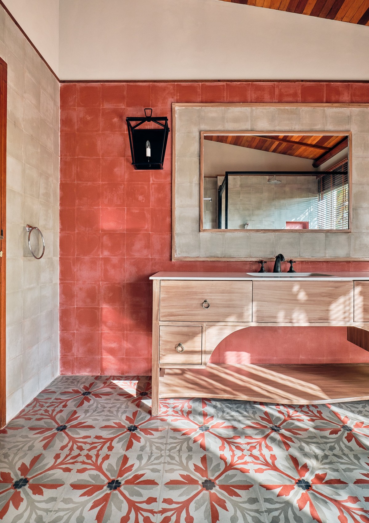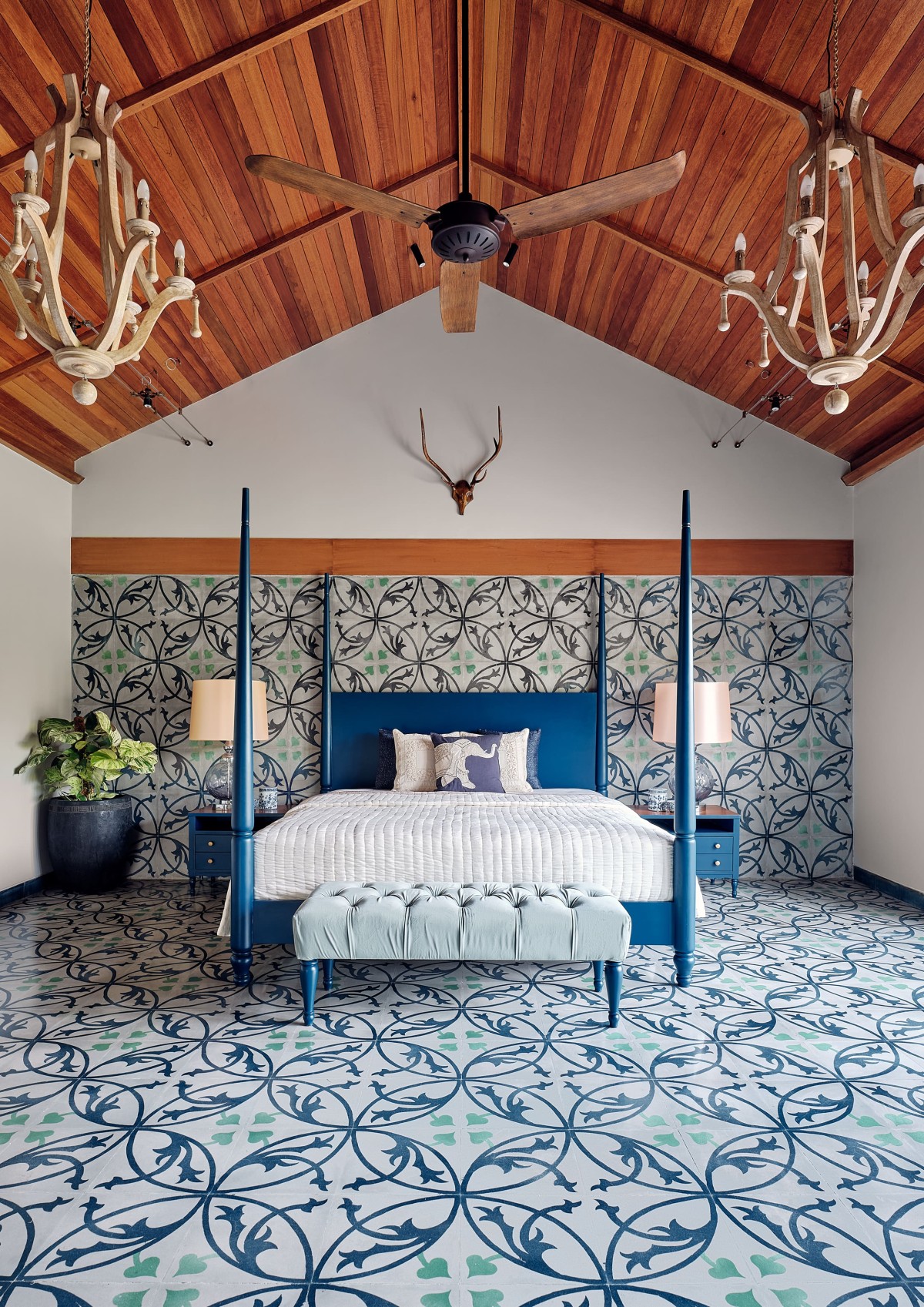 cement pattern tile in blue, green and grey also wraps behind the bed making it