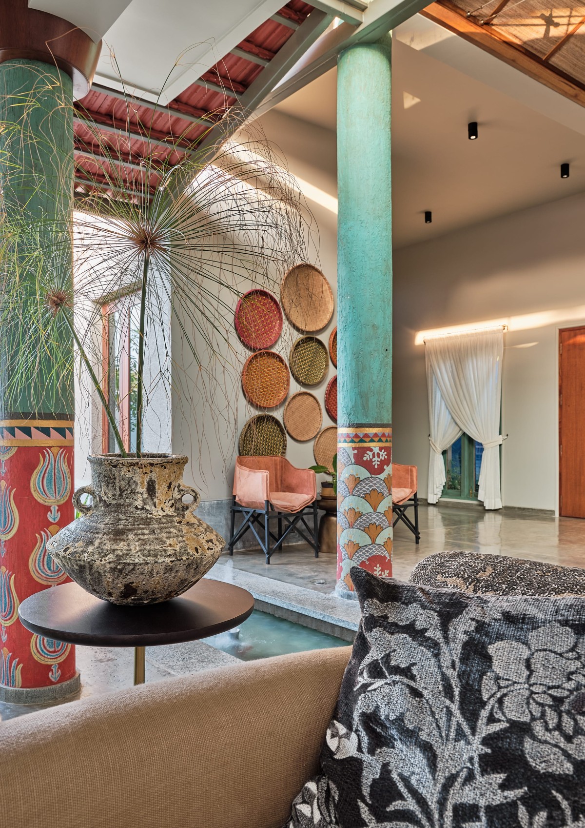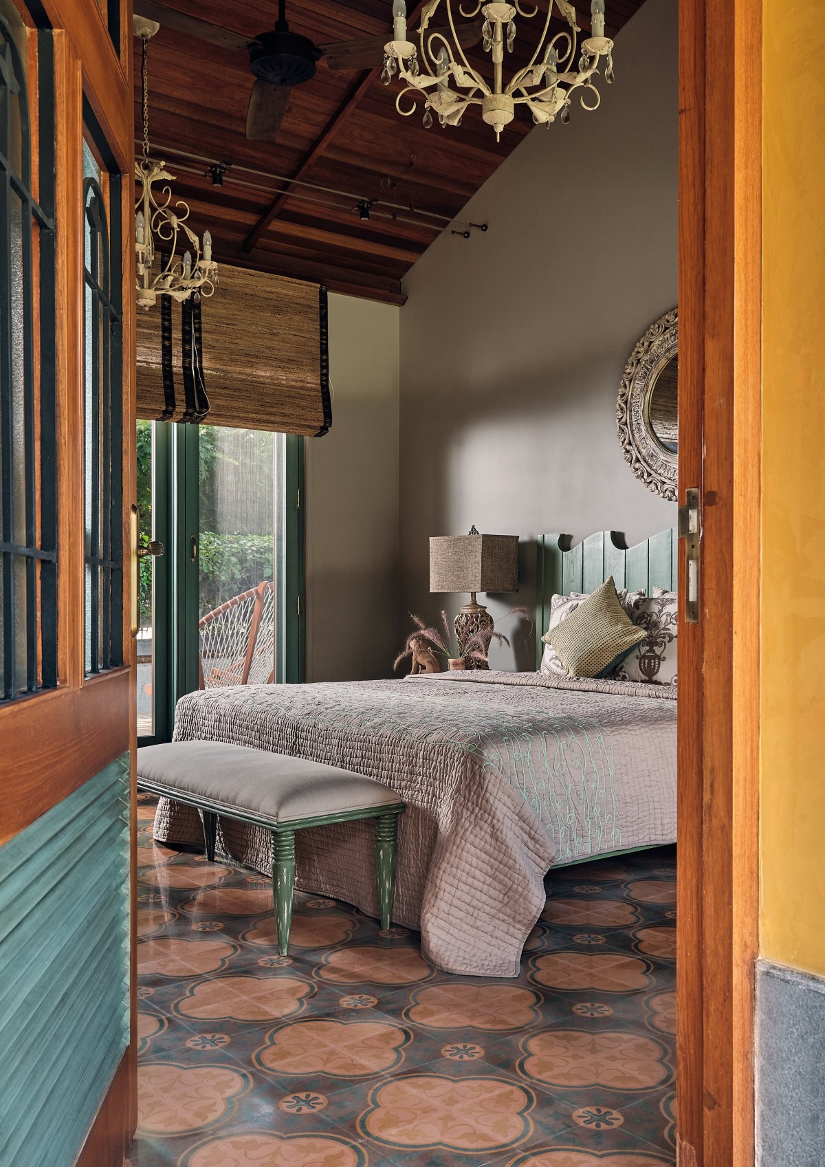tile. A simple wooden and black The olive and ochre room uses a heritage pattern tile in Kota,