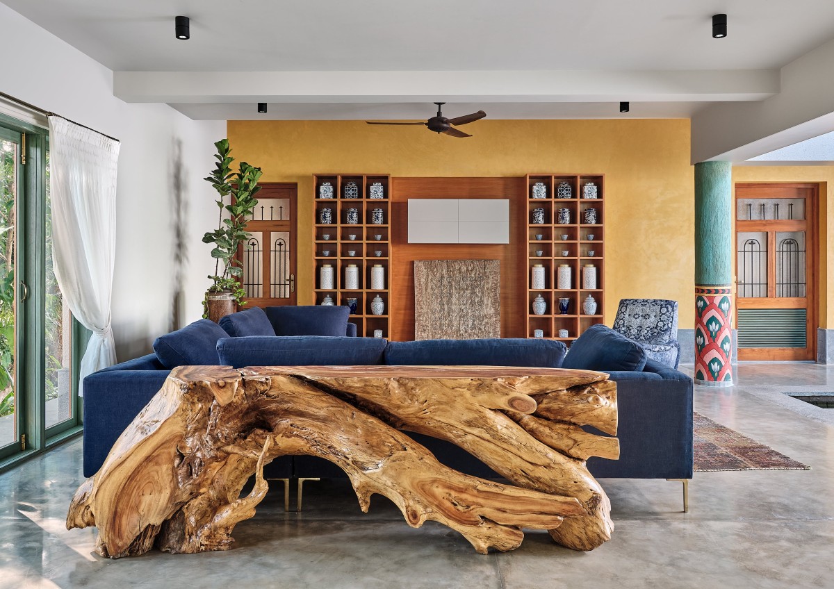 area is a combination of a blue sofa, a drift wood console, a patchwork blue