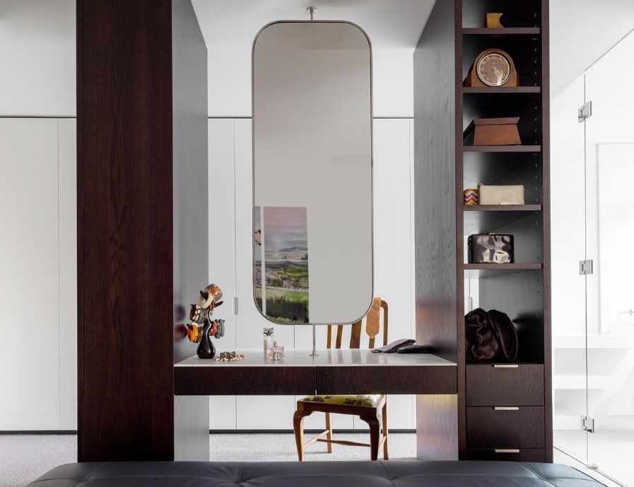“Mirror mirror… who in this realm is the fairest of them all?†Jane McNeill’s masterful joinery is hard to beat with its dark American oak timber veneers, carara marble benchtop, polished chrome framed mirror, ottoman by Eileen Grey and frosted glass wall between the dressing room and ensuite bathroom to provide defused natural light for this otherwise landlocked space. © Justin Alexander