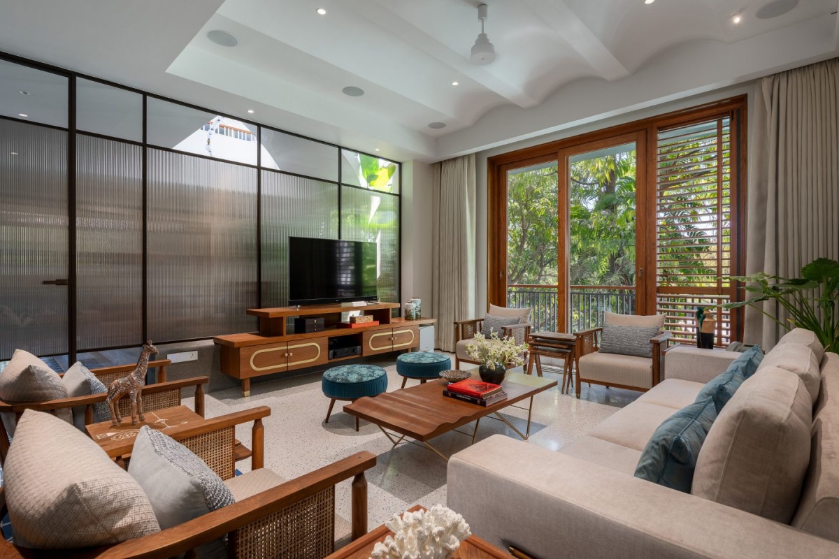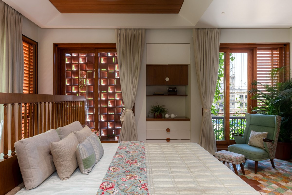 Throughout the house, light and air are the true residents. They move freely, gently regulated by terracotta jalis, operable louvres, and screens that breathe rather than barricade. Even the windows are not just voids in a wall. They are sequences, stories. Many are flanked by planters and screens, where warm air cools as it passes, scenting the indoors with a whisper of green.