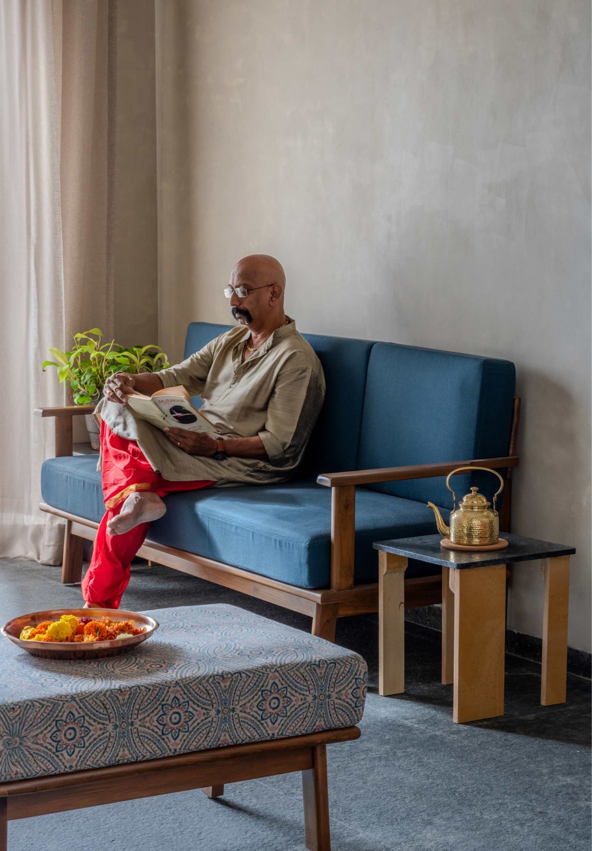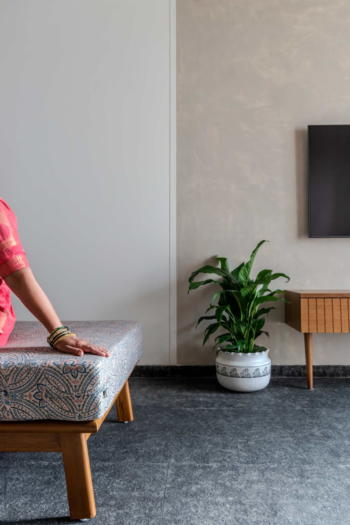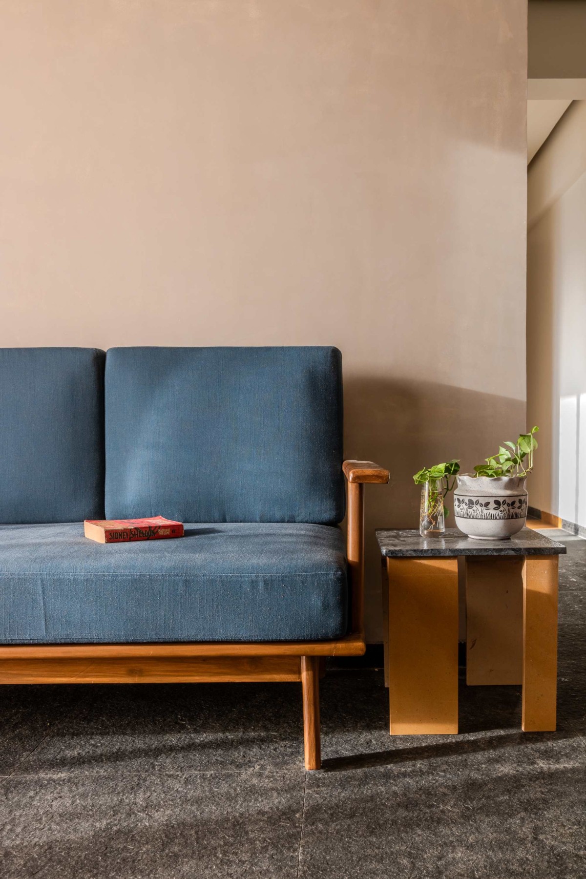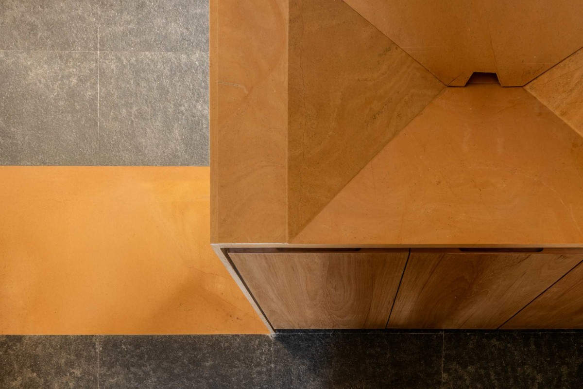 The key inspiration came from rural Maharashtra and its traditional built forms. Their team visited temples and village homes, observing how materials, details, and spatial planning shaped the lived experience. Elements such as the devli (sacred niche) and khuntis (stone hooks) became important cultural references that they reinterpreted for this project. Natural stones - basalt, yellow Jaisalmer, and white marble - formed the backbone of the design, each carrying both functional and metaphysical qualities. Lime wash was used for wall finishes, echoing the tactile character of rural houses while also providing sustainability and softness to the interiors.
