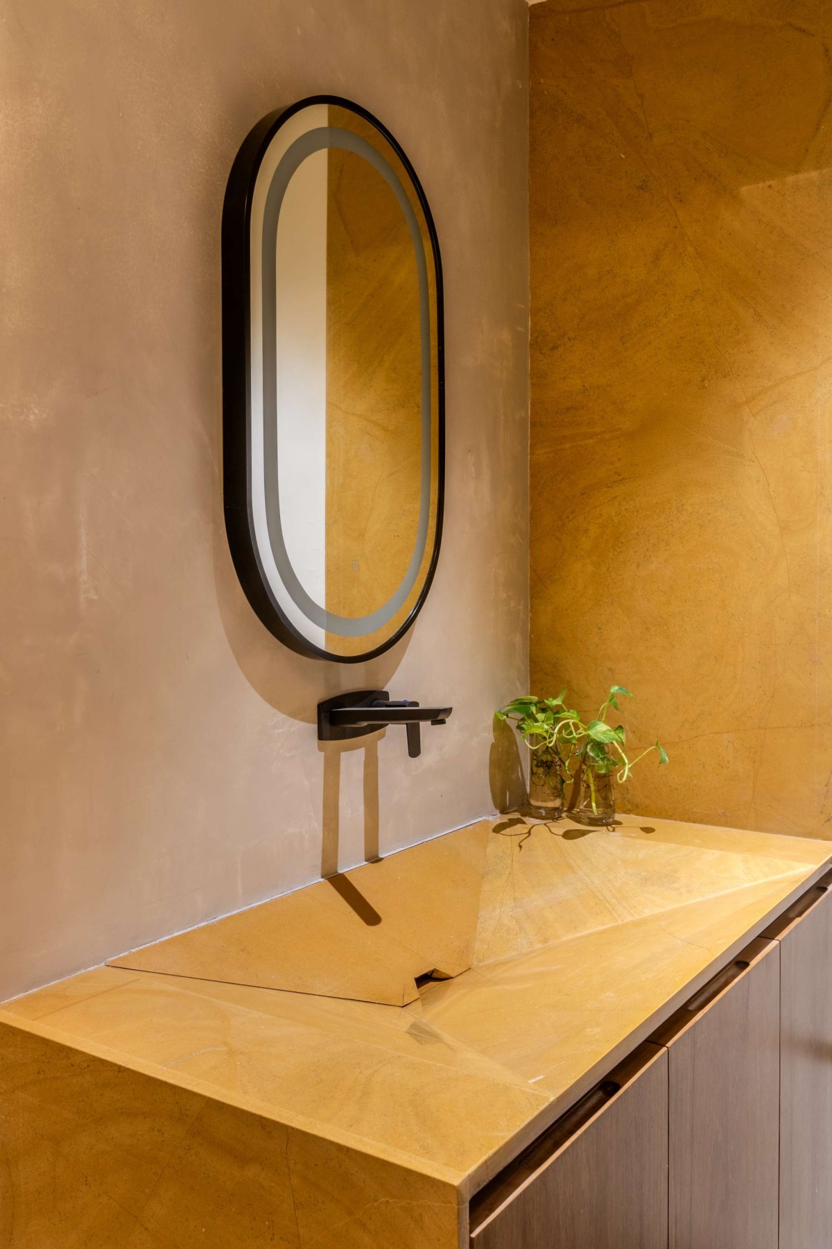 The yellow Jaisalmer stone, golden yet fluid in spirit, flows like water through the basin's form—solid stone shaped to evoke a ripple of calm.