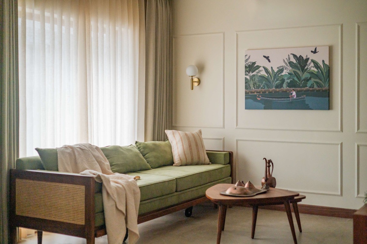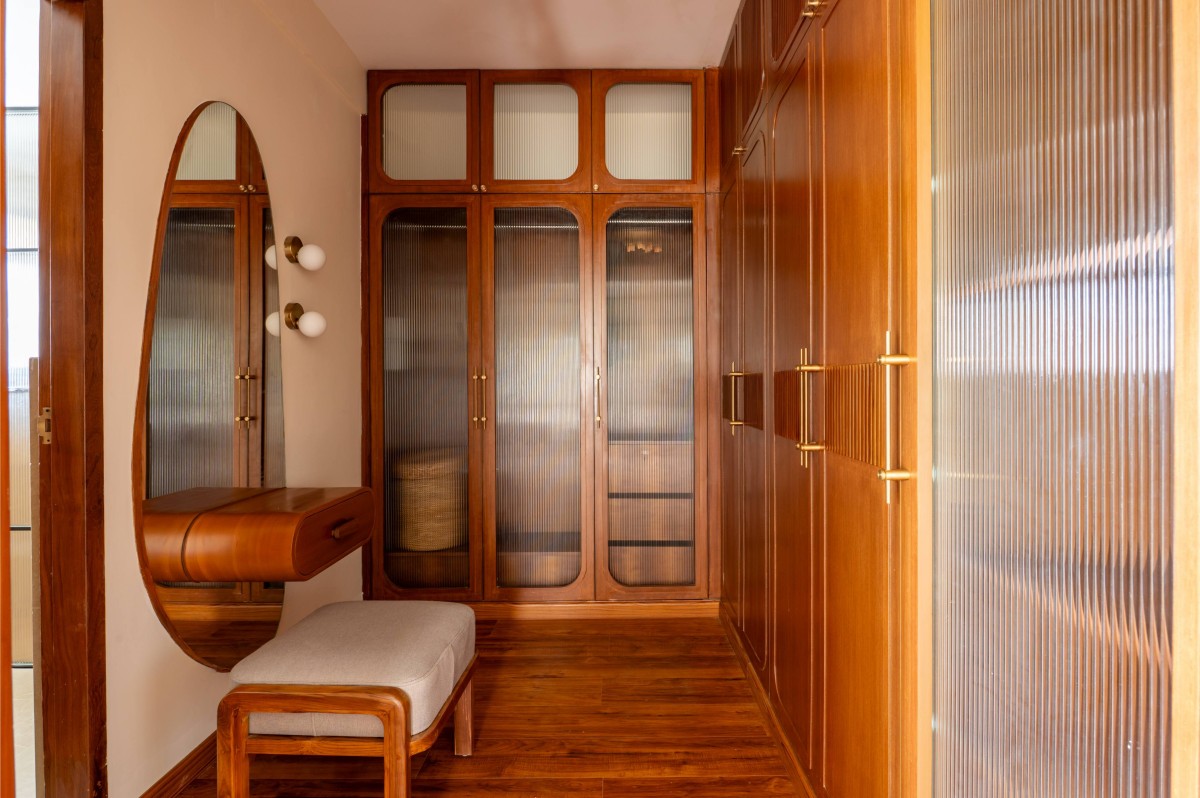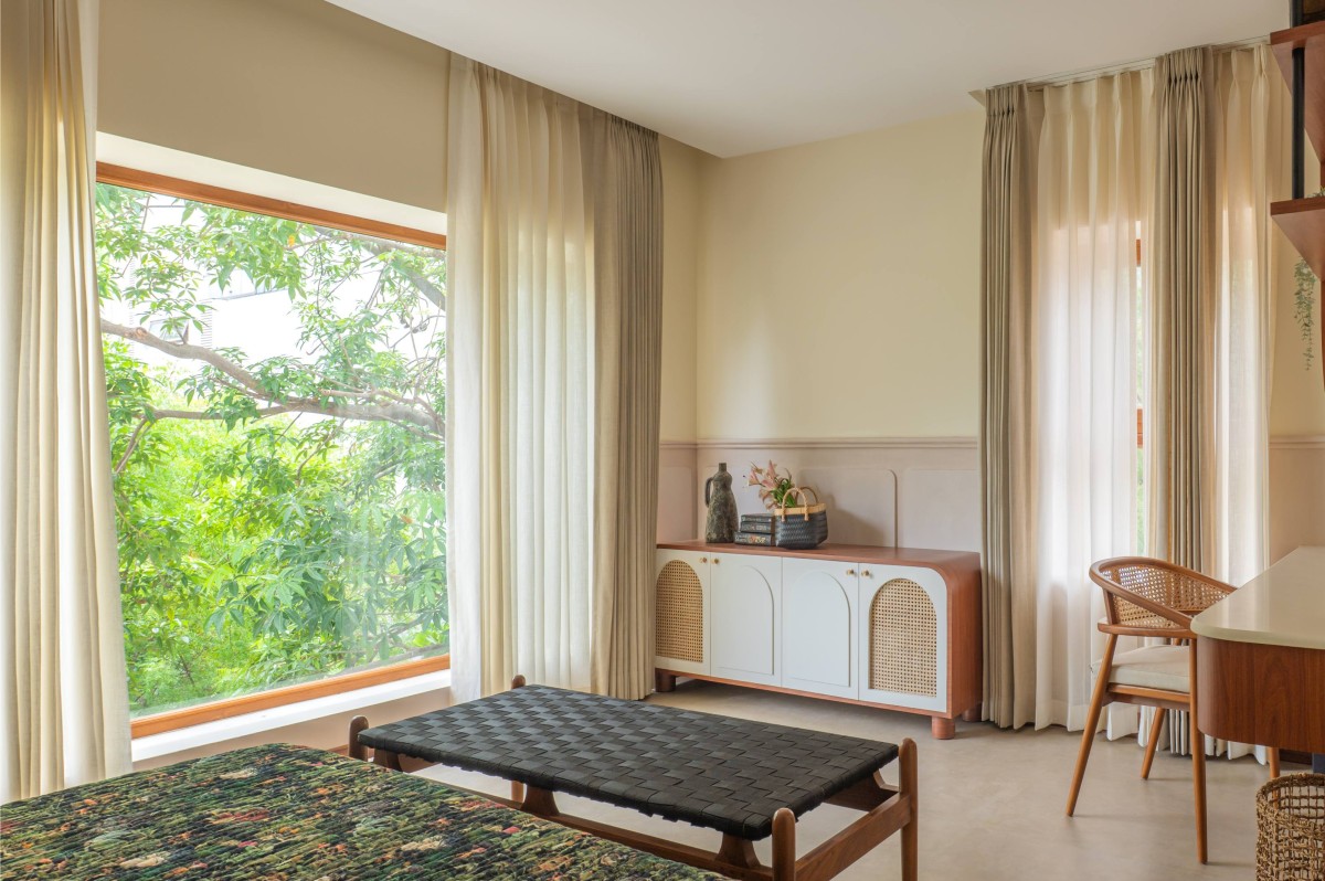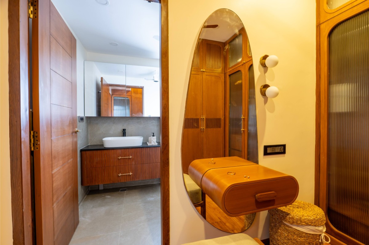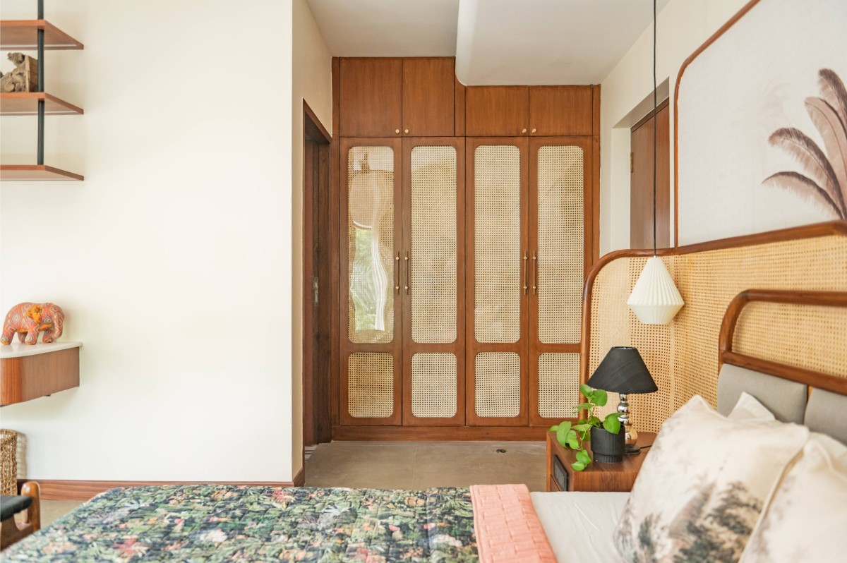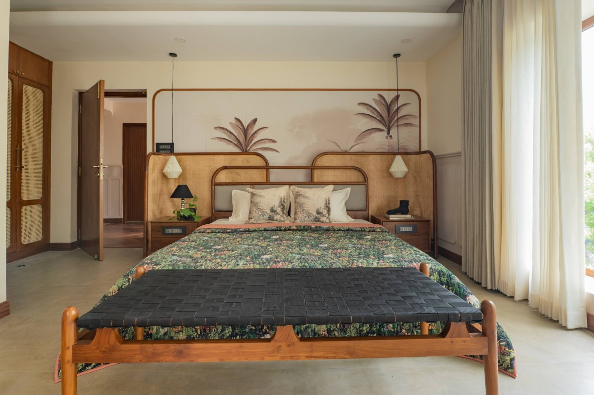 The material palette was deliberately chosen to bridge memory and modernity. Natural plantain teak wood furniture crafted by Maakaram Studio in Kerala, rattan, brass accents, and handcrafted lighting infuse the interiors with tactile warmth and familiarity. Lime-washed walls add a soft, handmade quality, capturing light subtly and giving depth to muted tones. The outdoor deck features an exposed brick wall, creating a visual anchor and textural contrast that complements the earthy, natural palette. These materials are layered with soft fabrics and neutral backgrounds, resulting in spaces that feel understated yet rich in detail.