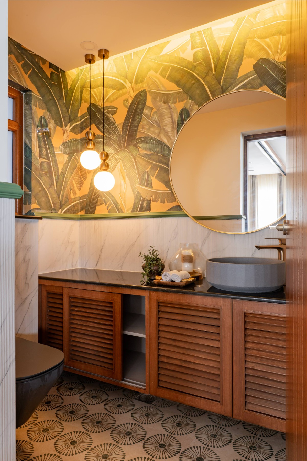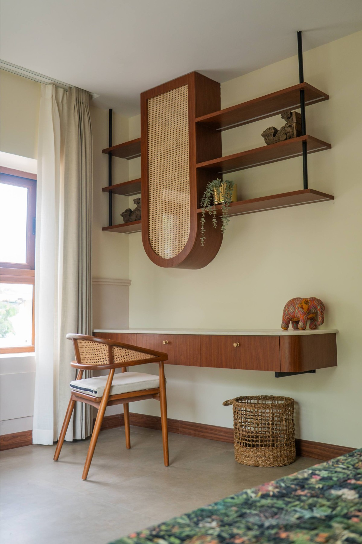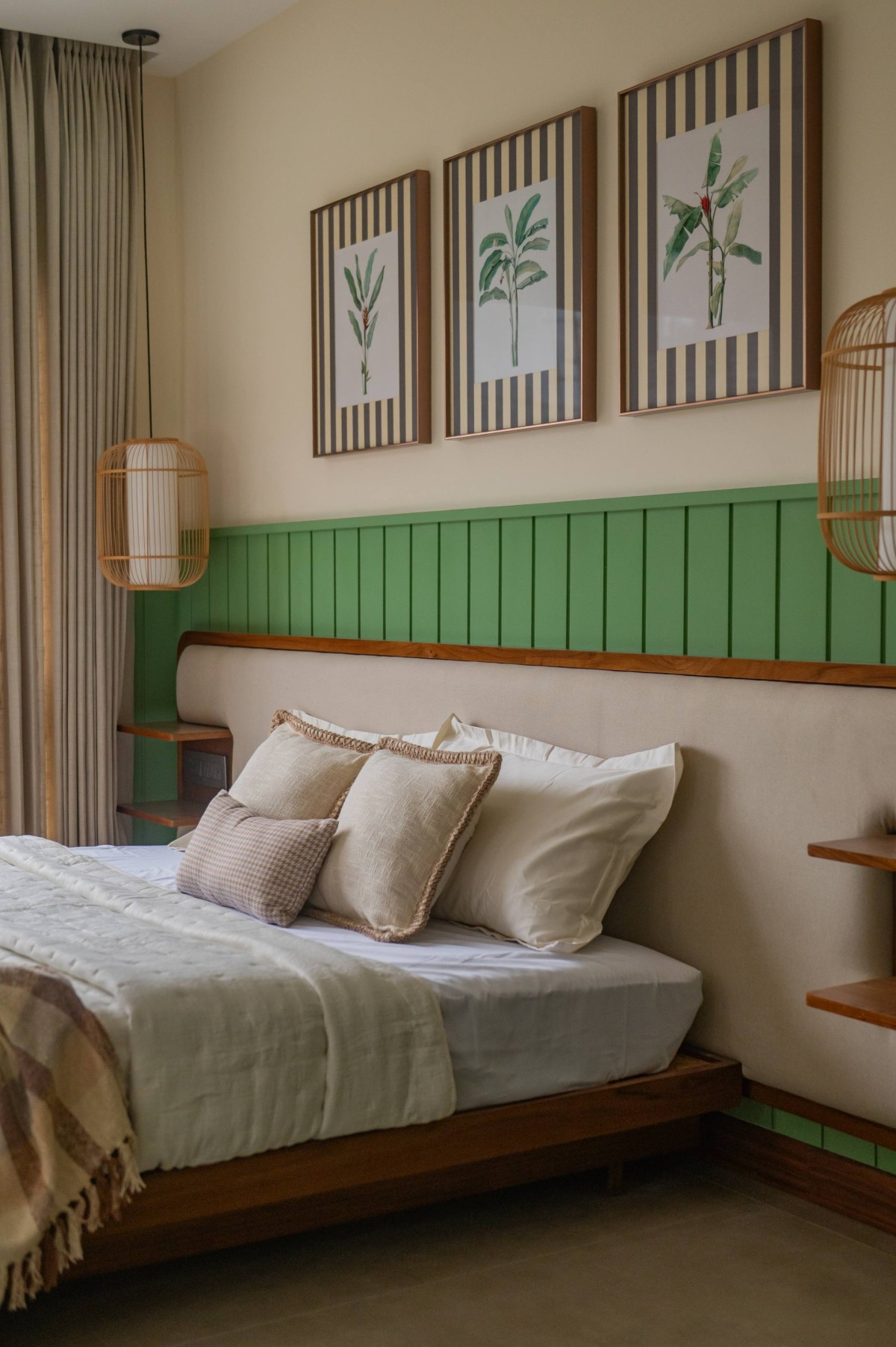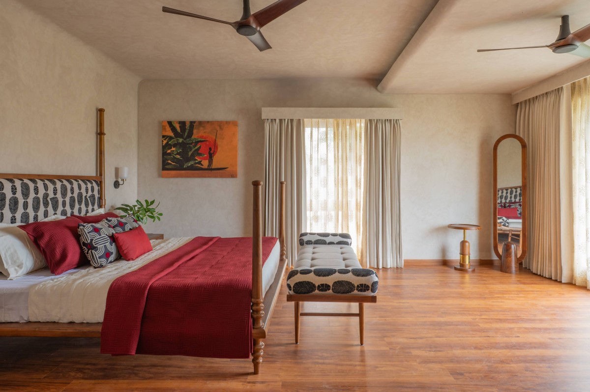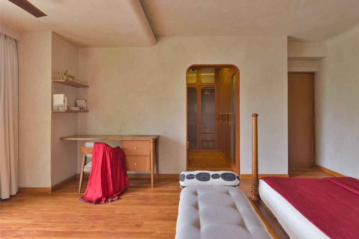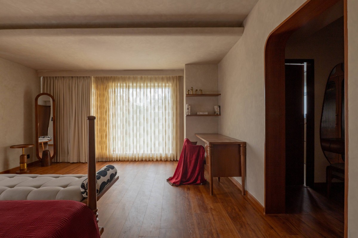 The material palette was deliberately chosen to bridge memory and modernity. Natural plantain teak wood furniture crafted by Maakaram Studio in Kerala, rattan, brass accents, and handcrafted lighting infuse the interiors with tactile warmth and familiarity. Lime-washed walls add a soft, handmade quality, capturing light subtly and giving depth to muted tones. The outdoor deck features an exposed brick wall, creating a visual anchor and textural contrast that complements the earthy, natural palette. These materials are layered with soft fabrics and neutral backgrounds, resulting in spaces that feel understated yet rich in detail.