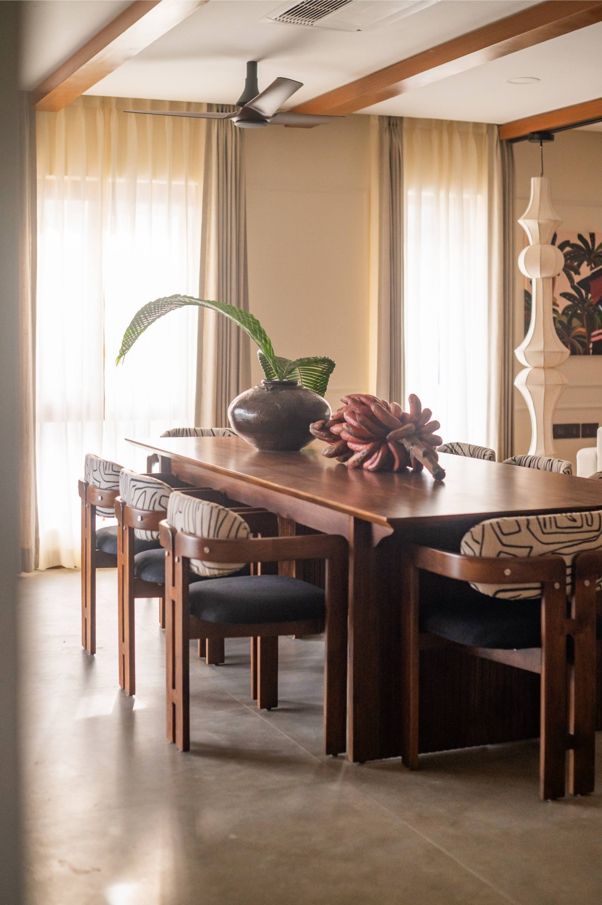 Another structural constraint was the floor height. A sunken slab cut through the living room, creating a sense of imbalance. To address this, carefully designed rafters were introduced across the living and dining areas. These rafters visually tied the zones together, concealed the level changes above, and evolved into a defining architectural gesture, reinforcing the Kerala-inspired character of the home while adding warmth and rhythm.