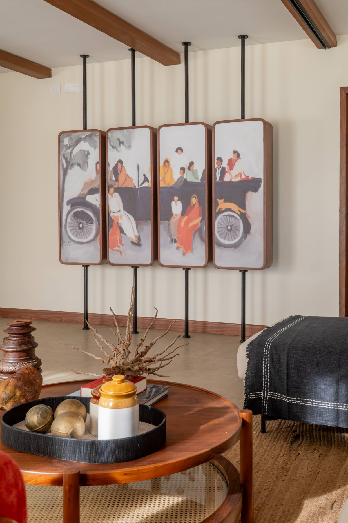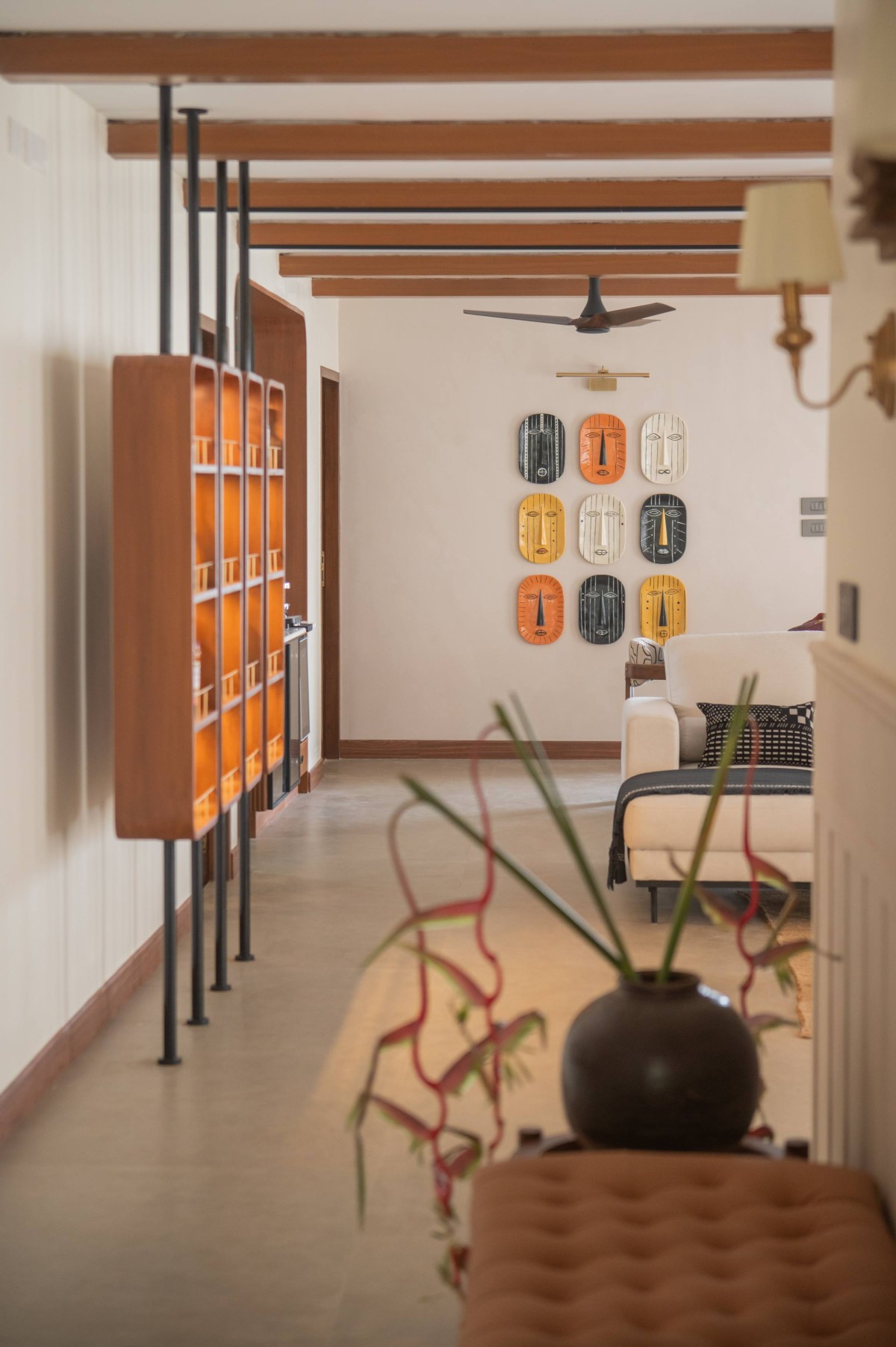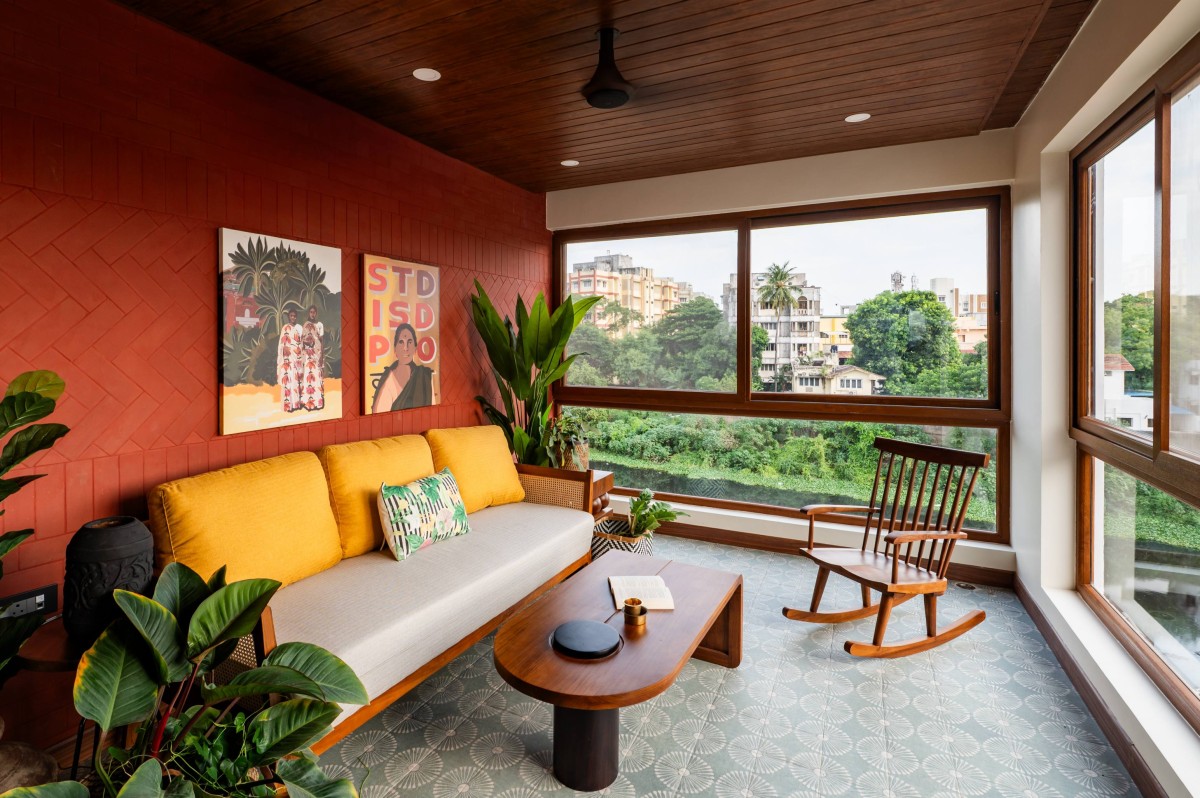 Among the home’s standout features are the rafters and the deck. What began as a structural necessity evolved into a signature design element. The rafters anchor the living and dining areas, echoing the spatial rhythms of Kerala homes, while the deck, with its warm wooden ceiling, earthy wall, and river views, offers a space of pause and reflection, a place where the home seems to breathe.