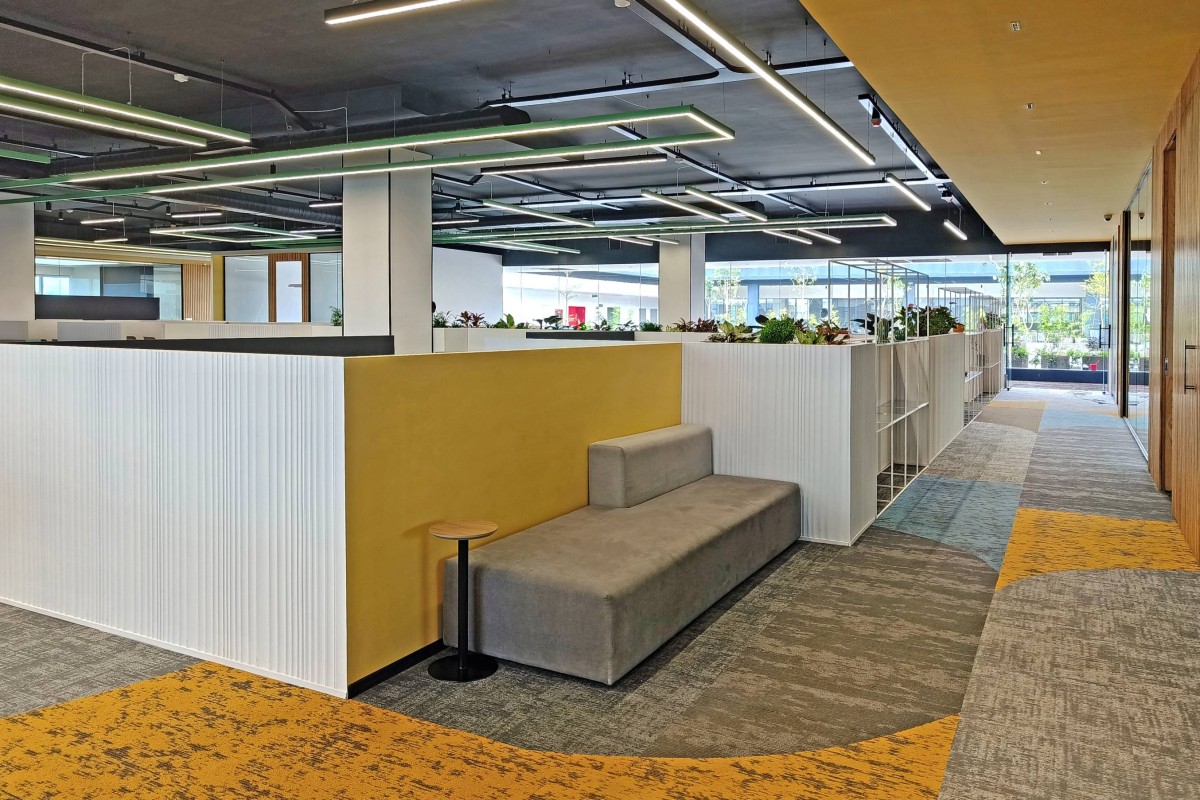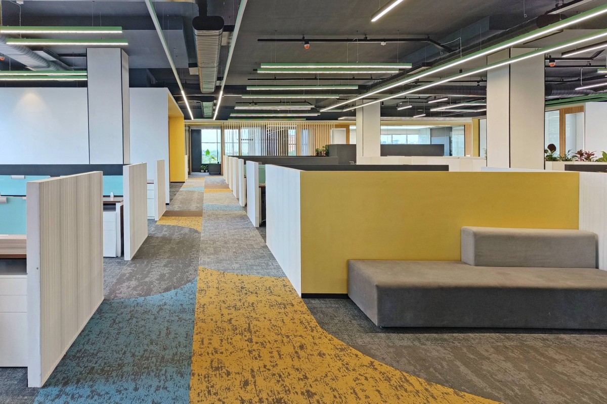 The flooring is thoughtfully designed, with light and dark grey carpets used for the open workstations and enclosed spaces, respectively. The main passageway, which serves as the central axis around which various functions are organized, is designed to stand out. It features a creative blend of different carpet colors and textures, forming a harmonious pattern that adds character and visual interest to the space. This visually striking passage not only enhances the aesthetic appeal but also helps guide movement and define the spatial flow within the office.