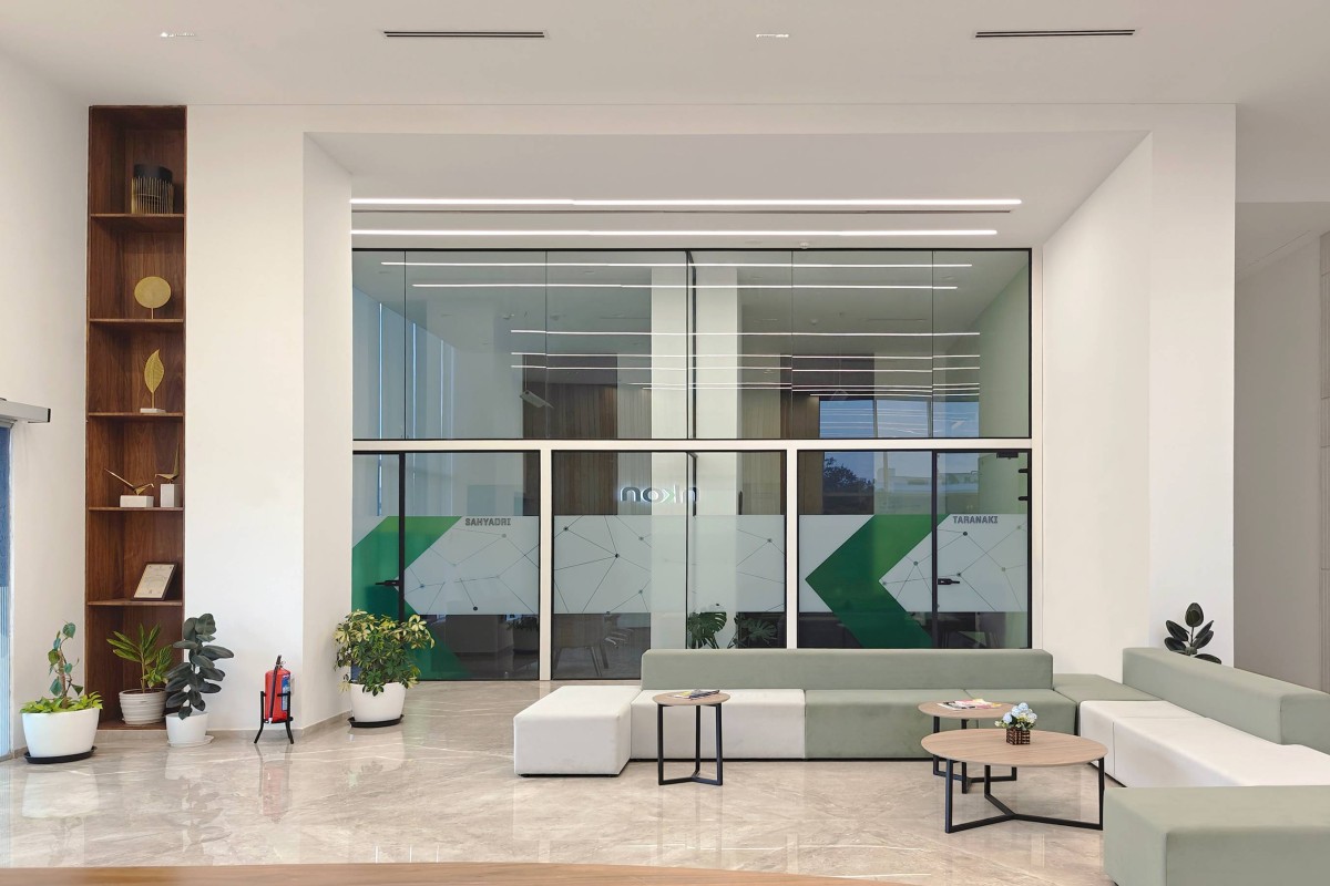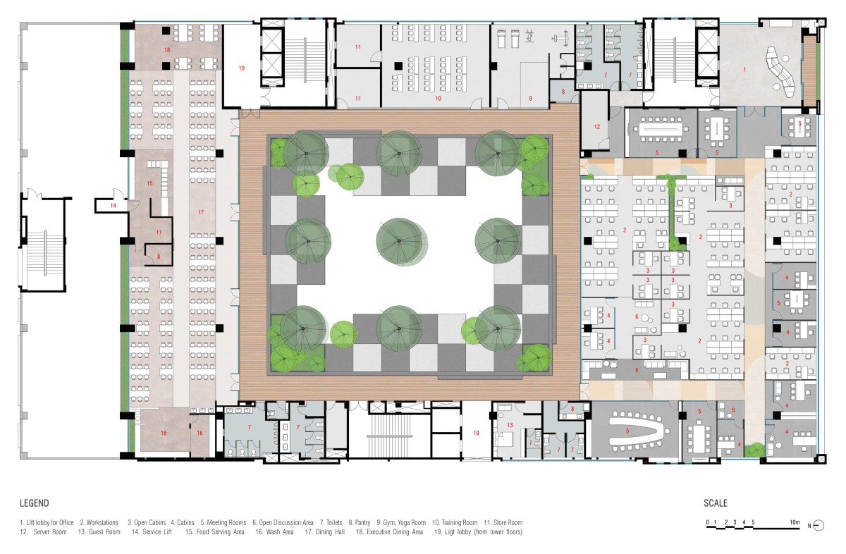 The central open-to-sky courtyard, surrounded by a 2.5m-wide passage, is the heart of the design and the focal point around which various functions like the office, canteen, training rooms, and gym/yoga rooms are organized. This courtyard serves as a versatile spill-out space for all these activities.