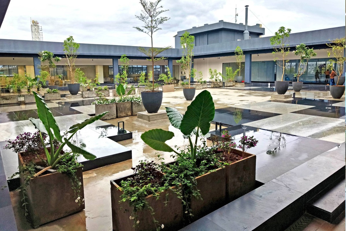 The courtyard is meticulously divided into a 3m x 3m grid, with a checkered pattern created using black and grey granite along the outer edge. Planters and dense landscaping accentuate the corners, while the central area remains open and flexible, providing a gathering space for functions, festivals, meetings, and other events. Large pots with trees are strategically placed on the nine stub columns, which were left for future expansions. This space, designed for multiple uses, seamlessly extends and integrates with the activities surrounding it, creating a dynamic and adaptable environment.