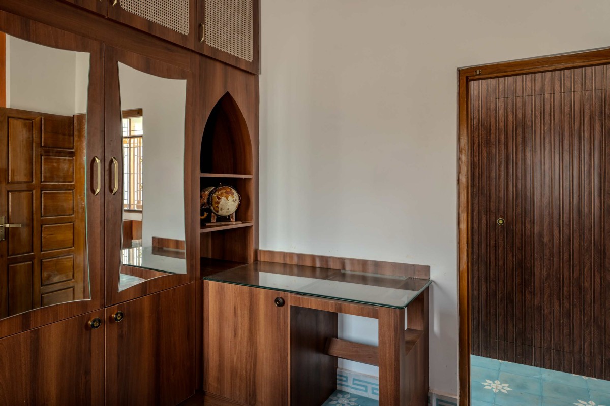 The interiors draw inspiration from traditional Chettinad architecture, blending craftsmanship with contemporary living. Athangudi tile flooring sets the foundation, complemented by traditional columns and intricately carved beam-to-column joints. Brass and wooden décor elements further reinforce the heritage-inspired theme.