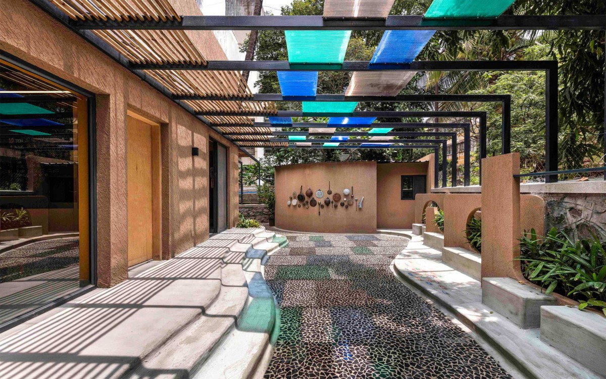 ceramic mosaics, wooden furniture & bamboo pergolas define the earthen