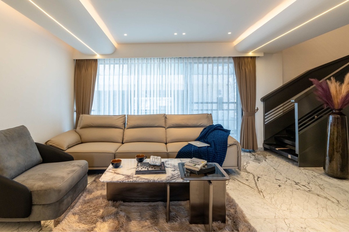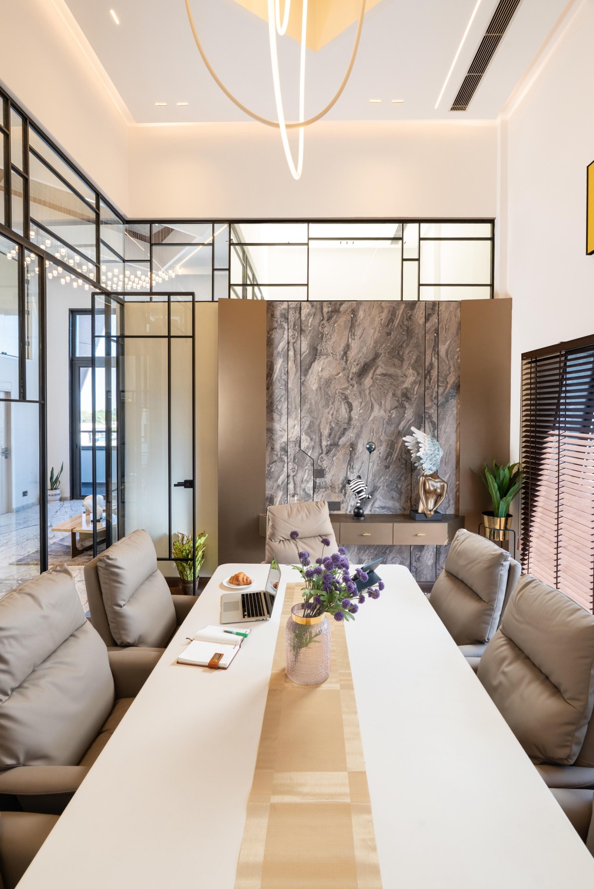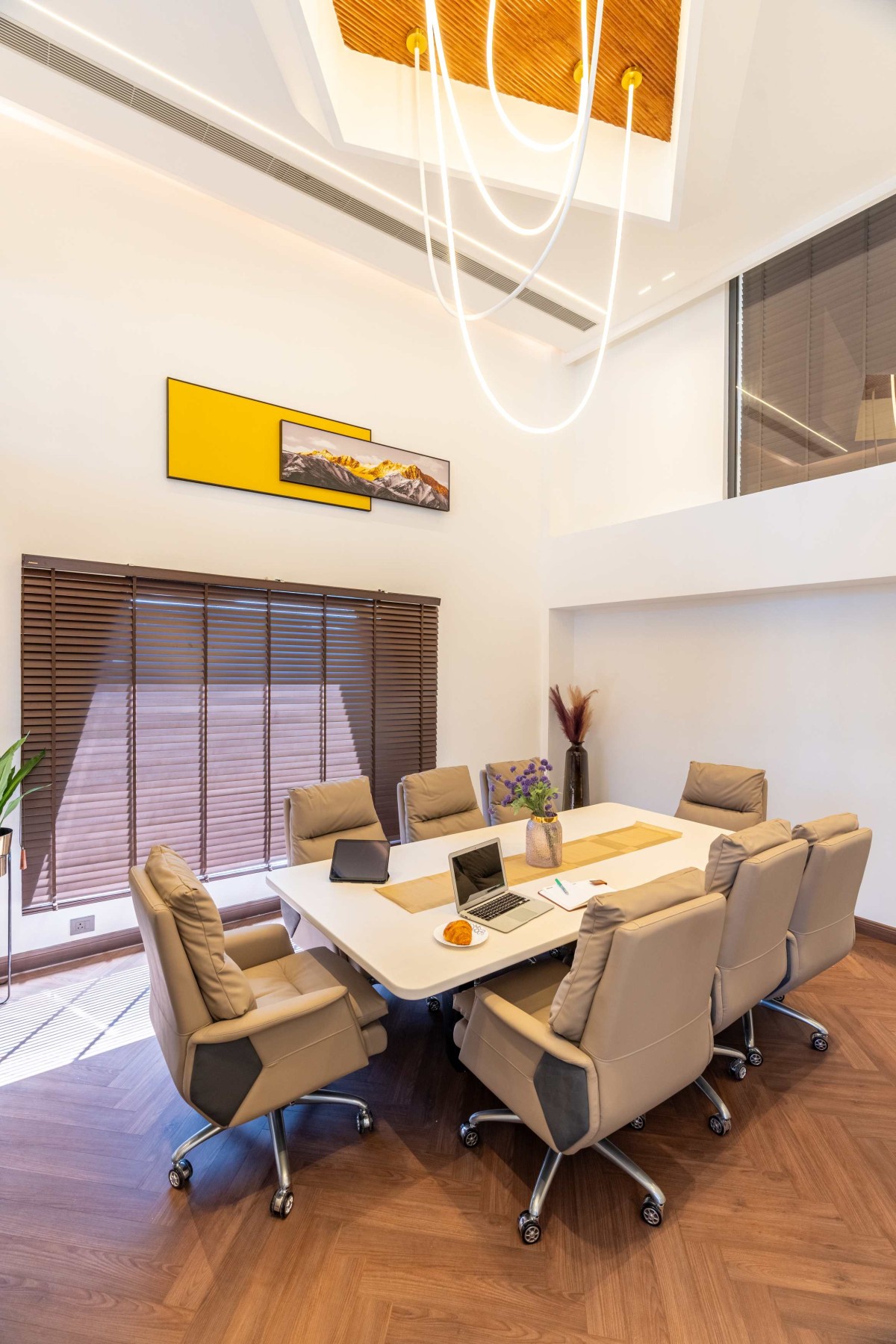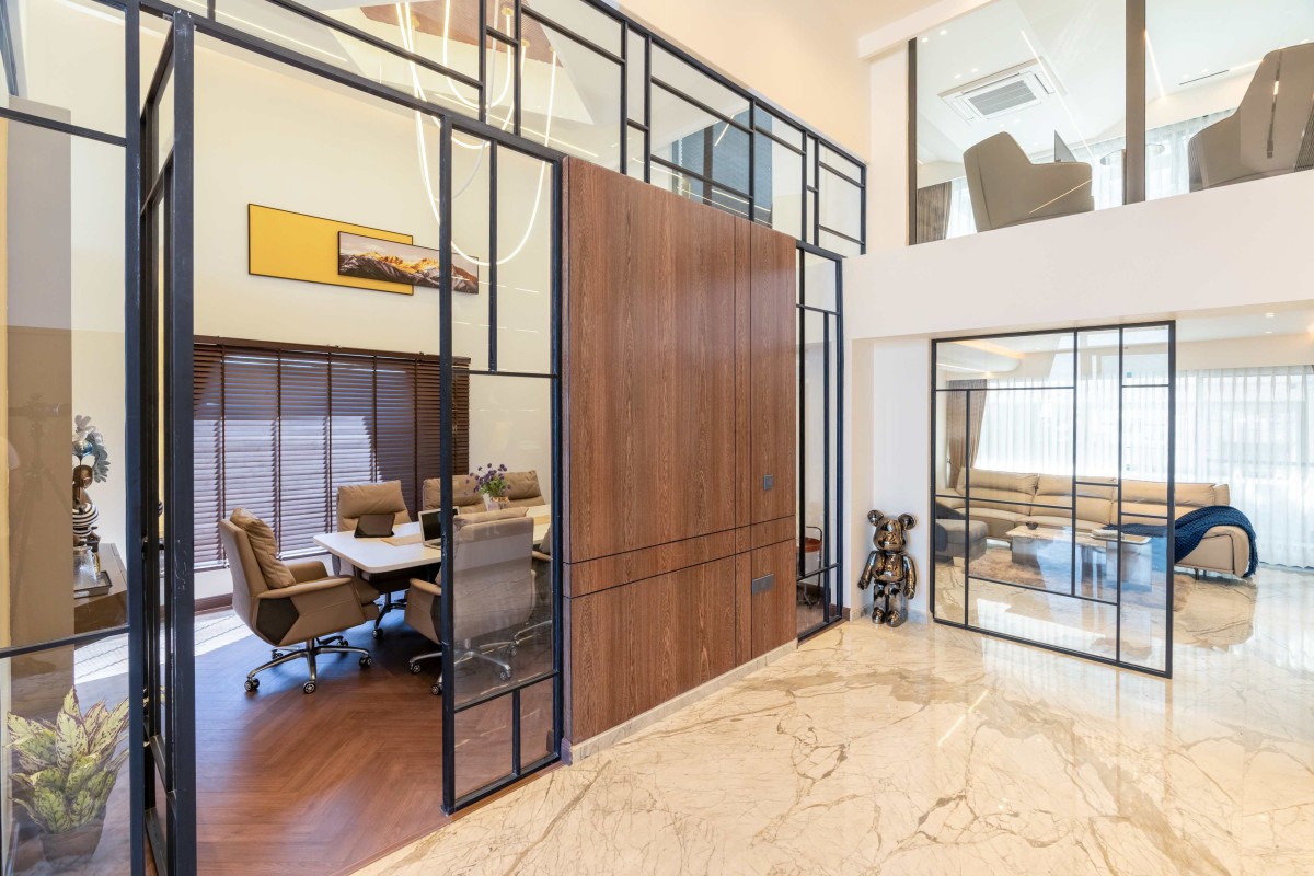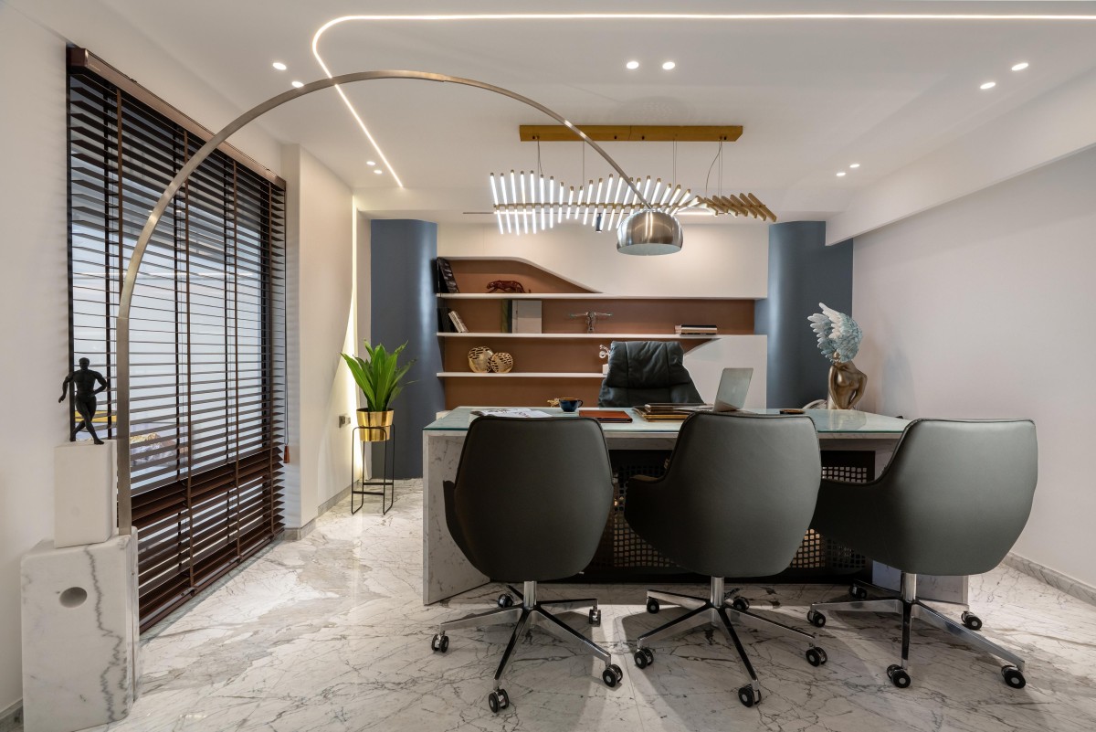 The client's office embodies a sense of grandeur. A double-height space allows for an expansive working environment, with only the MD's cabin divided into two levels via a private staircase. This commitment to open space fosters a feeling of empowerment and limitless possibility.