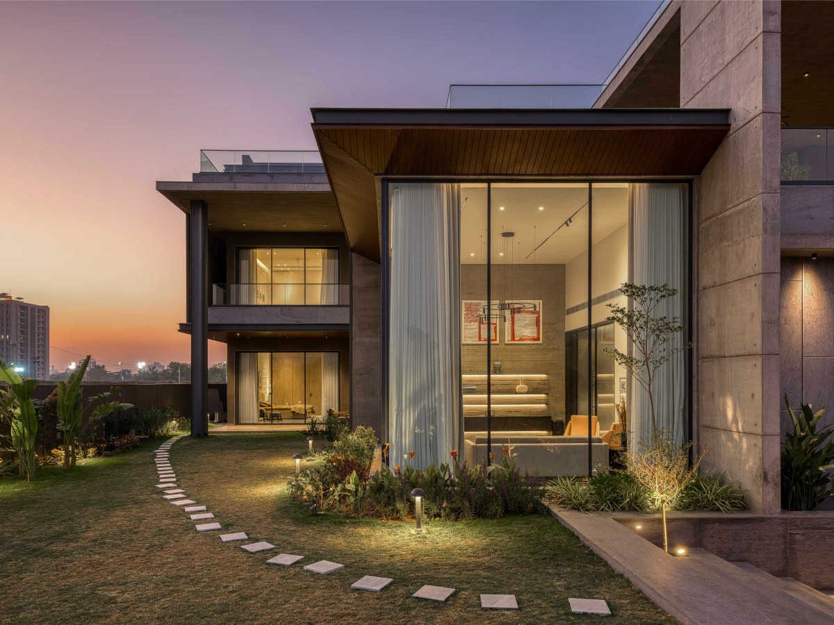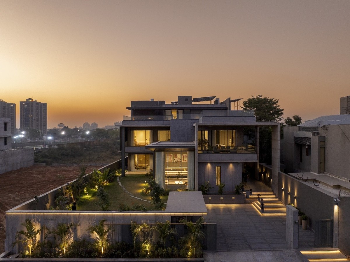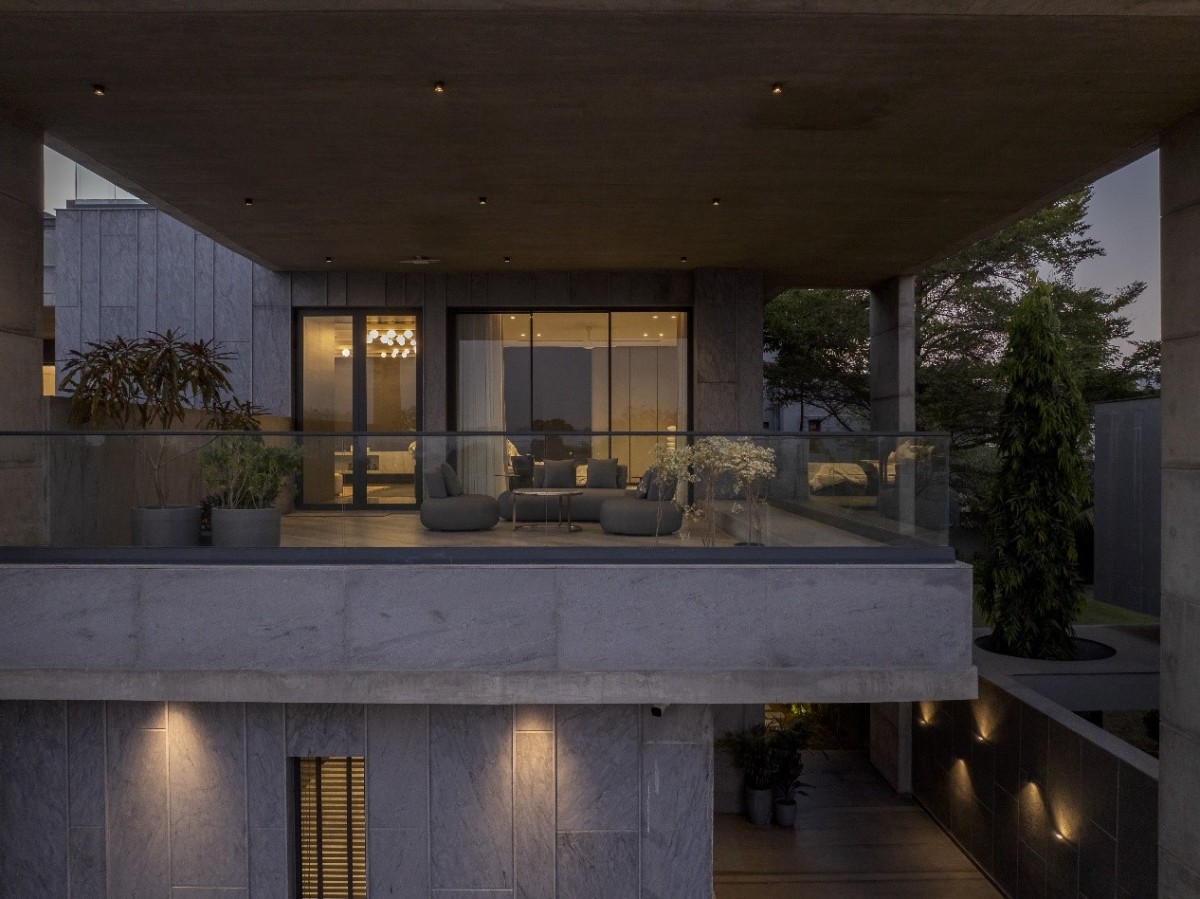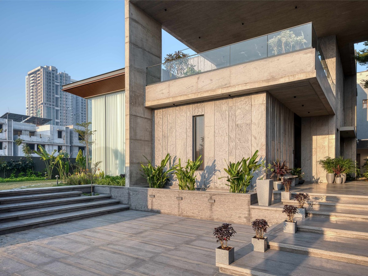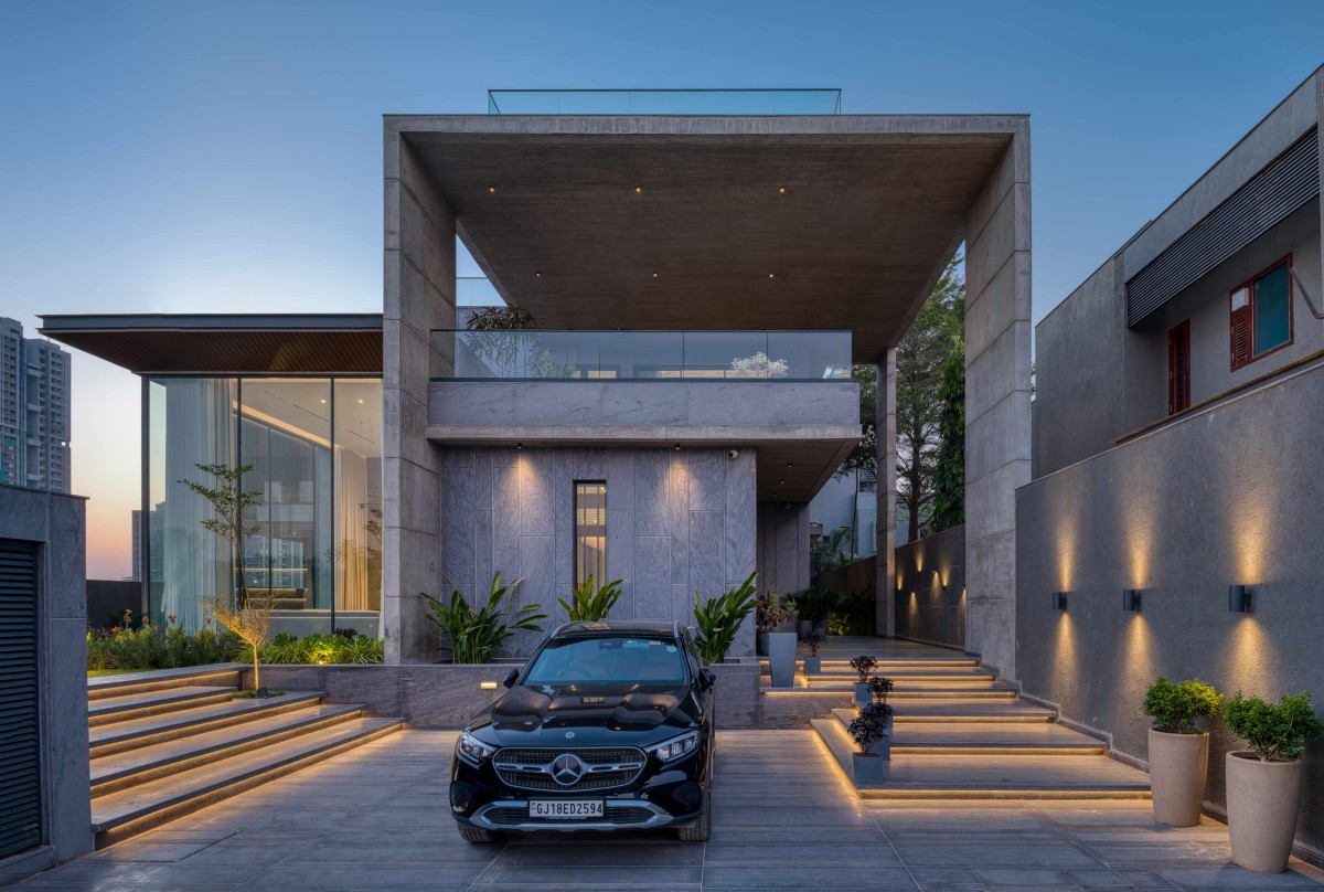 The journey into this architectural masterpiece begins with a thoughtfully designed approach plaza where every element serves both aesthetic and practical purposes. The parking and entrance step-way run parallel and is differentiated with planters, leading up to the entrance verandah.