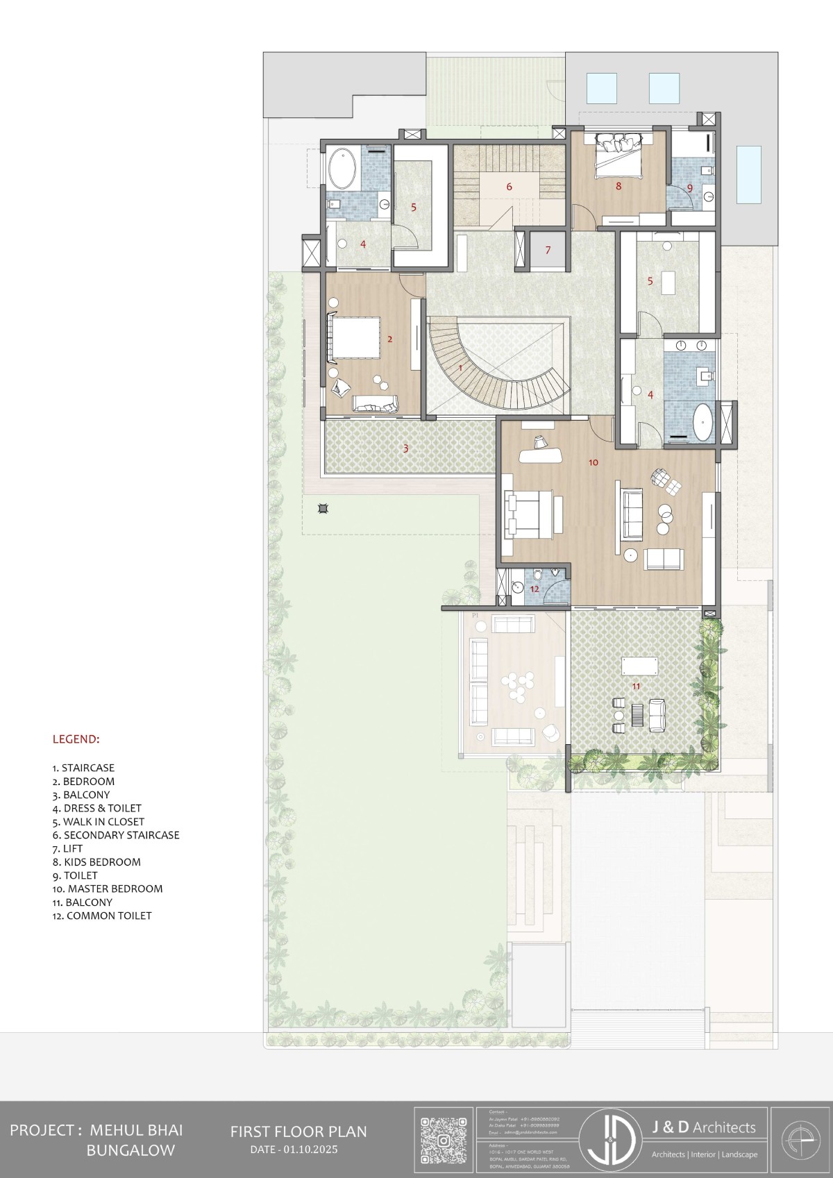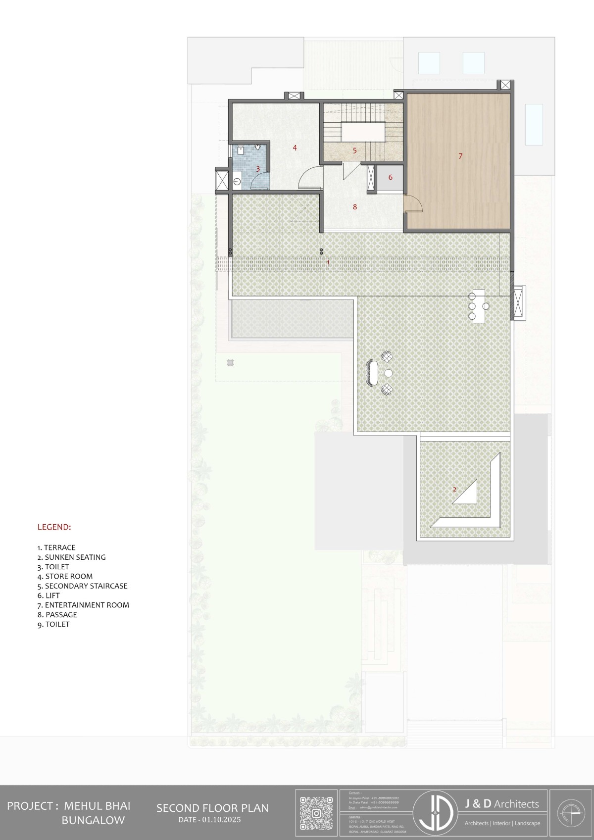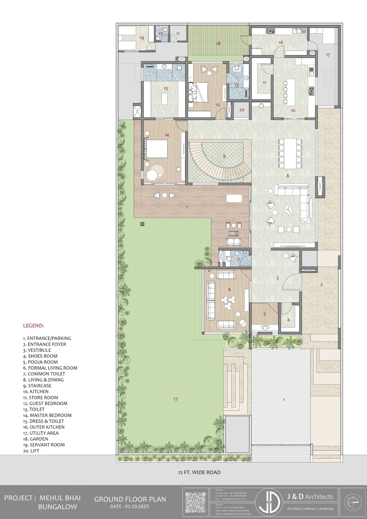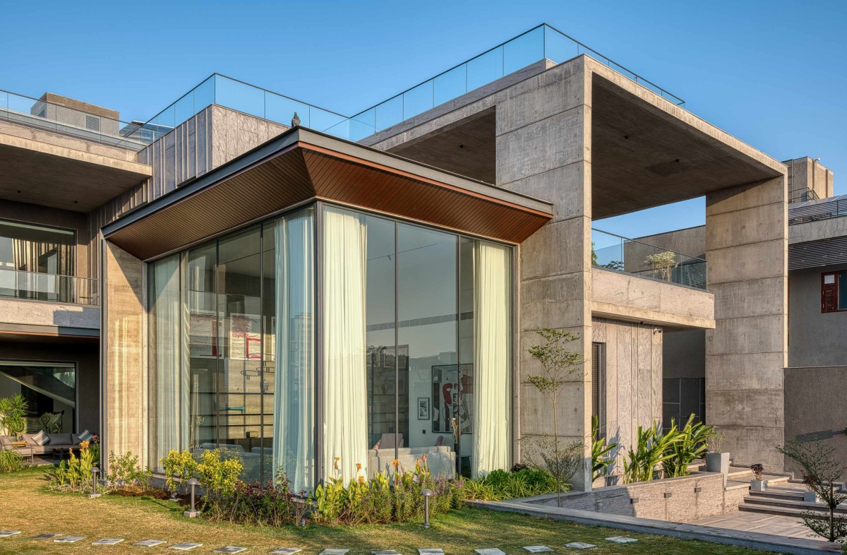 The journey into this architectural masterpiece begins with a thoughtfully designed approach plaza where every element serves both aesthetic and practical purposes. The parking and entrance step-way run parallel and is differentiated with planters, leading up to the entrance verandah.