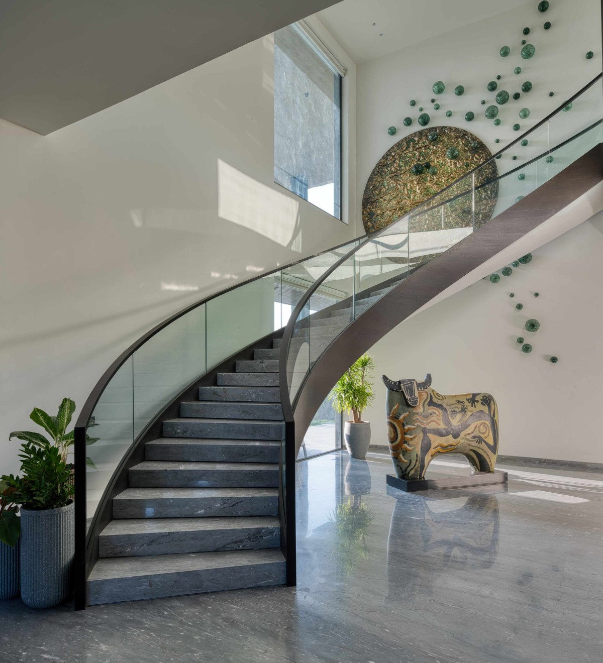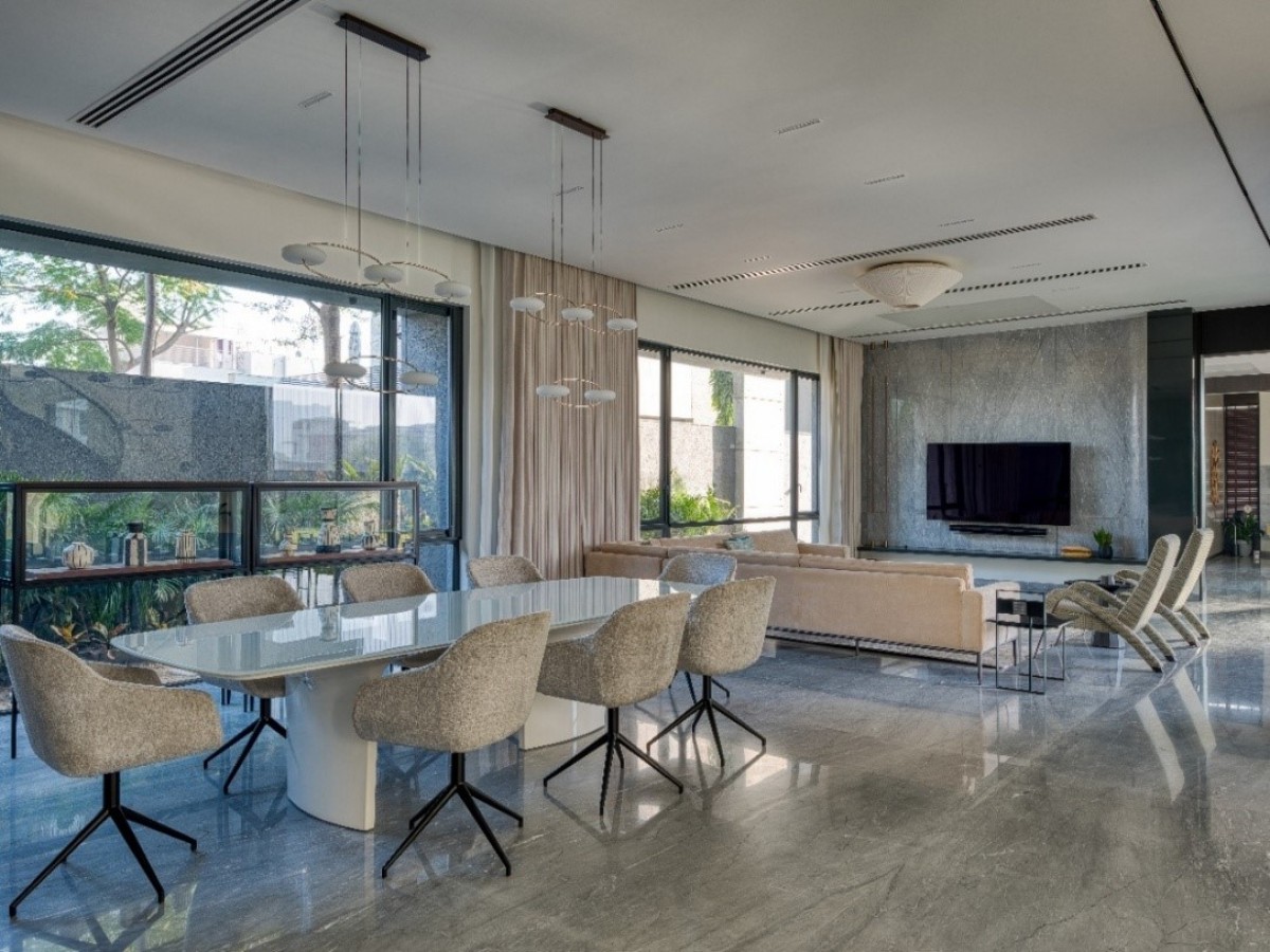 Bridging the ground and upper levels, a sculptural stairwell rises like a piece of art; equal parts structure and statement. At the core of the residence, the helical staircase rises as a centre masterpiece, an architectural element that is both functional and poetic. Seamlessly spiraling through the vertical volume of the building, it acts as a dynamic connector between floors while anchoring the spatial experience around it. “The grandeur and luxury of the stairwell allow it to become another experiential moment within the residence.” Says Ar. Disha.