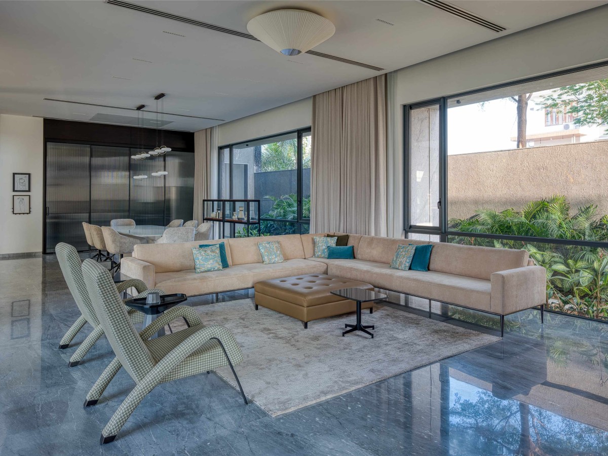 The formal drawing room is elevated for a sense of grandeur, with expansive glass openings that frame and invite views of the garden. Weaving together contemporary luxury and textural warmth, the central living space is elevated by custom lighting, layered materials, and expansive glazing that dissolves the boundary between indoors and out.