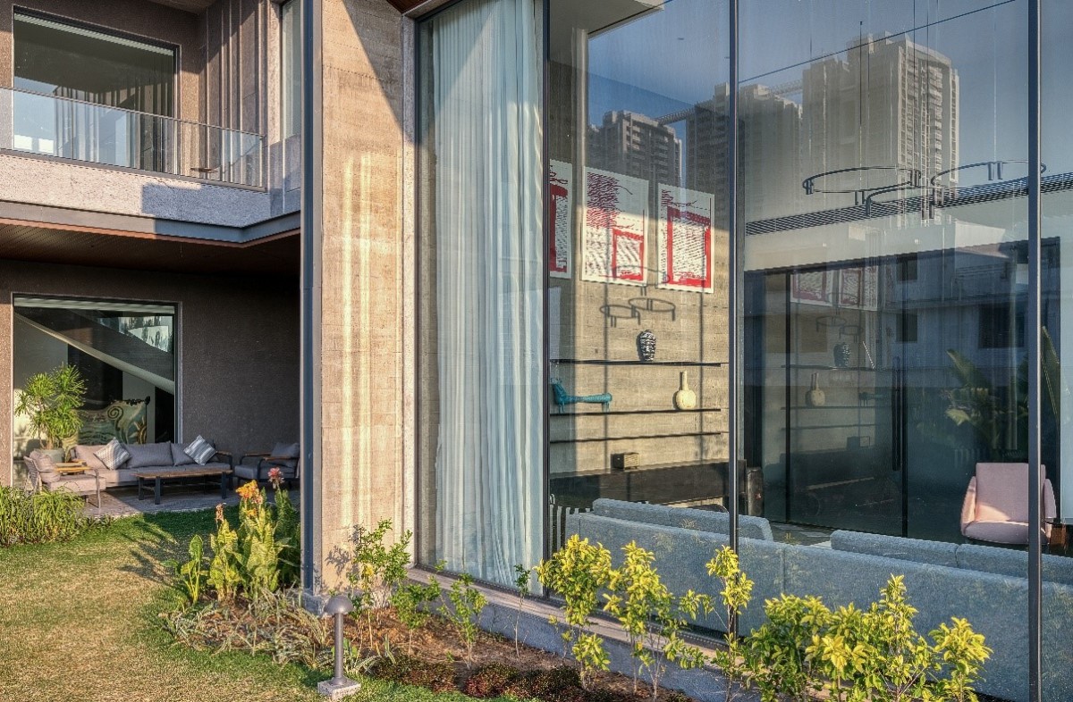 The entry to the Slate House unfolds through a vestibule that opens onto a drawing room & pooja space on one side and guided to living, dining area on the other.