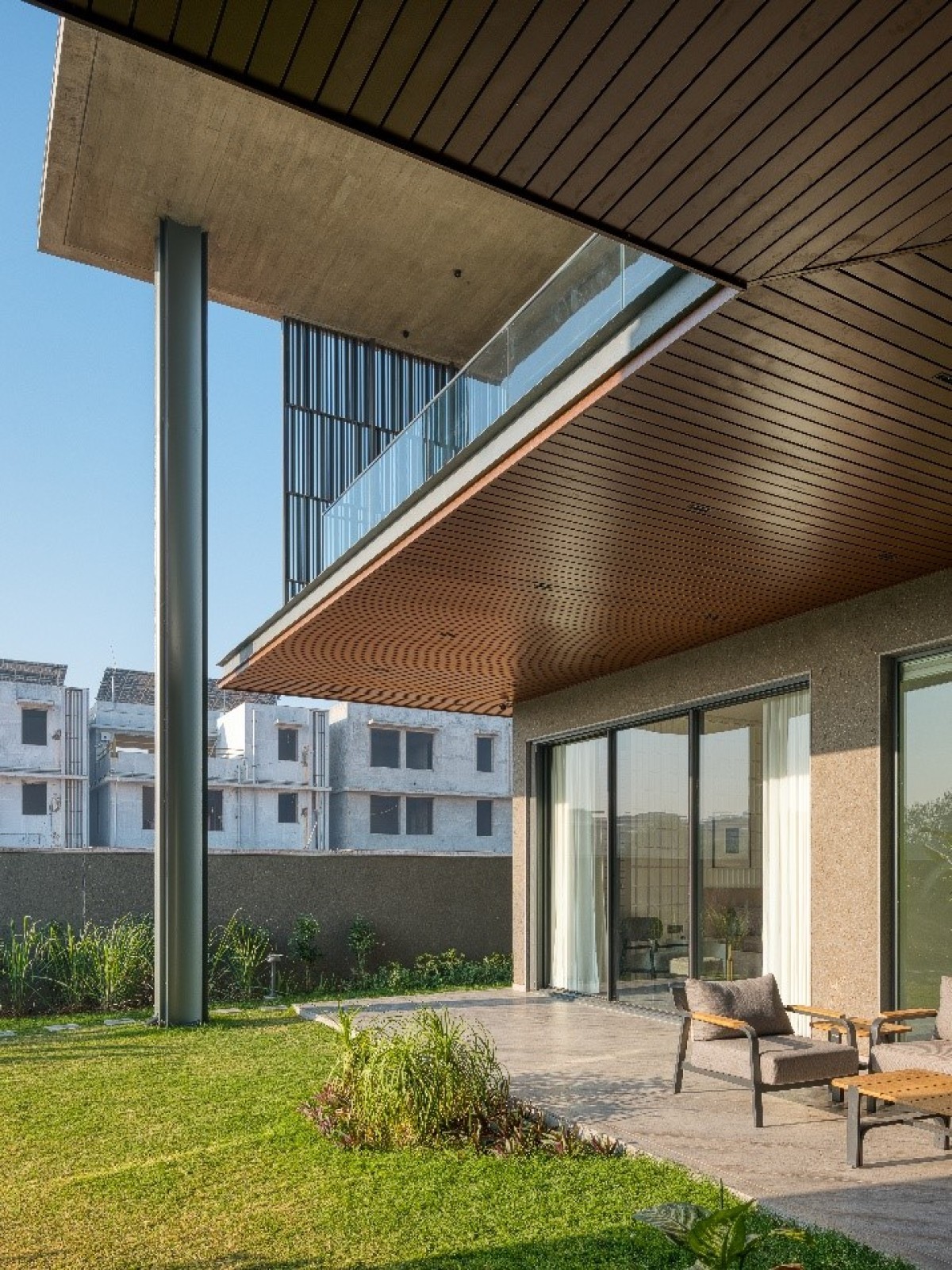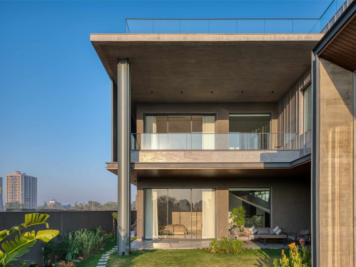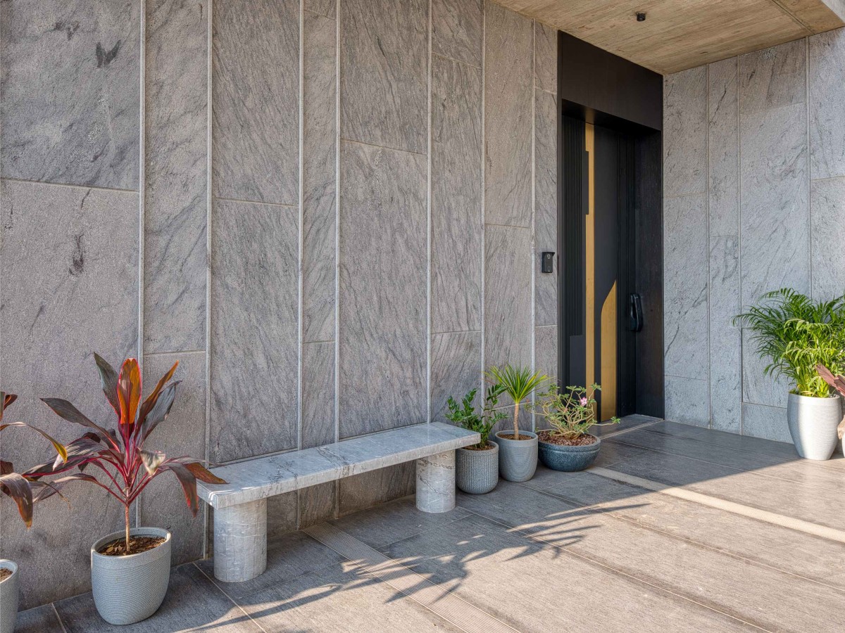 The façade of the verandah is cladded in natural stone, patterned with vertical strips, chosen for its timeless aesthetic appeal, textural richness.