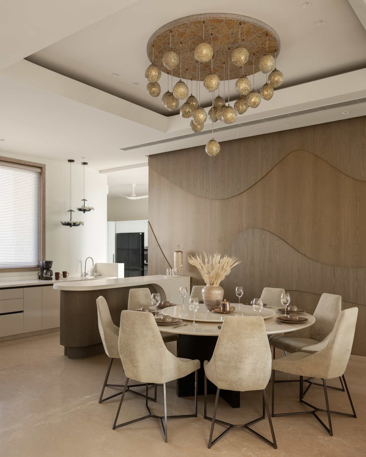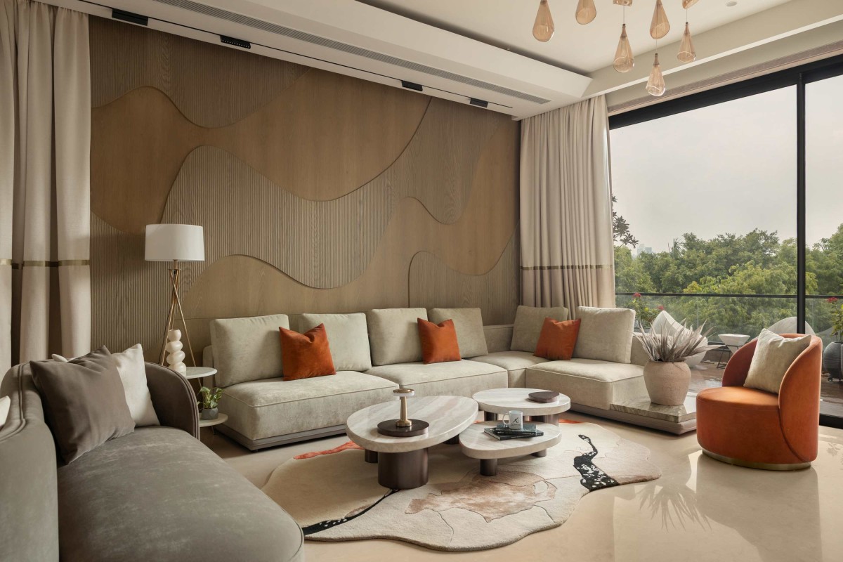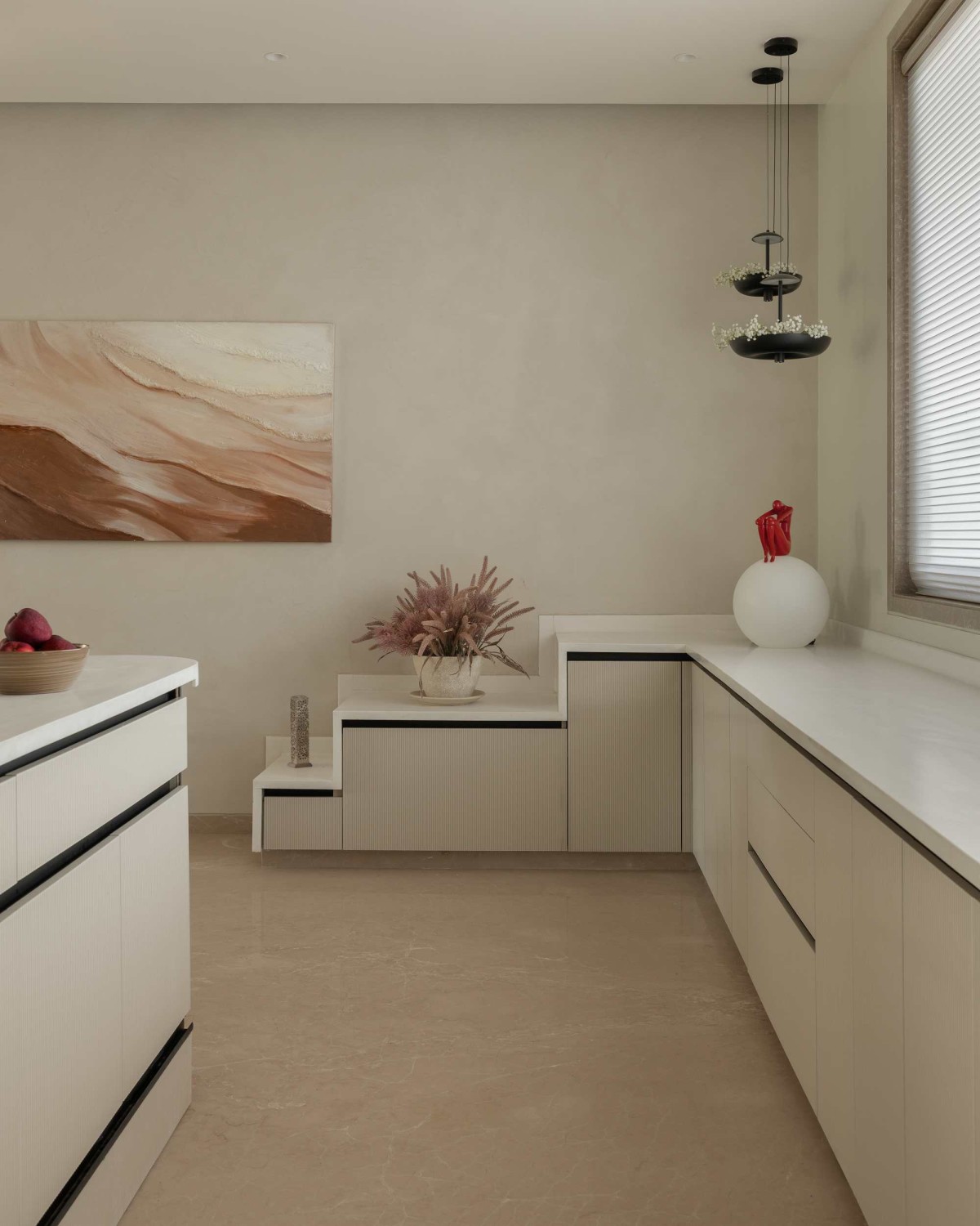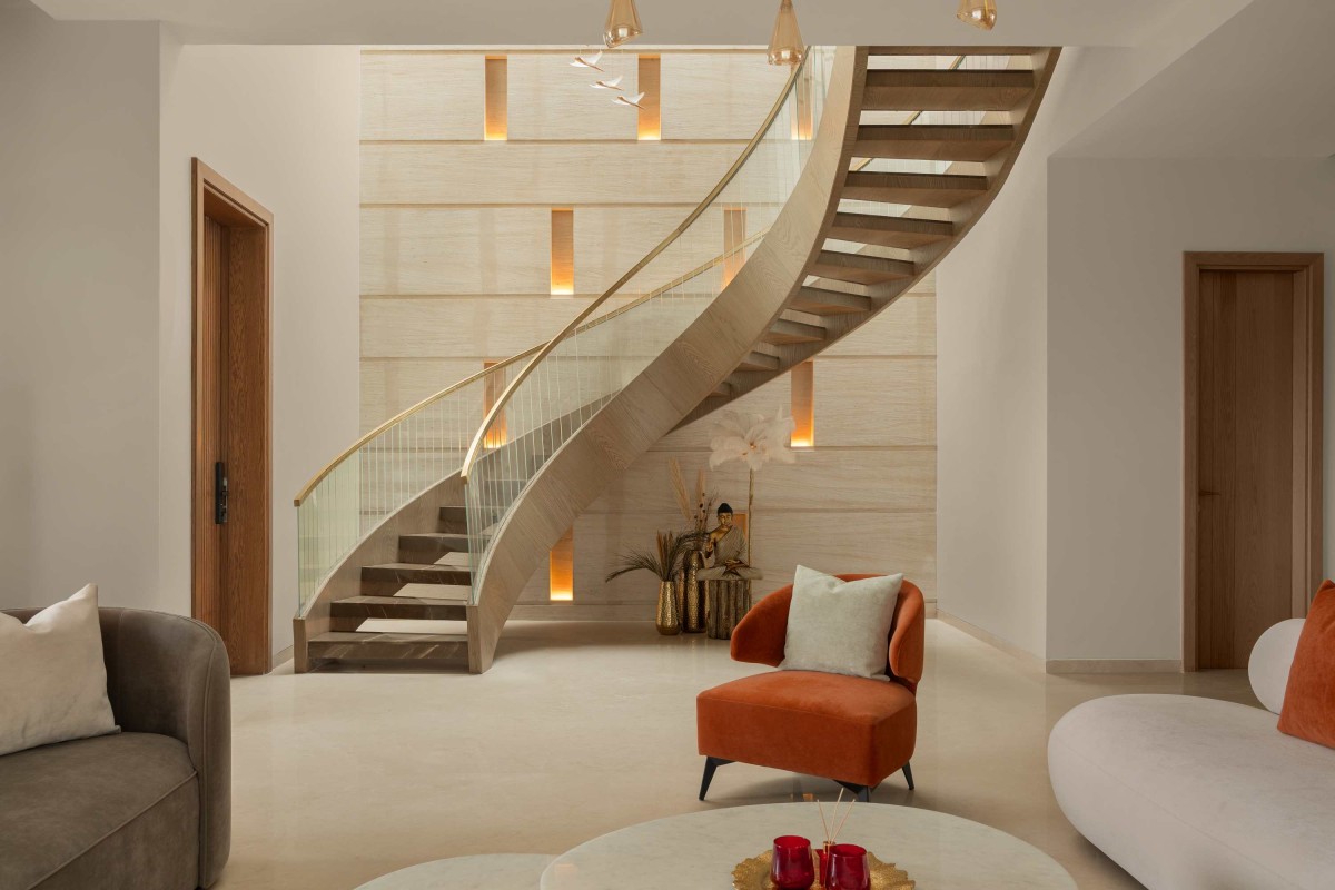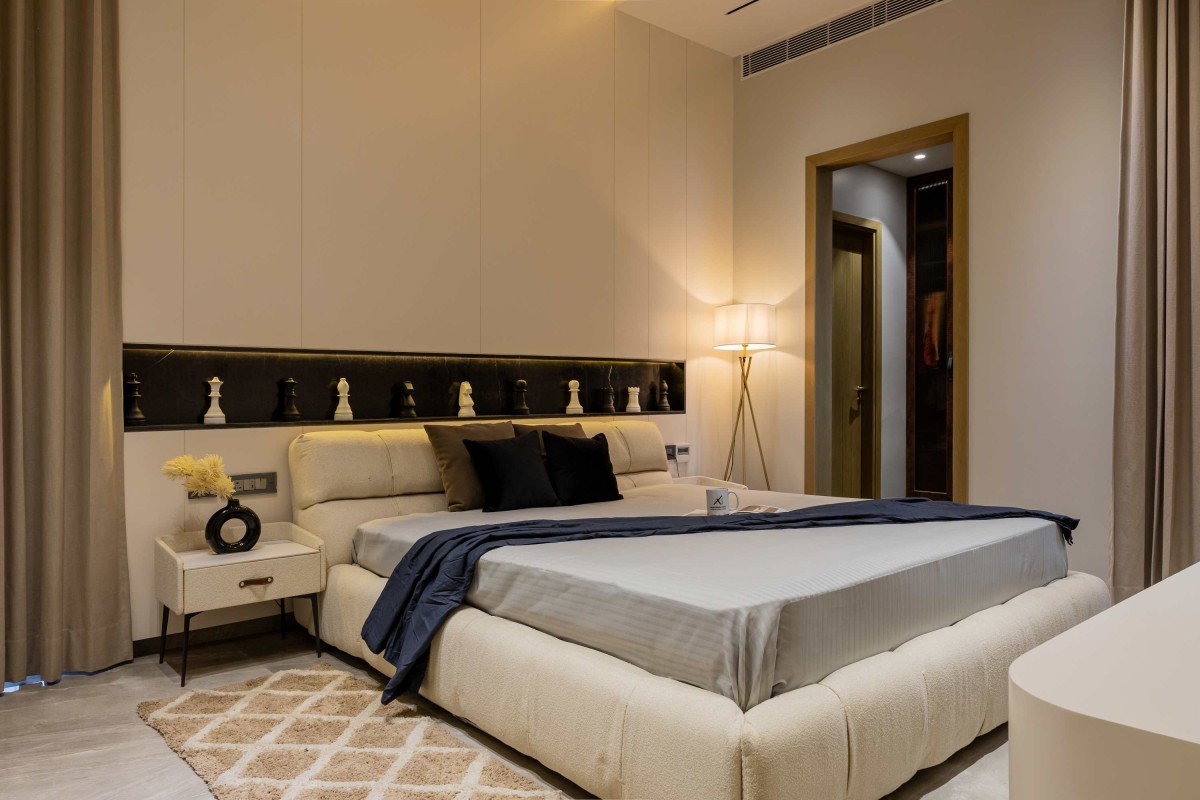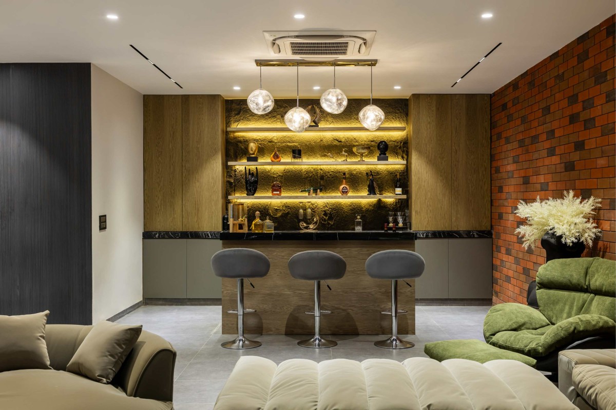 The material palette reinforces this organic sensibility: warm neutral tones, textured walls, and natural finishes like wood, linen, and stone bring a grounded, tactile richness to the space. A subtle Japandi influence—a blend of Japanese minimalism and Scandinavian warmth—shapes the interiors with clean lines, low-profile furniture, and a calming restraint in decor. The design avoids excess, focusing instead on simplicity, craftsmanship, and purposeful functionality.
