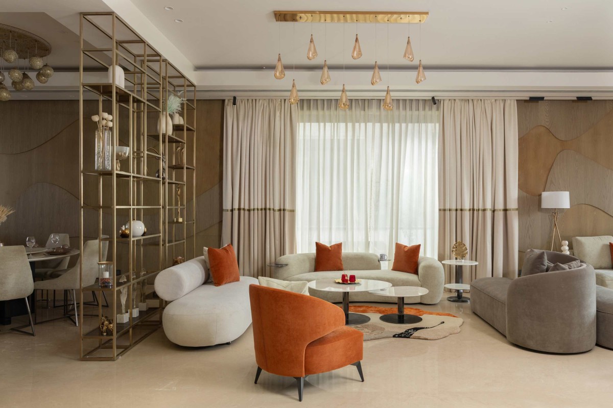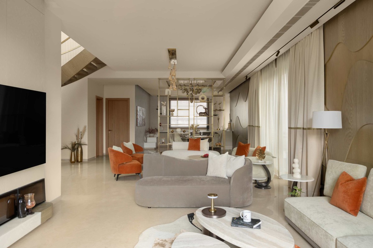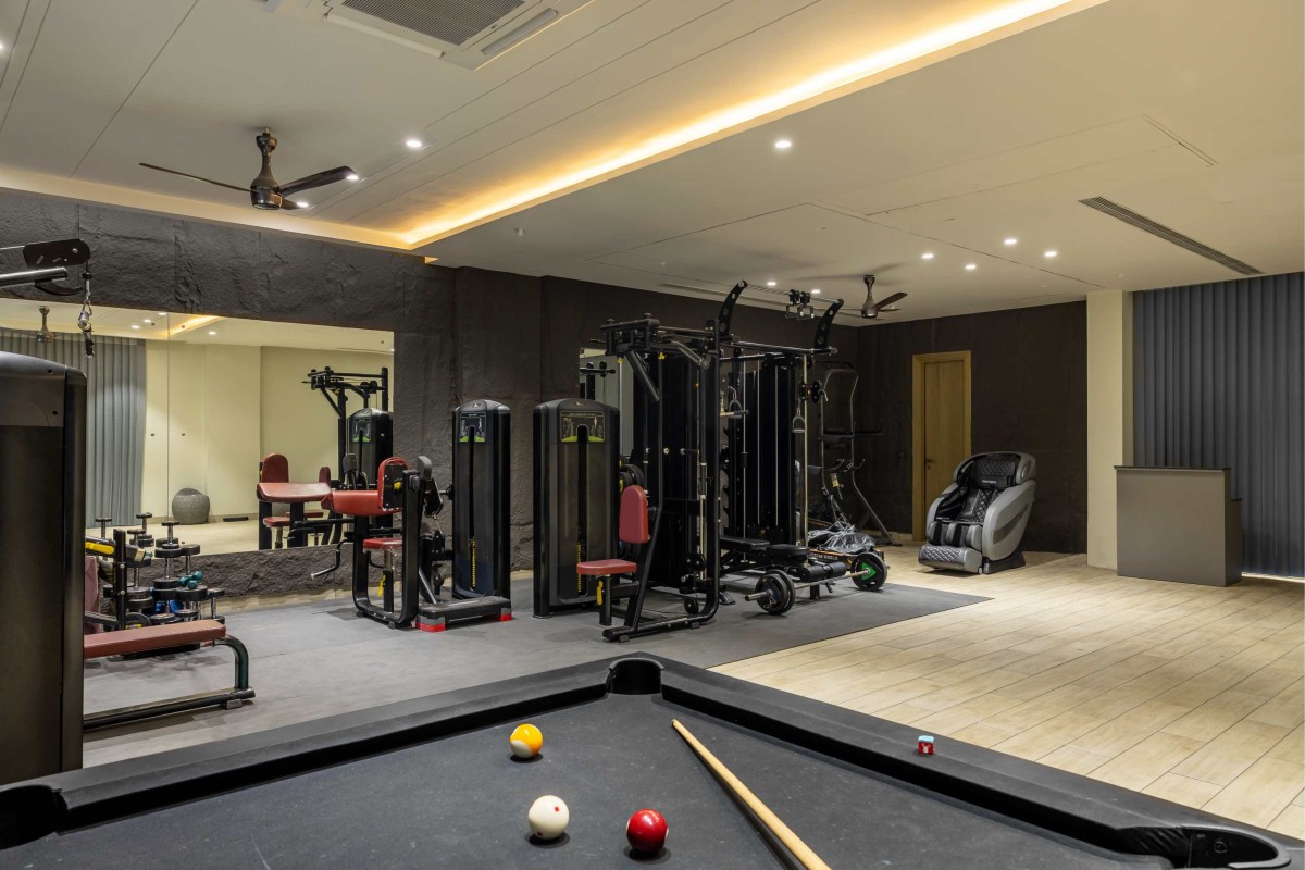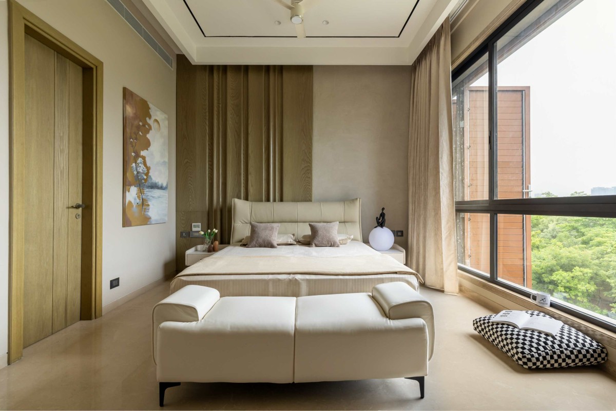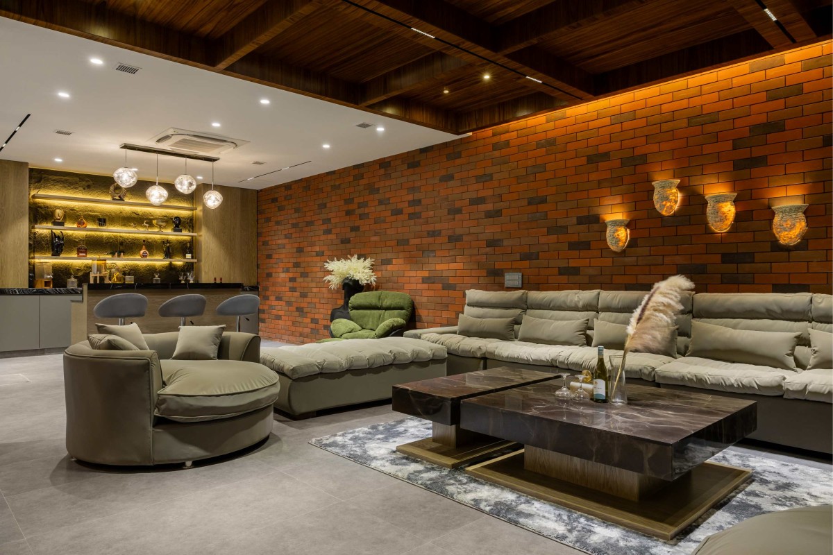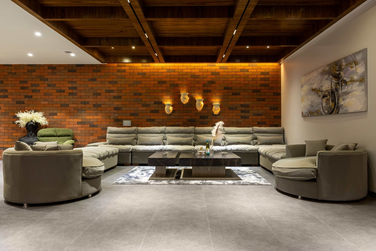 The material palette reinforces this organic sensibility: warm neutral tones, textured walls, and natural finishes like wood, linen, and stone bring a grounded, tactile richness to the space. A subtle Japandi influence—a blend of Japanese minimalism and Scandinavian warmth—shapes the interiors with clean lines, low-profile furniture, and a calming restraint in decor. The design avoids excess, focusing instead on simplicity, craftsmanship, and purposeful functionality.