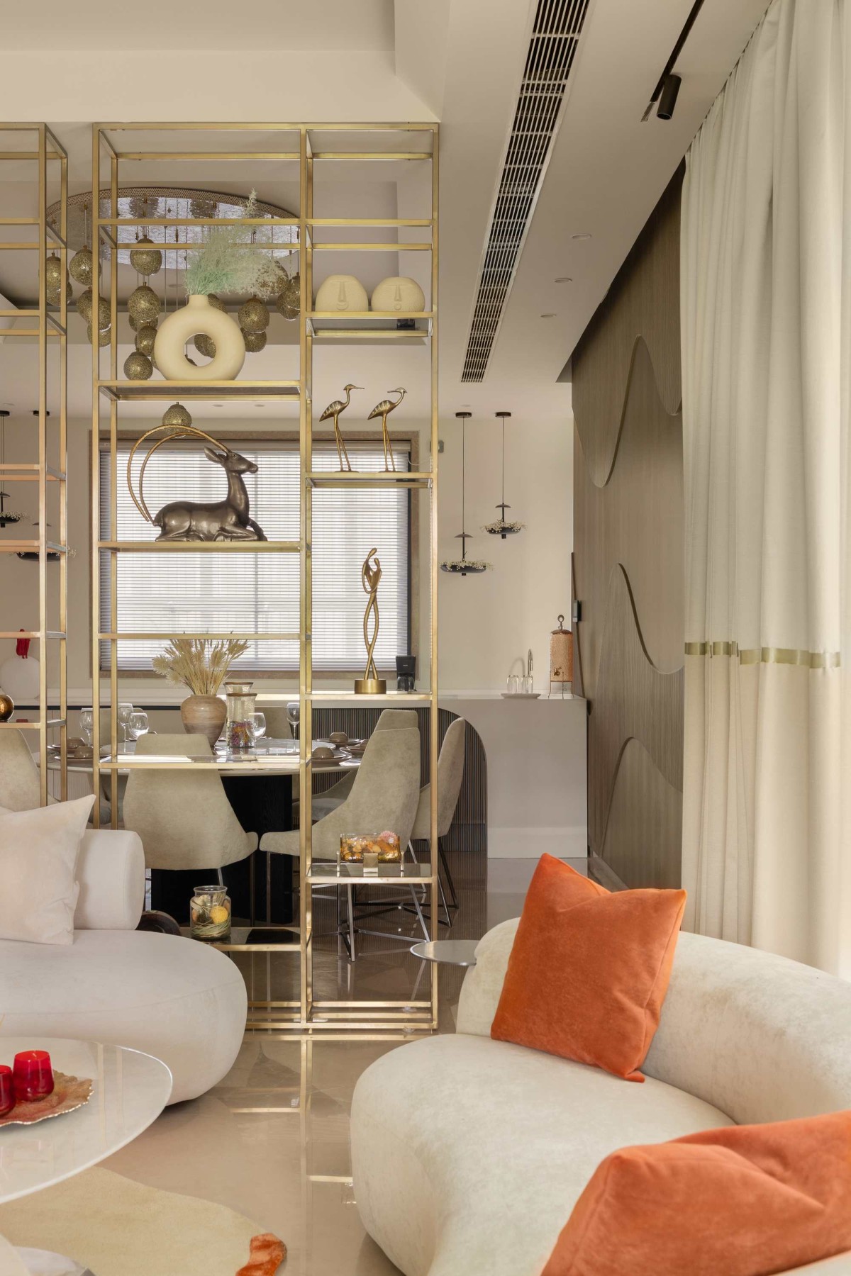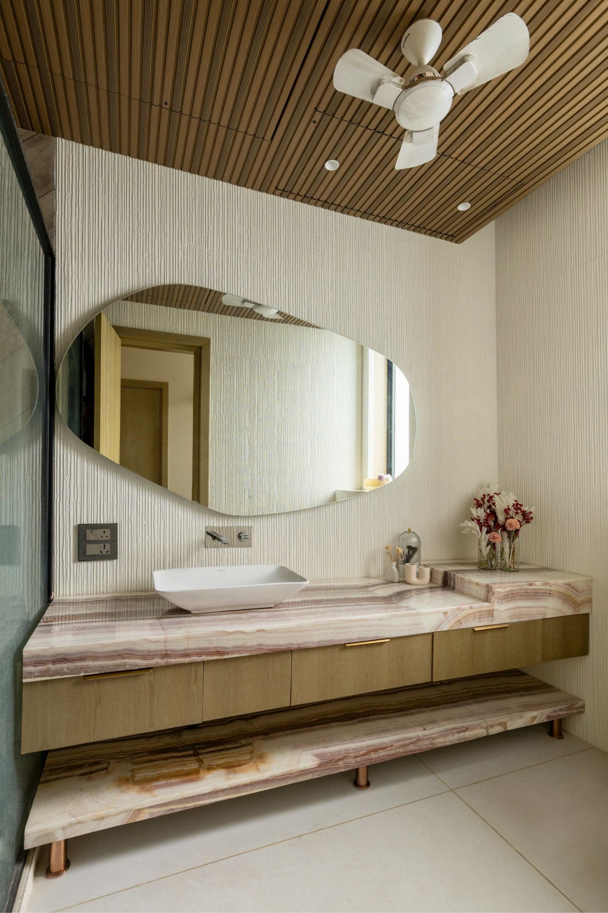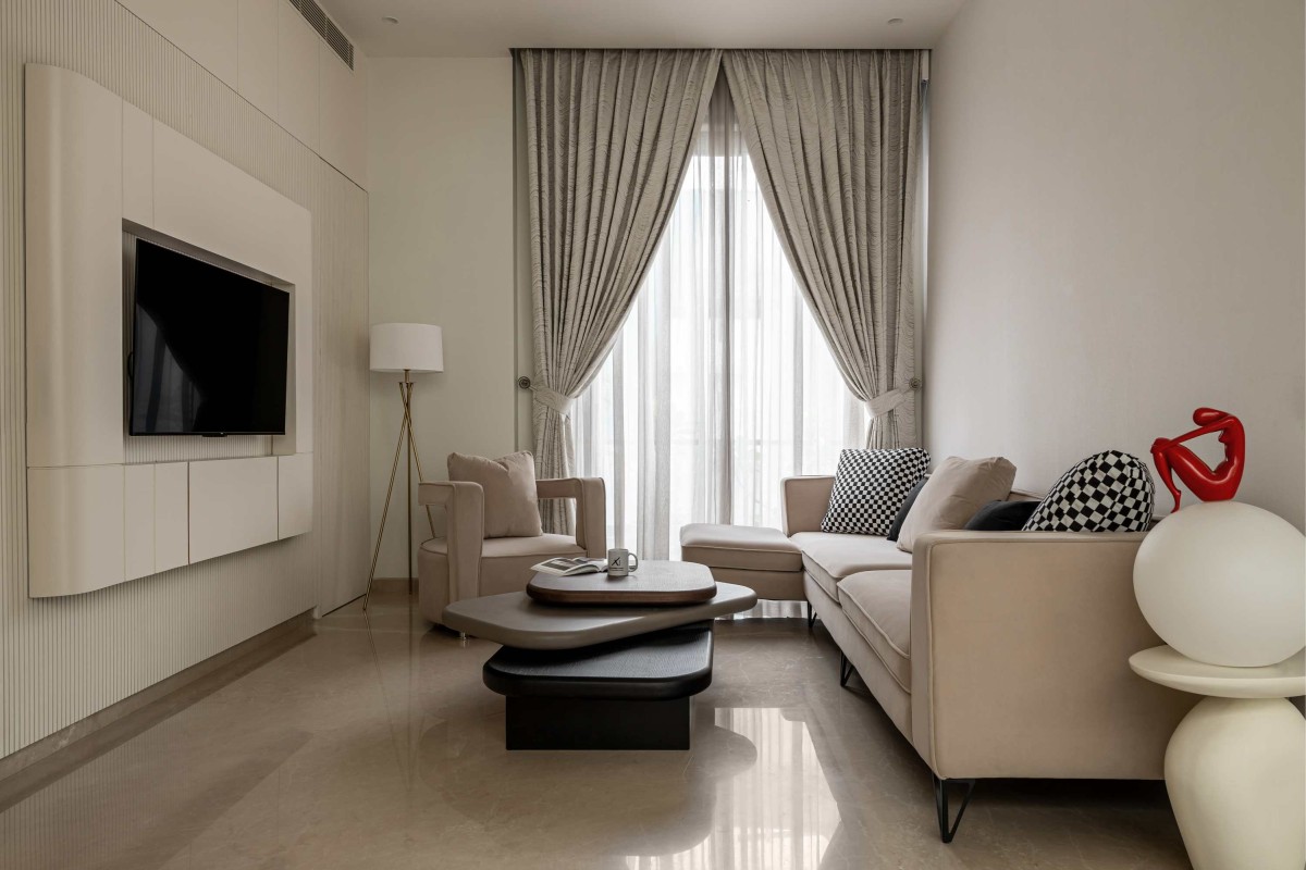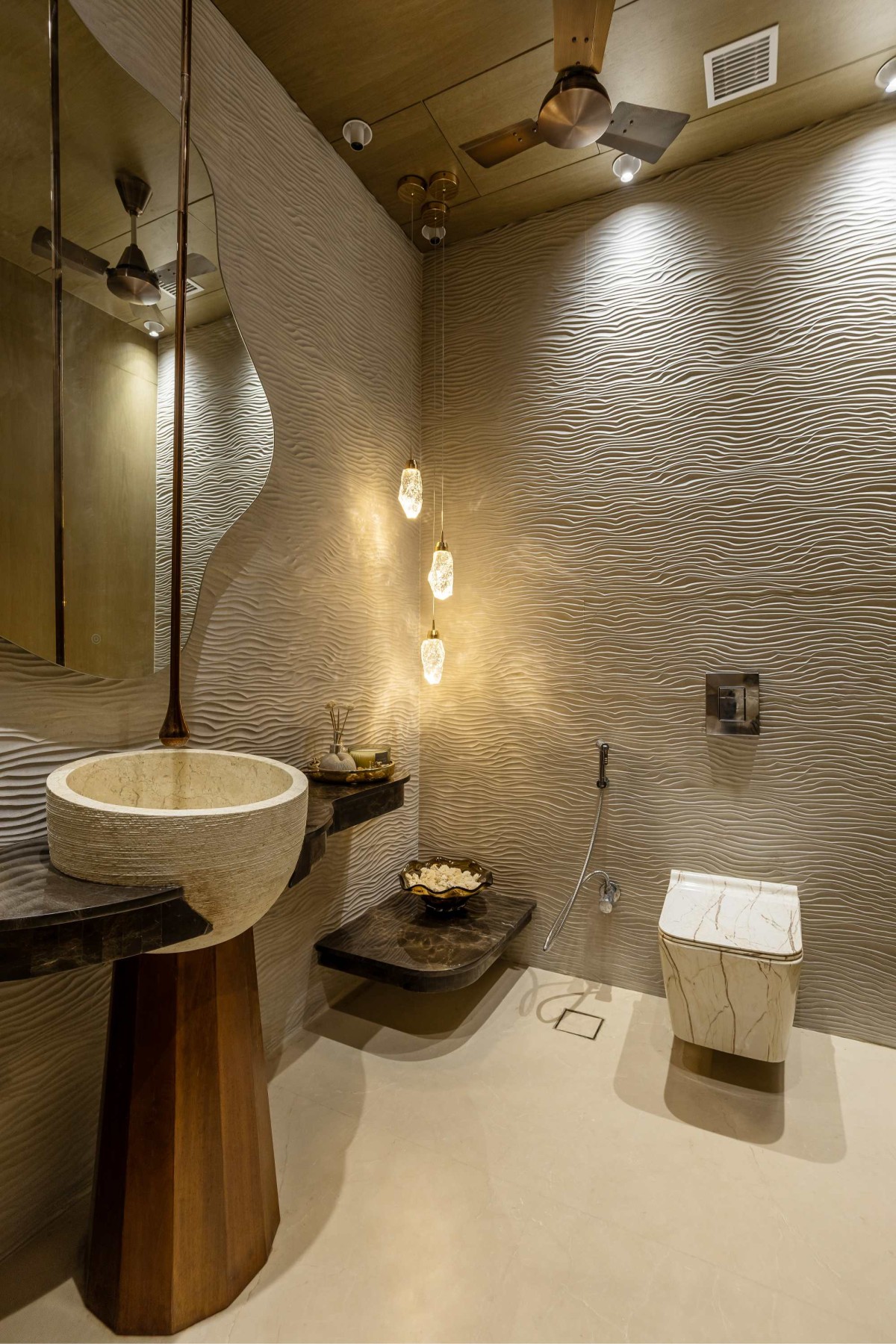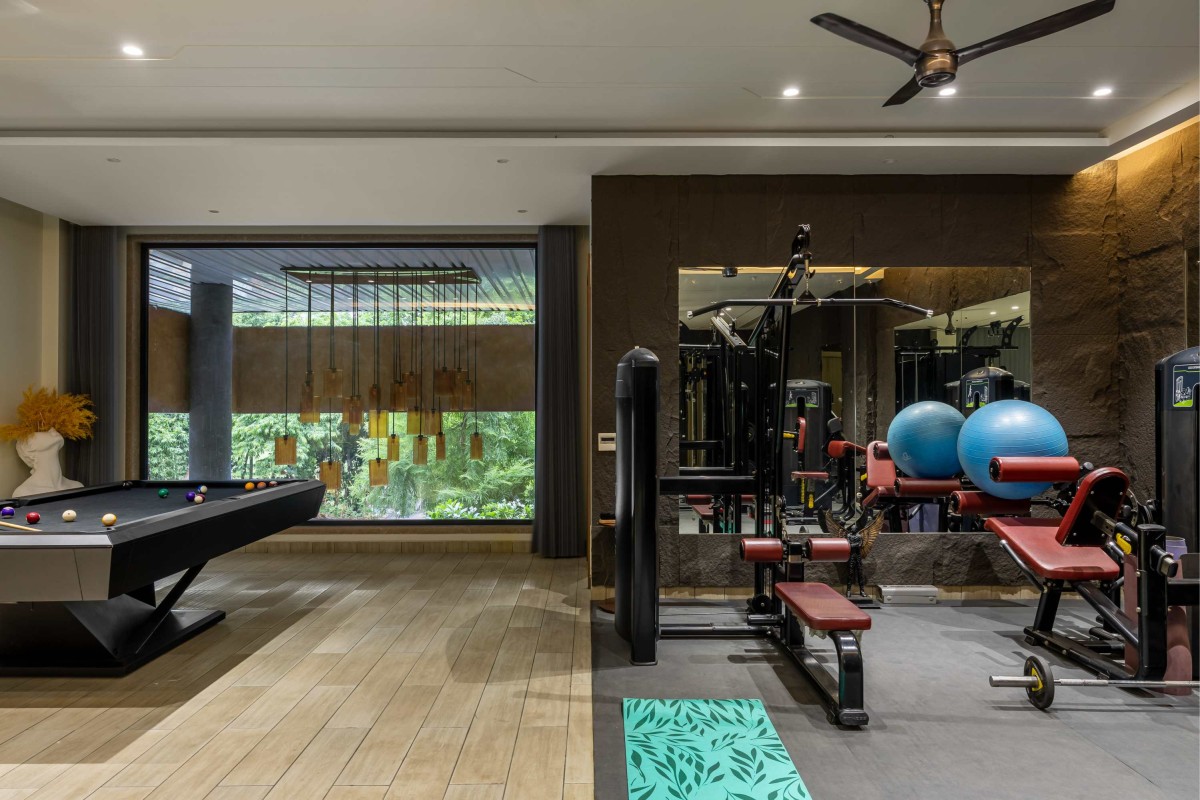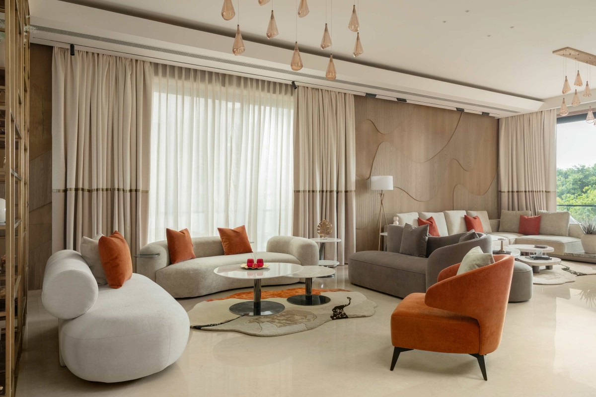 The material palette reinforces this organic sensibility: warm neutral tones, textured walls, and natural finishes like wood, linen, and stone bring a grounded, tactile richness to the space. A subtle Japandi influence—a blend of Japanese minimalism and Scandinavian warmth—shapes the interiors with clean lines, low-profile furniture, and a calming restraint in decor. The design avoids excess, focusing instead on simplicity, craftsmanship, and purposeful functionality.