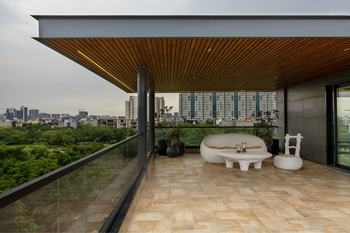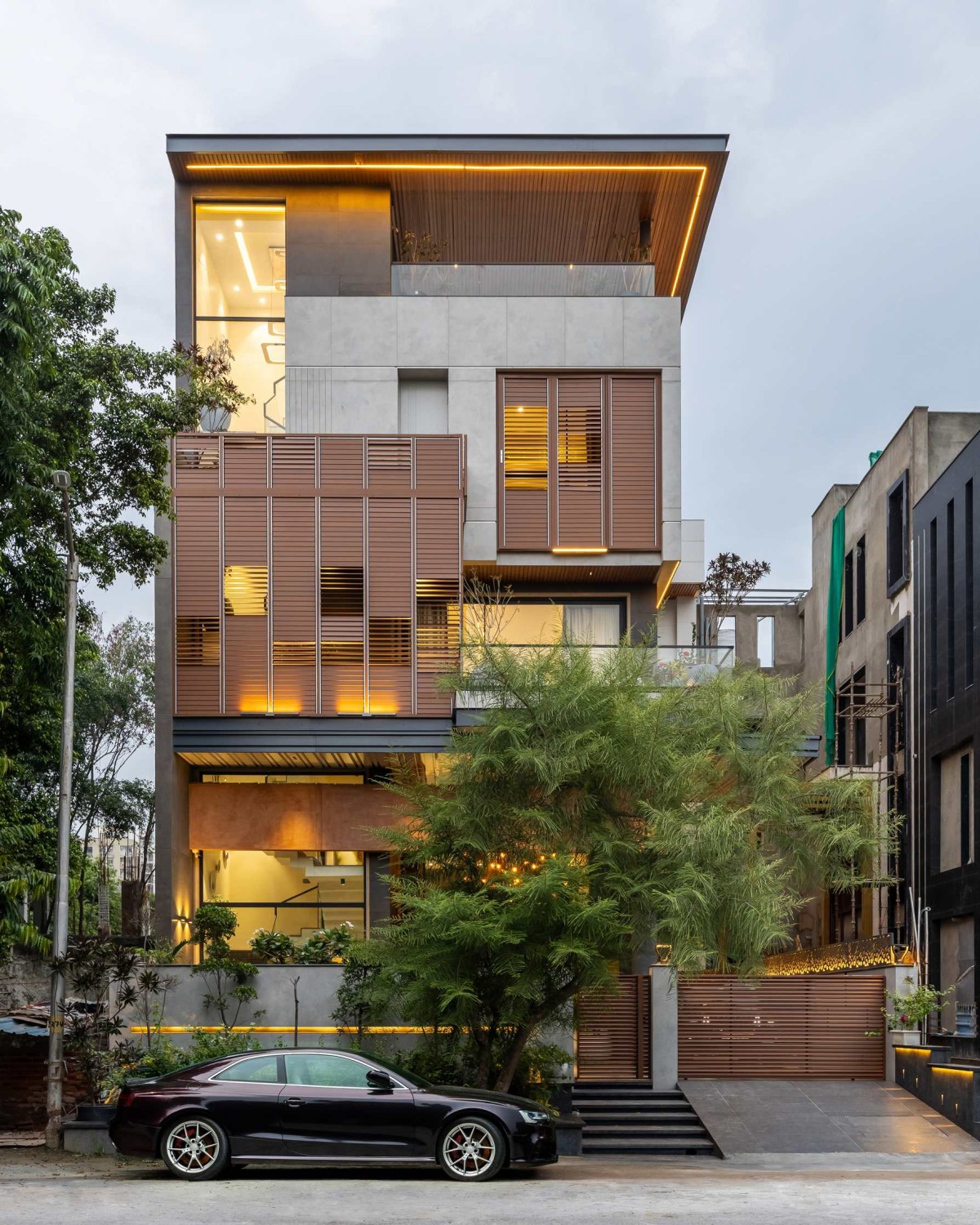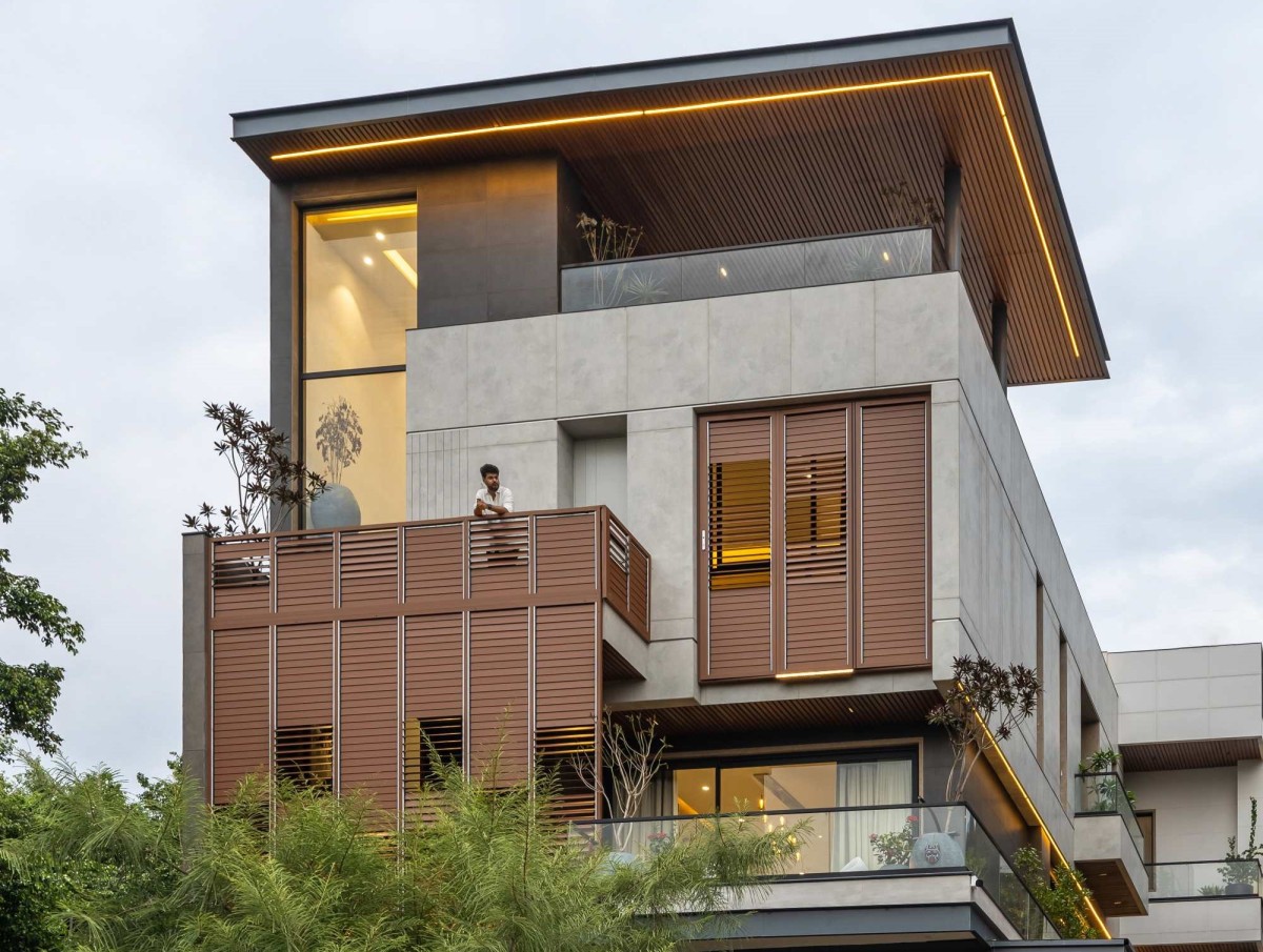 In terms of design language, the house is rooted in clean lines, functional forms, and a strong sense of vertical and horizontal balance. The rectilinear massing is articulated with setbacks, cantilevers, and terraces that create pockets of open space for natural ventilation and outdoor living. The large glazed openings are strategically placed behind the screen system, ensuring privacy while allowing filtered light to wash the interiors. At night, concealed LED lighting accentuates the architectural edges and adds a soft glow to the structure, reinforcing its sculptural quality.