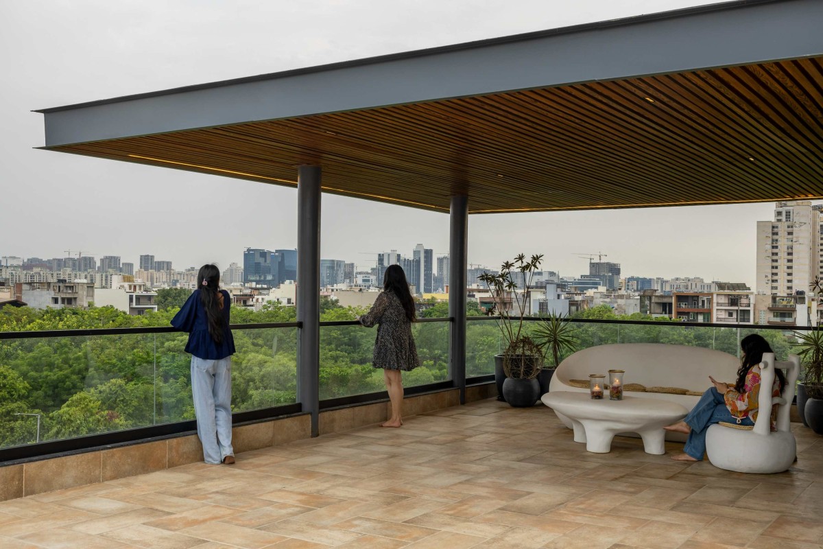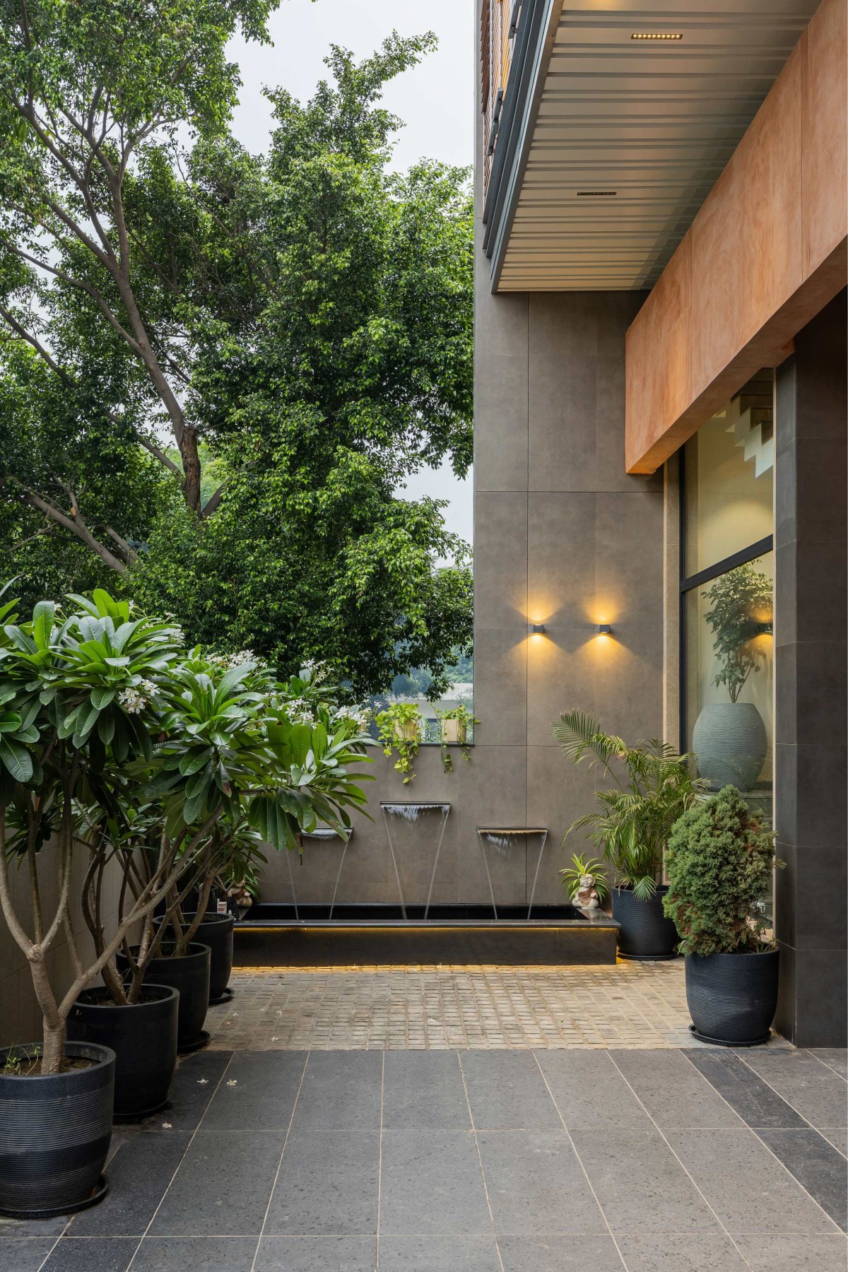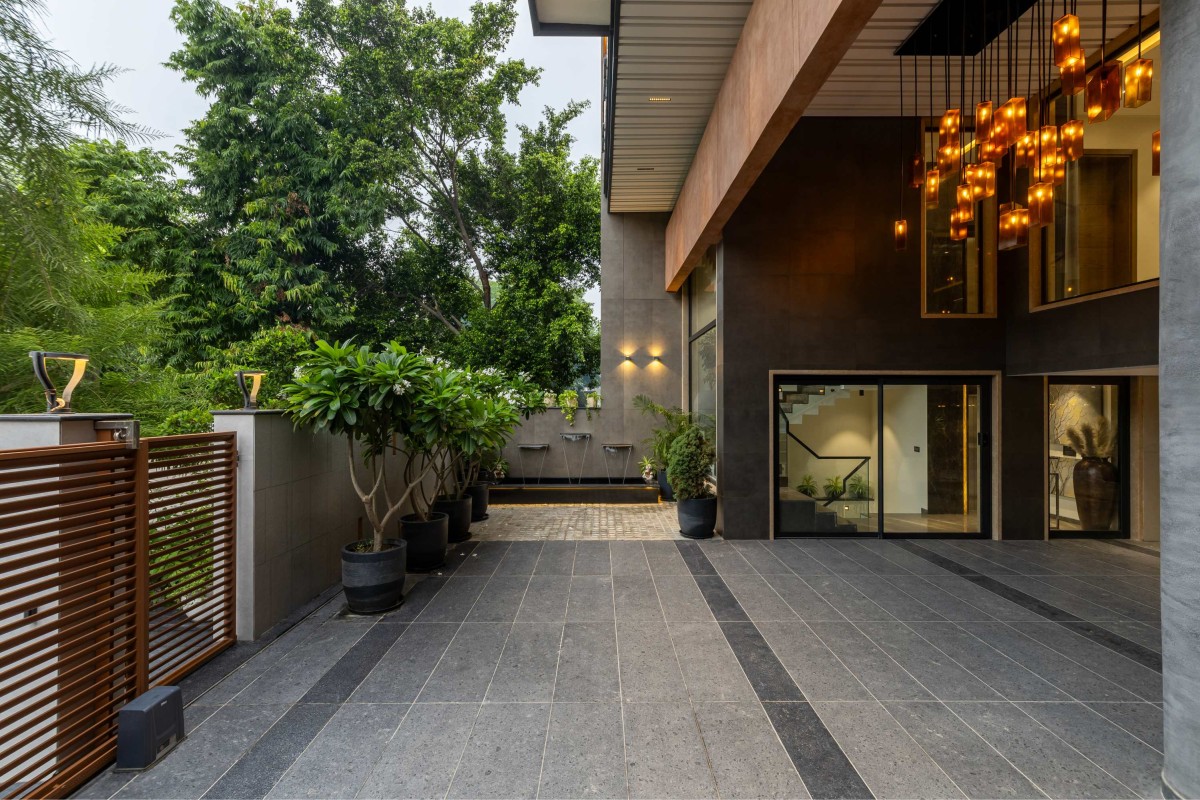 In terms of design language, the house is rooted in clean lines, functional forms, and a strong sense of vertical and horizontal balance. The rectilinear massing is articulated with setbacks, cantilevers, and terraces that create pockets of open space for natural ventilation and outdoor living. The large glazed openings are strategically placed behind the screen system, ensuring privacy while allowing filtered light to wash the interiors. At night, concealed LED lighting accentuates the architectural edges and adds a soft glow to the structure, reinforcing its sculptural quality.