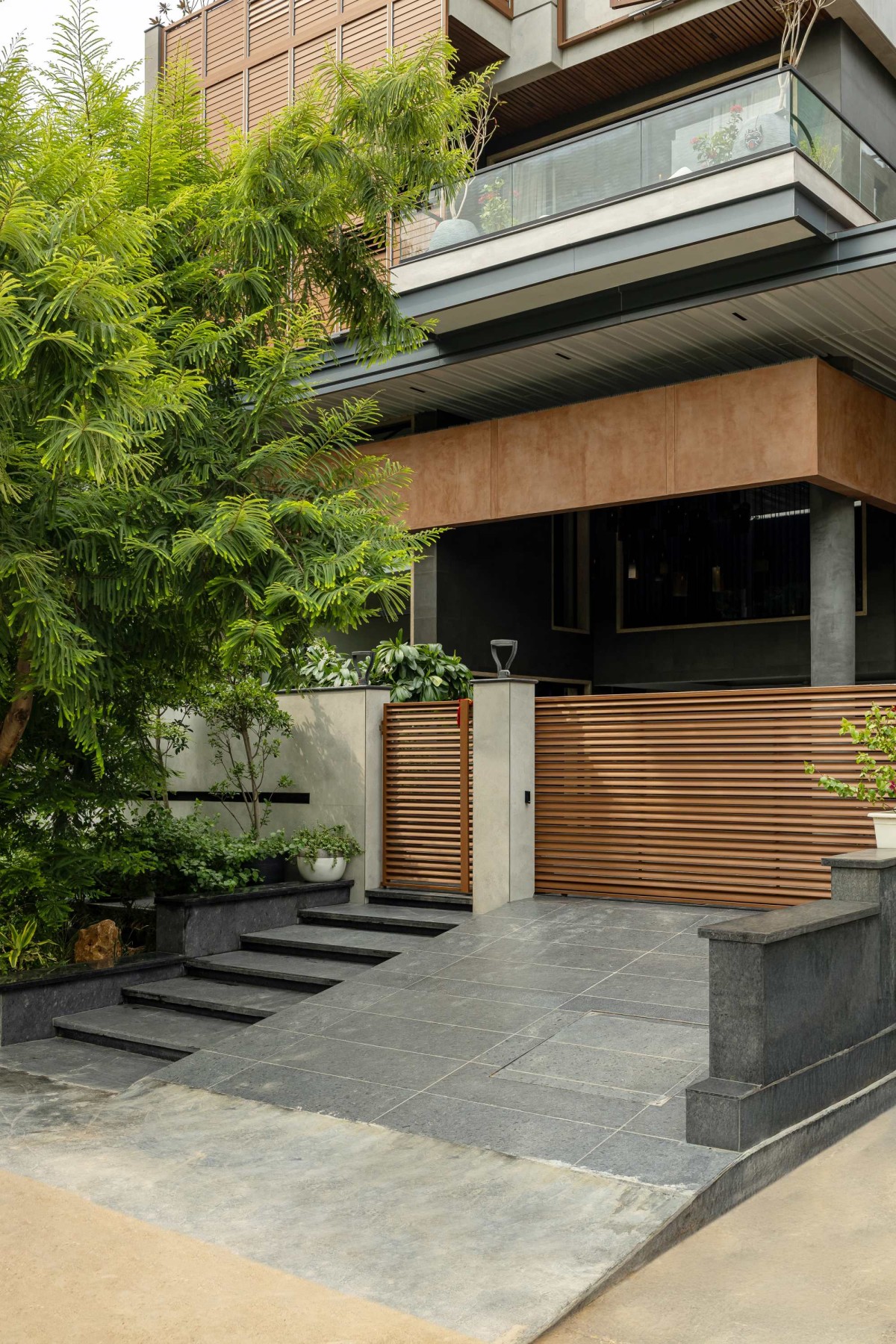The bungalow, tucked into a dense urban fabric, this southwest-facing residence is a refined expression of contextual and climate-responsive modern architecture. The home embraces its orientation with an intelligent façade design that balances aesthetic appeal and environmental performance. With the sun’s harshest rays hitting the structure in the latter half of the day, the architects incorporated a system of sliding and folding louvered screens, not only as a shading strategy but also as a defining visual element of the building’s character.