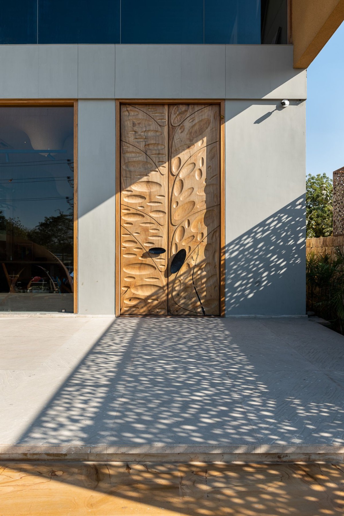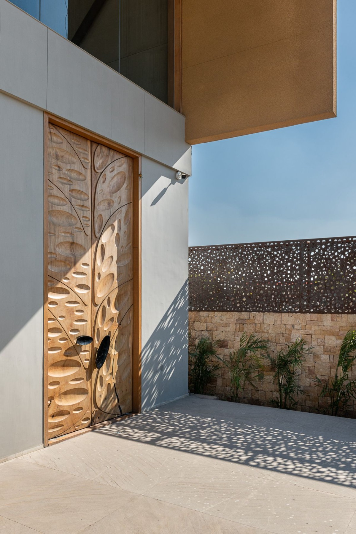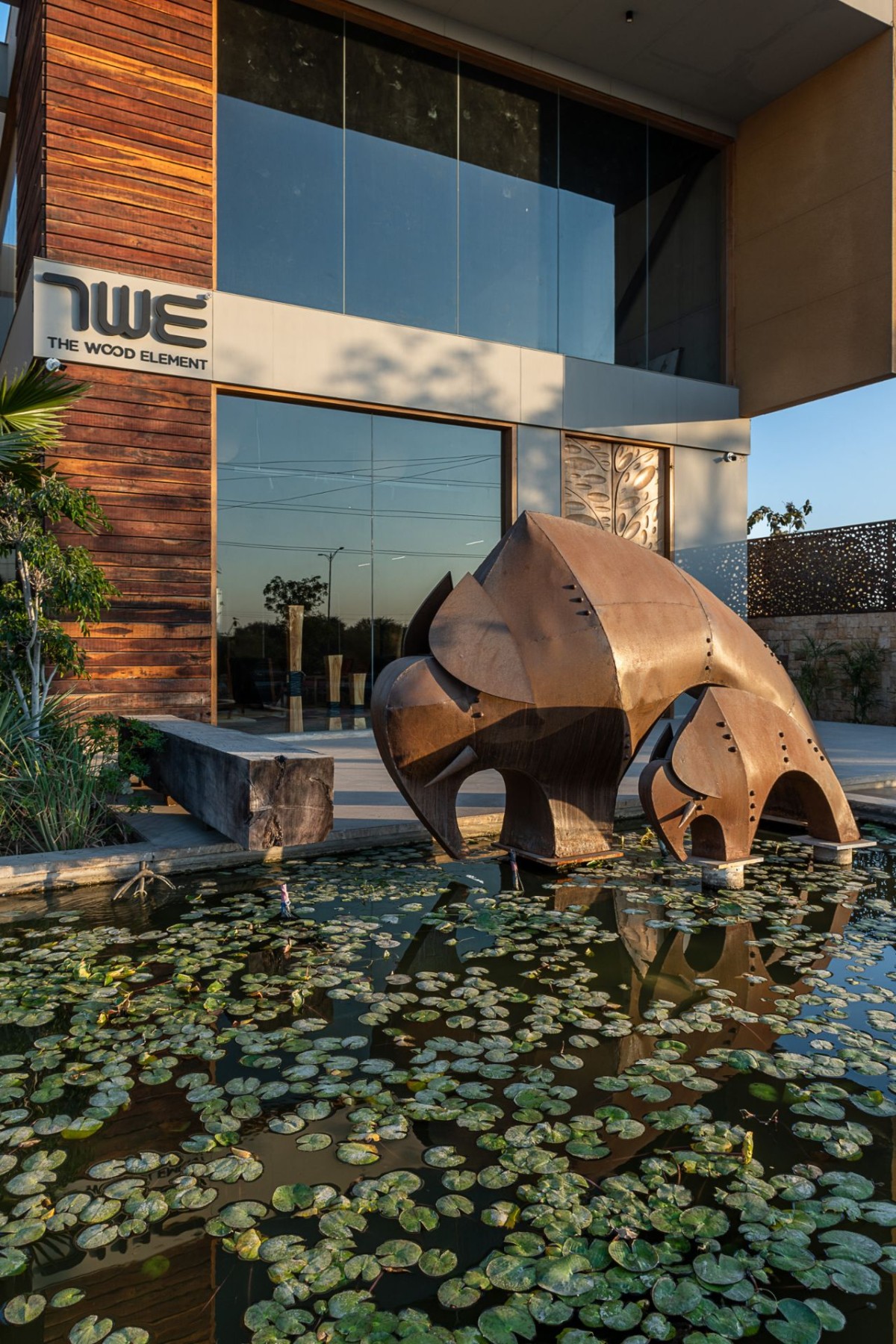 The entrance of the building is highlighted by a serene waterbody with a sit-out, animated by golden-hued koi and lush water lilies. A striking elephant sculpture adds an interesting dimension to this outdoor courtyard of sorts. The west facade of the building is rendered in glass, with a 13-foot-tall entrance door with a scooped-out pattern on its wooden surface.