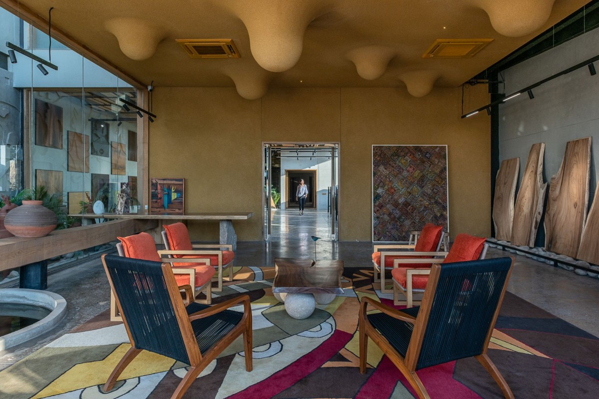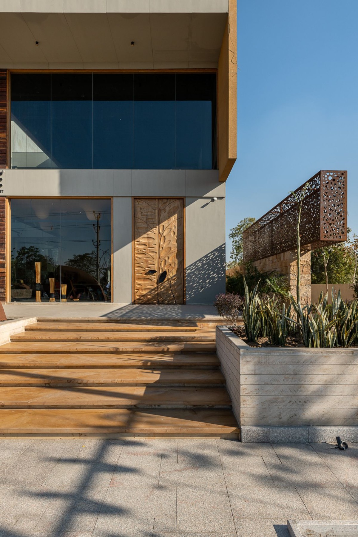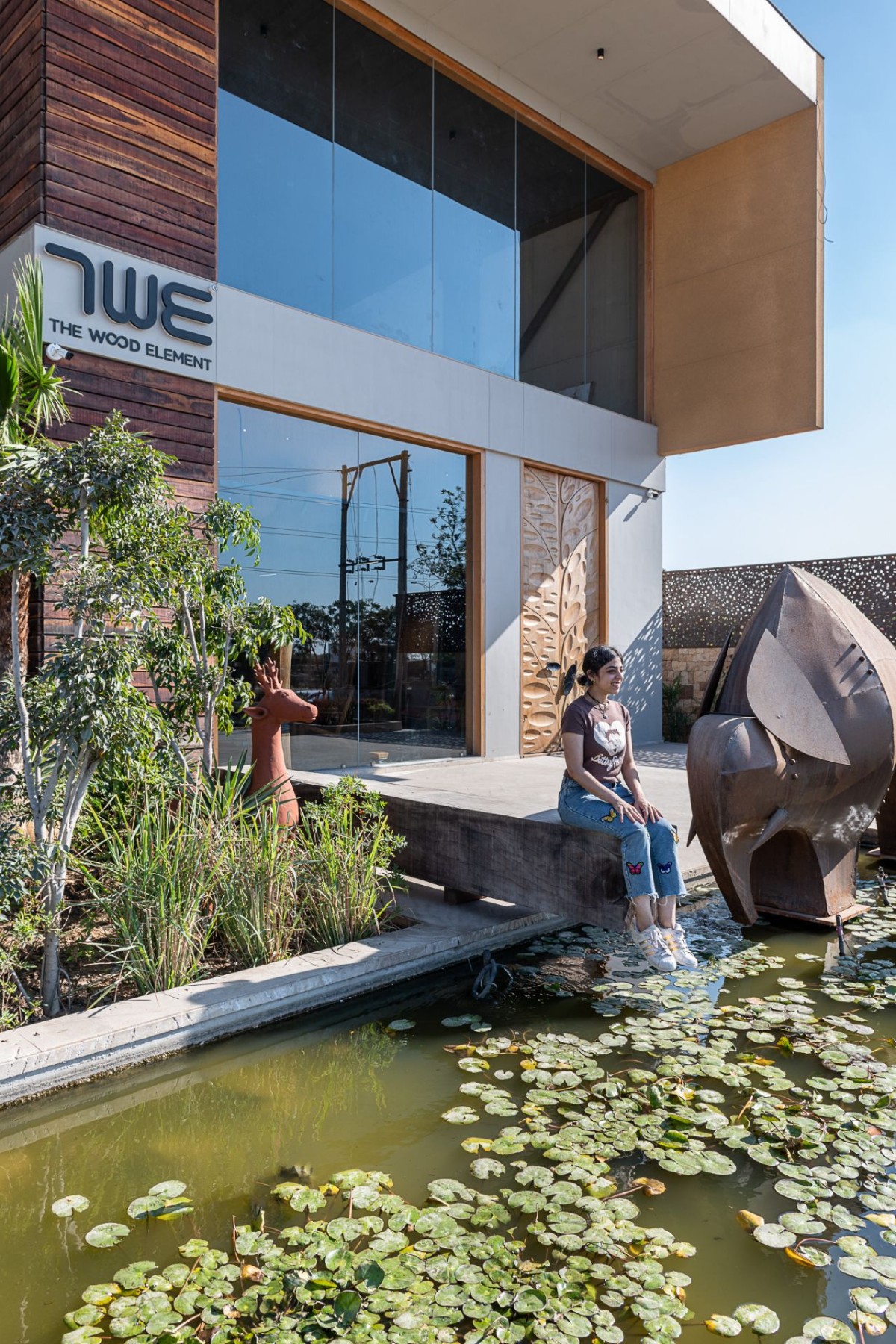 The entrance of the building is highlighted by a serene waterbody with a sit-out, animated by golden-hued koi and lush water lilies. A striking elephant sculpture adds an interesting dimension to this outdoor courtyard of sorts. The west facade of the building is rendered in glass, with a 13-foot-tall entrance door with a scooped-out pattern on its wooden surface.