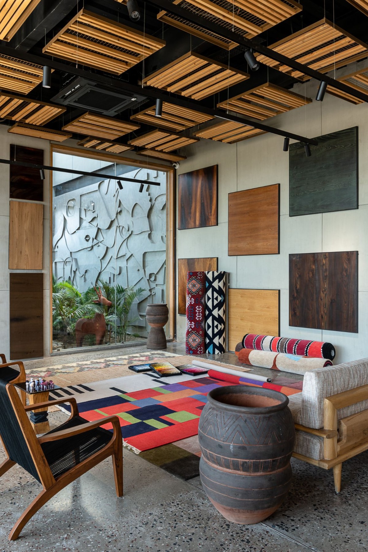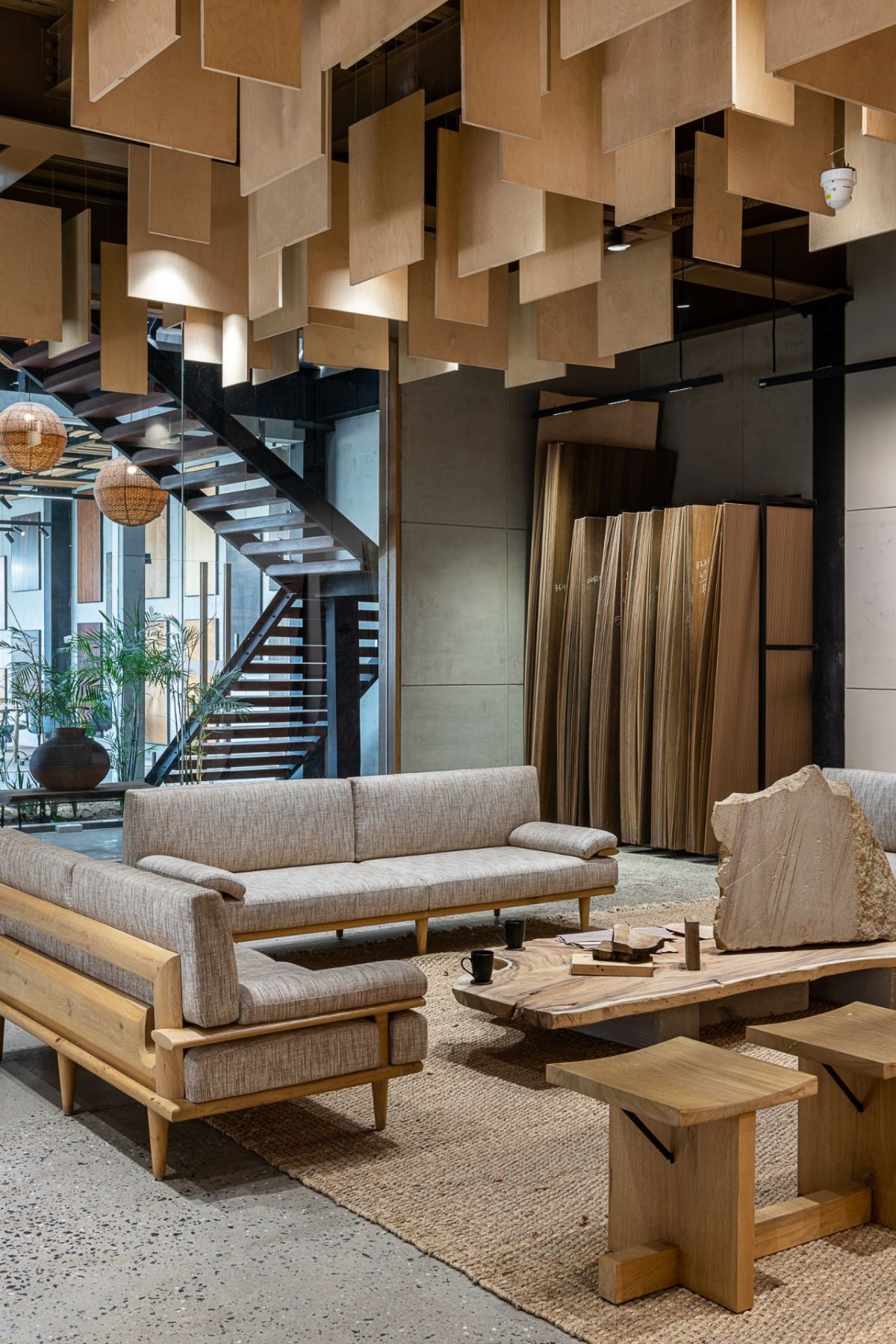 As we move further into the retail space, details of the wooden logs and curated carpets come into view. The ceiling here is designed using reclaimed wooden panels from the company’s workshop and factory, skilfully woven with built-in lighting. Casual places to sit and small meeting tables to contemplate purchase decisions engender a chic, comfortable atmosphere.