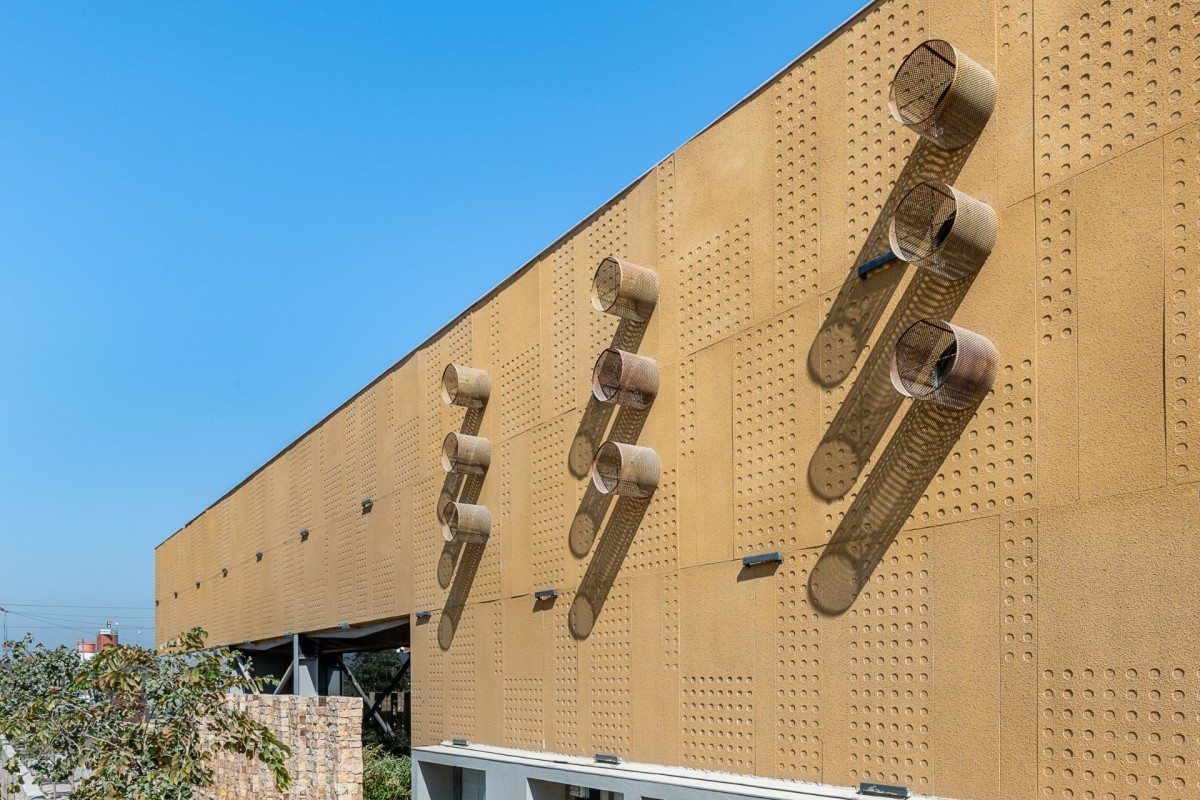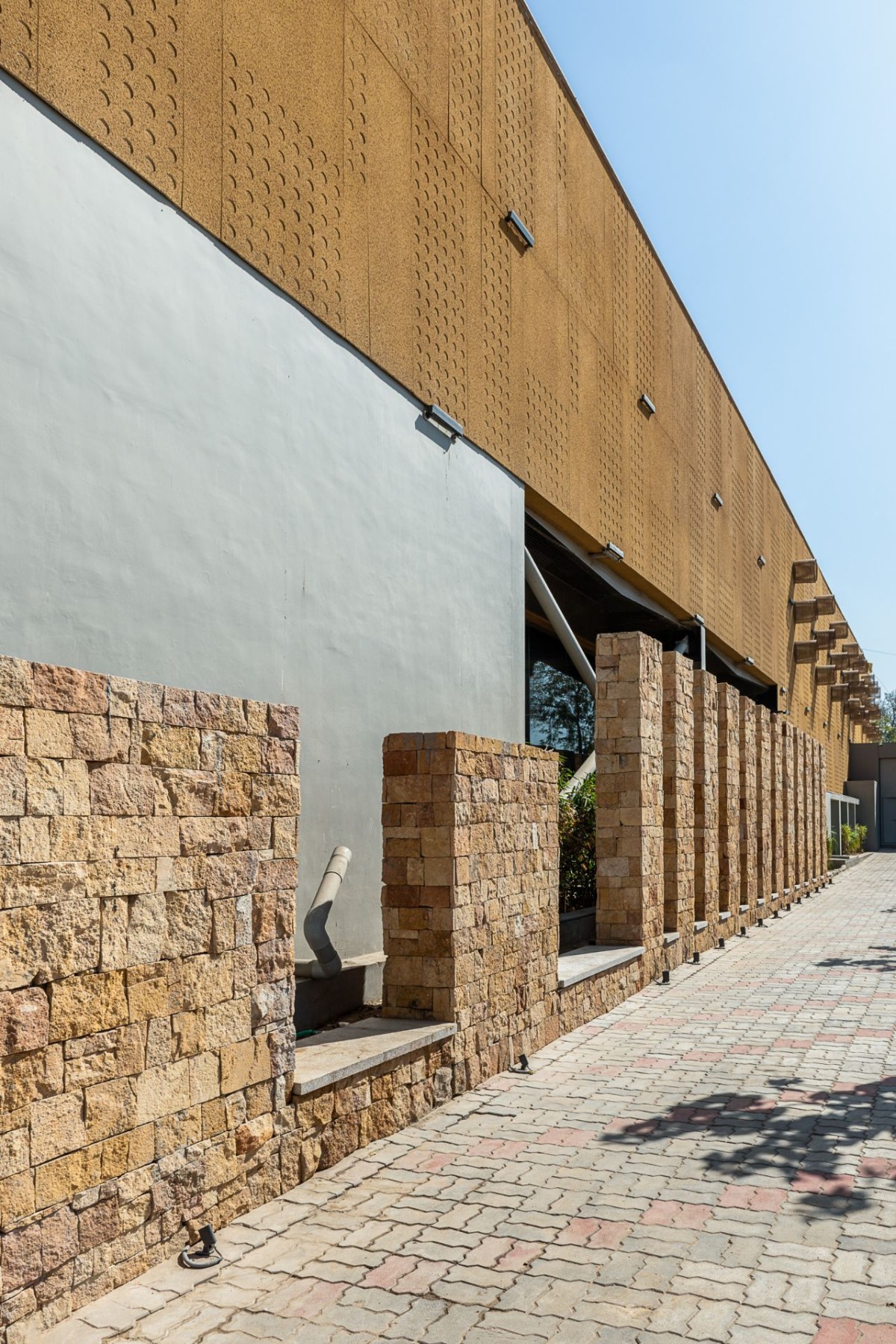 The elevation uses organic materials that indicate the sense of rootedness and proximity to Mother Earth that is so integral to the narrative. Local sandstone plays the leading role in a line-up featuring wood and sand-faced plaster, orchestrated in a pleasing graphical manner. A monolithic material application of sand plaster bearing a debossed pattern of circles underscores the clean linearity of the structure. The architectural skin features large openings that blur the boundary between the interior and exterior, while also facilitating natural ventilation and sunlight. The southwest façade features a series of sandstone columns that help alleviate the heat of the region as well as filter the harsh sunlight in that direction. On the first floor, the long, metal-mesh shades of the porthole-like windows cast long shadows, creating an intriguing sciagraphy.