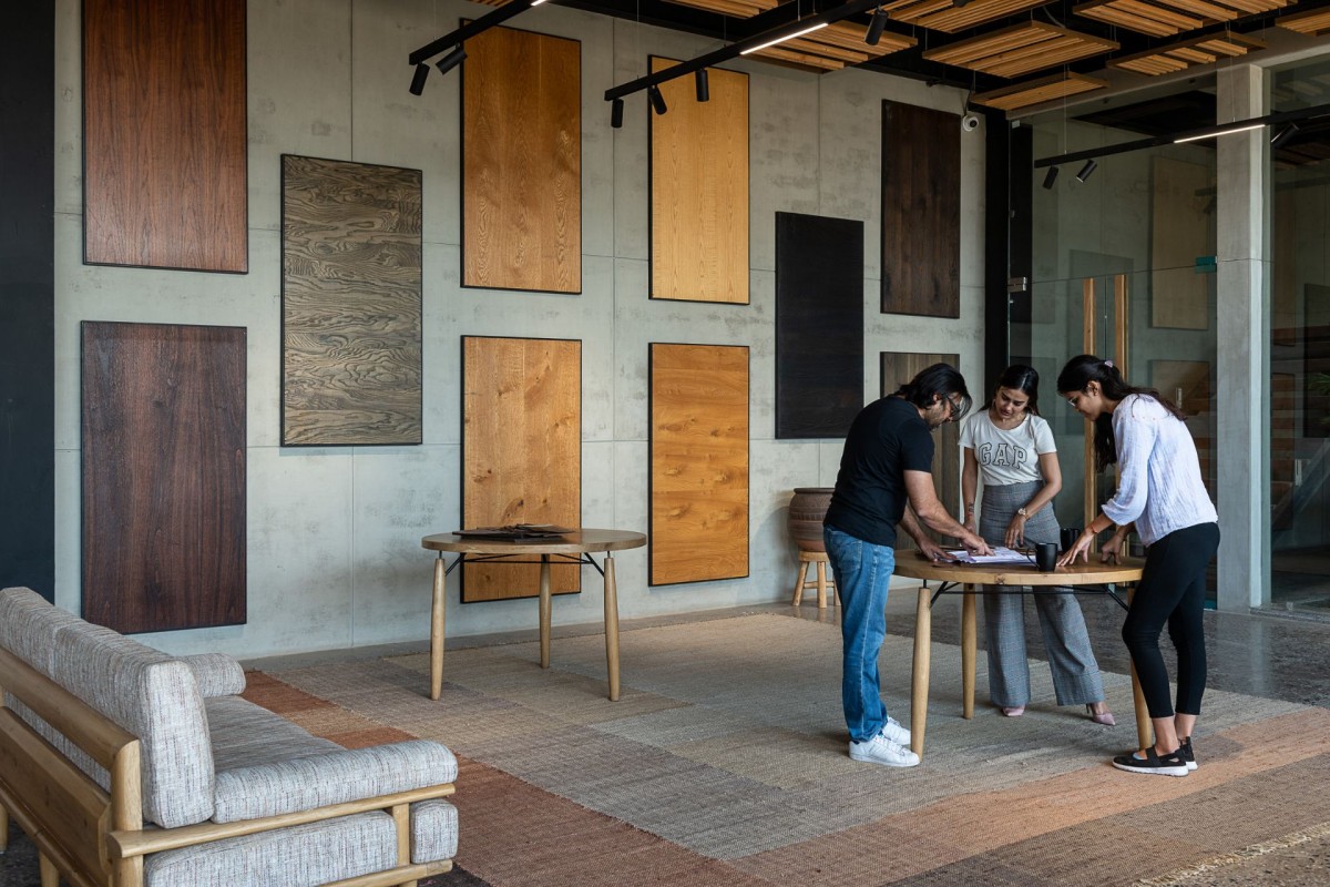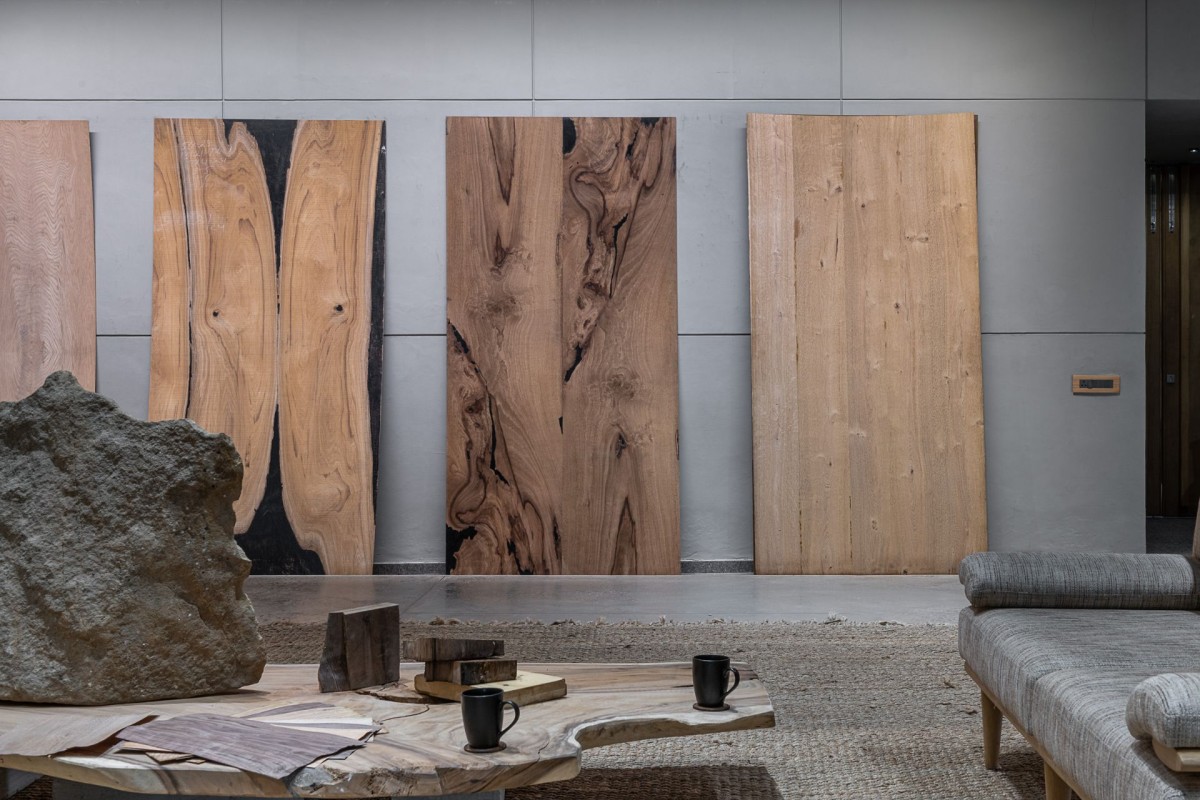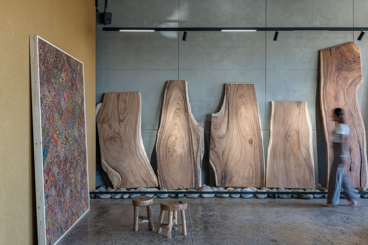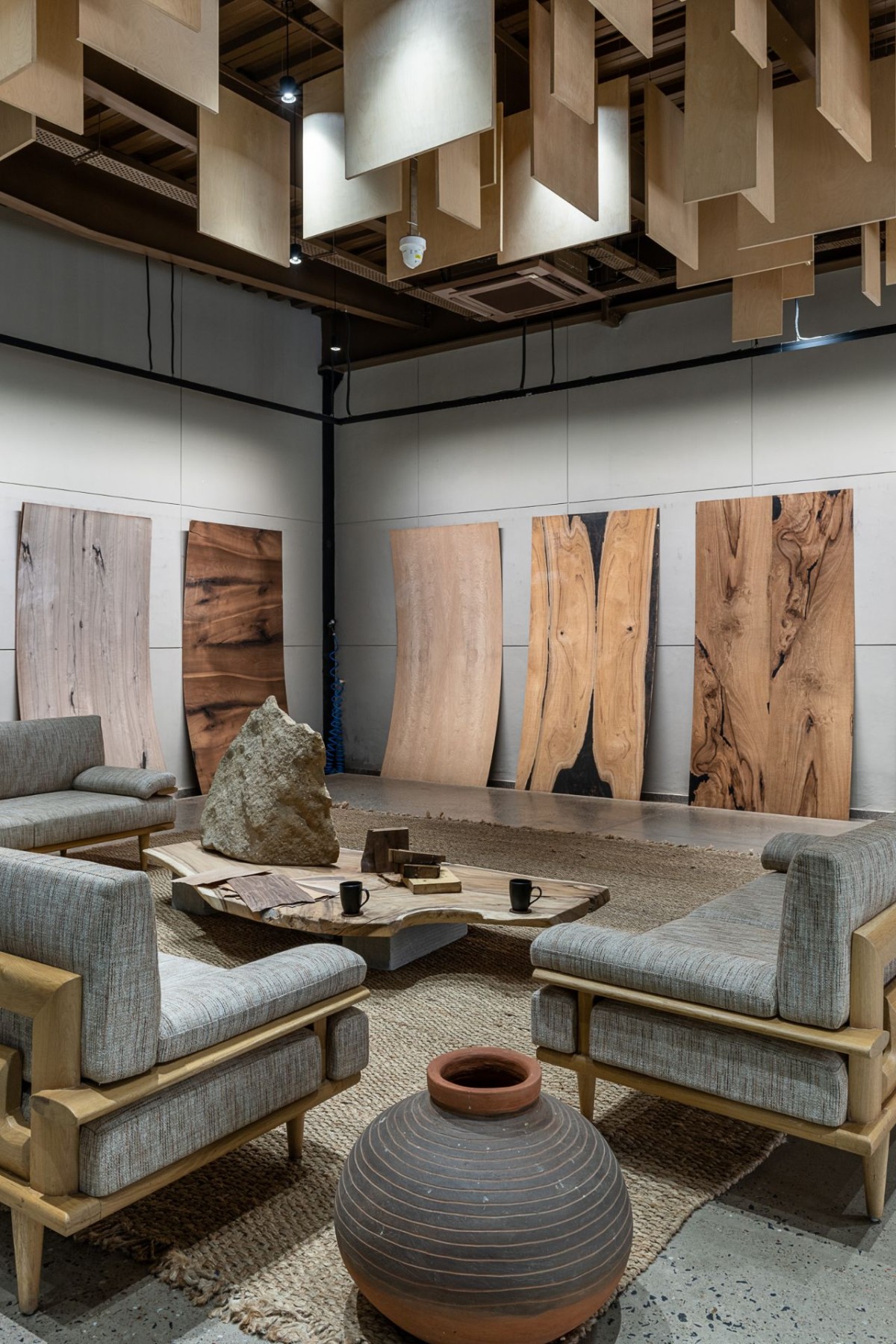 The aesthetic value and inherent beauty of wood as a natural material is projected effectively through products as well as interior elements. Live-edge tables, consoles made of dressed logs and ceiling design concocted out of wood waste as well as wood panels speak of the material that occupies the central position in the narrative. In addition to this aesthetic functionality, the product themselves are treated as objects to be admired and cherished. In some places, they are treated as wall-mounted art, in others as wooden expanses emerging from a sea of large pebbles. Elsewhere, their warmth gets intensified under the positive munificence of the sun. All these strategies are geared towards providing personalized advice and services to the customer, bolstered by digital-free, tactile product experience riding on a wave of a renewed post-pandemic interest in meeting and greeting people.