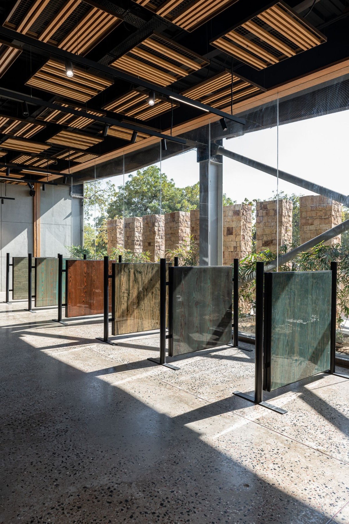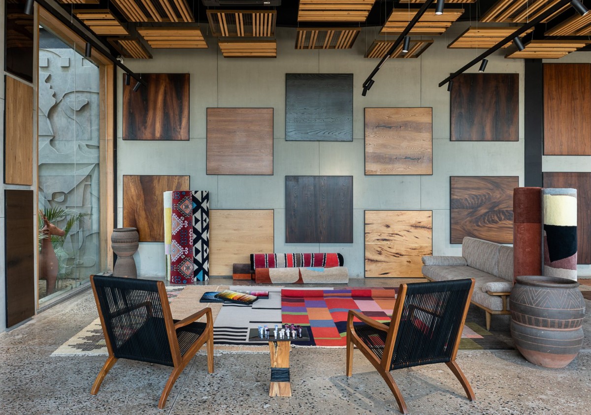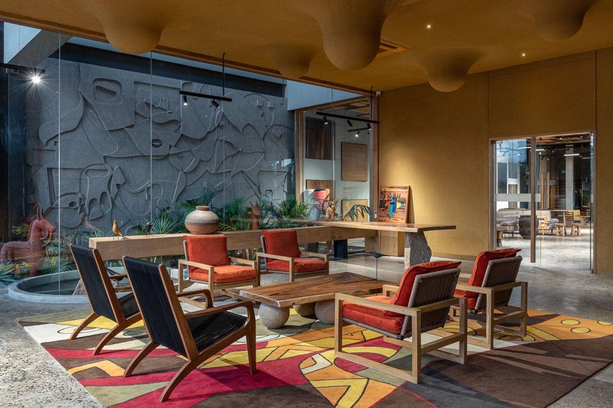 The aesthetic value and inherent beauty of wood as a natural material is projected effectively through products as well as interior elements. Live-edge tables, consoles made of dressed logs and ceiling design concocted out of wood waste as well as wood panels speak of the material that occupies the central position in the narrative. In addition to this aesthetic functionality, the product themselves are treated as objects to be admired and cherished. In some places, they are treated as wall-mounted art, in others as wooden expanses emerging from a sea of large pebbles. Elsewhere, their warmth gets intensified under the positive munificence of the sun. All these strategies are geared towards providing personalized advice and services to the customer, bolstered by digital-free, tactile product experience riding on a wave of a renewed post-pandemic interest in meeting and greeting people.