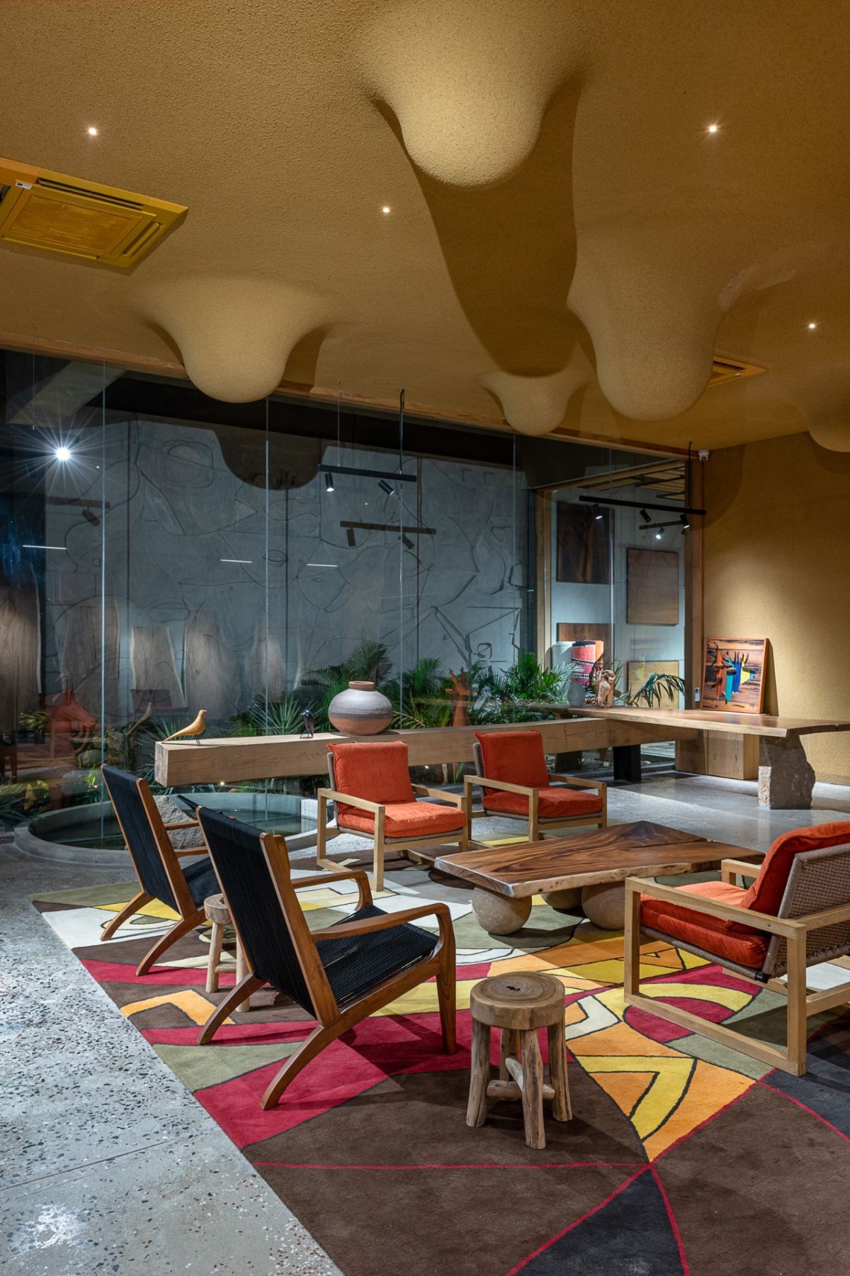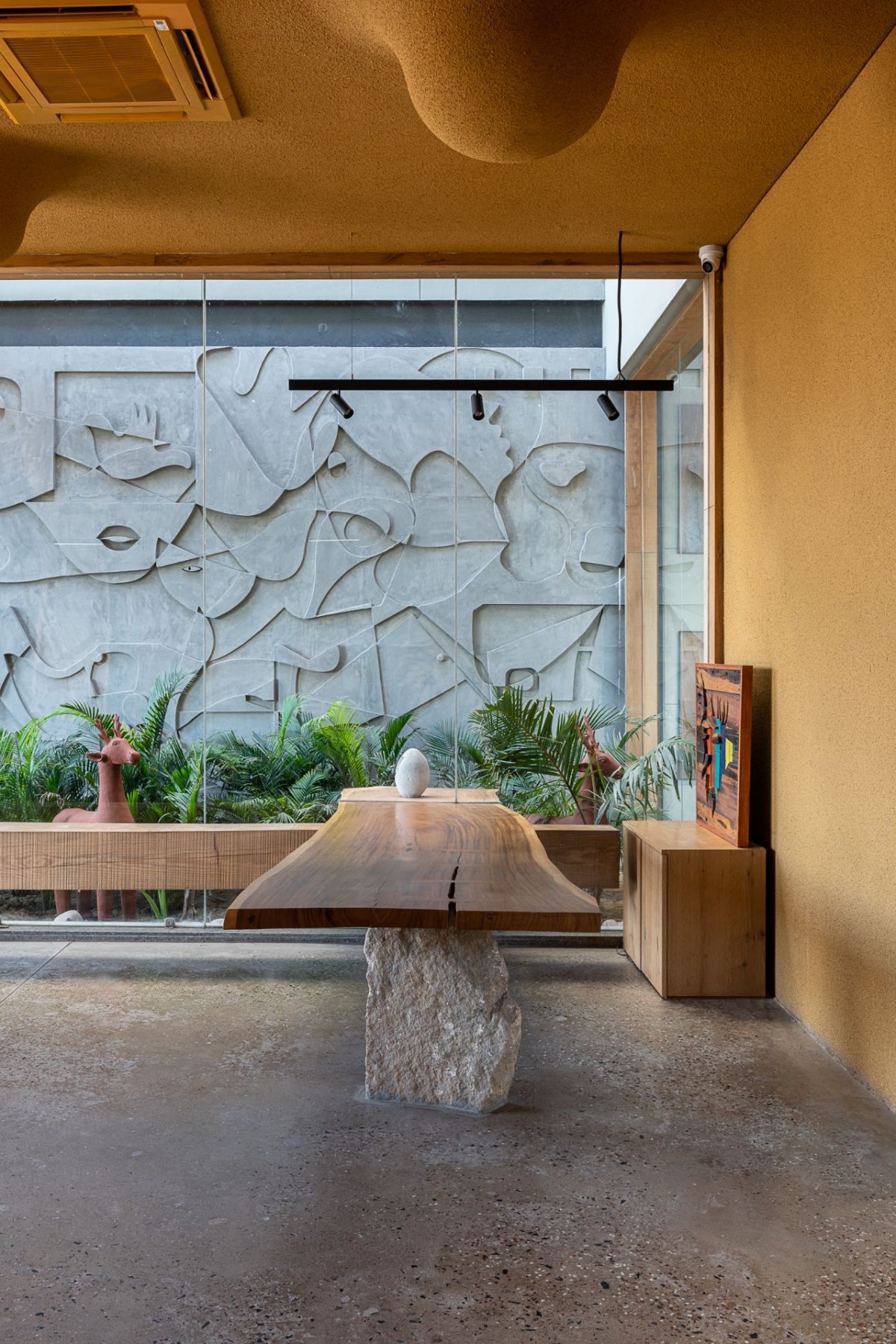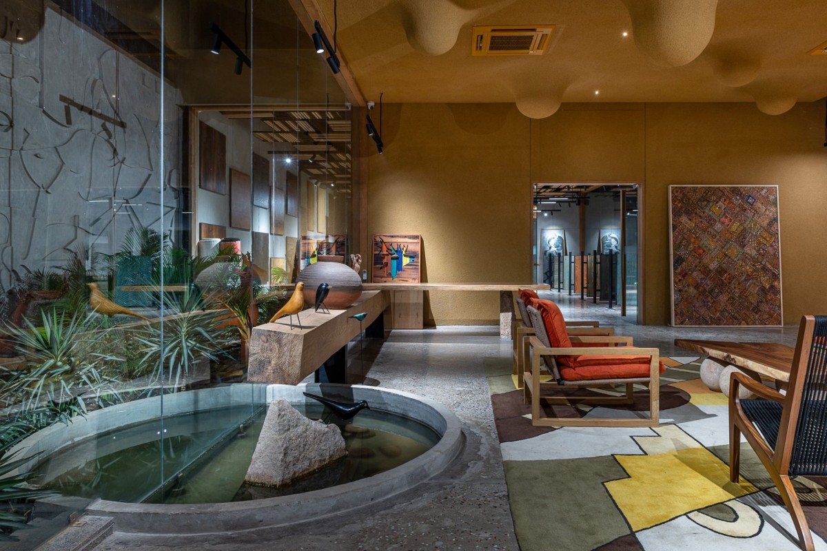 Step inside, and you are immediately cocooned in warmth and the sensorial atmosphere triggered by the characteristic textures of the materials. An inviting “outdoor” courtyard merges inside with lush greenery and a waterbody infused with koi fish and plants. This forms the focal point of the store, drawing the eye of the visitor inwards as they enter. Overhead, a striking ceiling design attracts the eye as well. With the color and texture mimicking sand dunes, the surface is sculpted into a series of softly-rounded drop-shaped forms, intensifying the reference to an undulating landscape. The welcome table is a huge wooden live log that is part of the courtyard and the interior space, thus merging the connections.