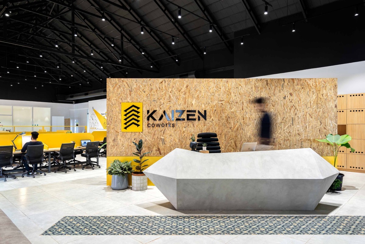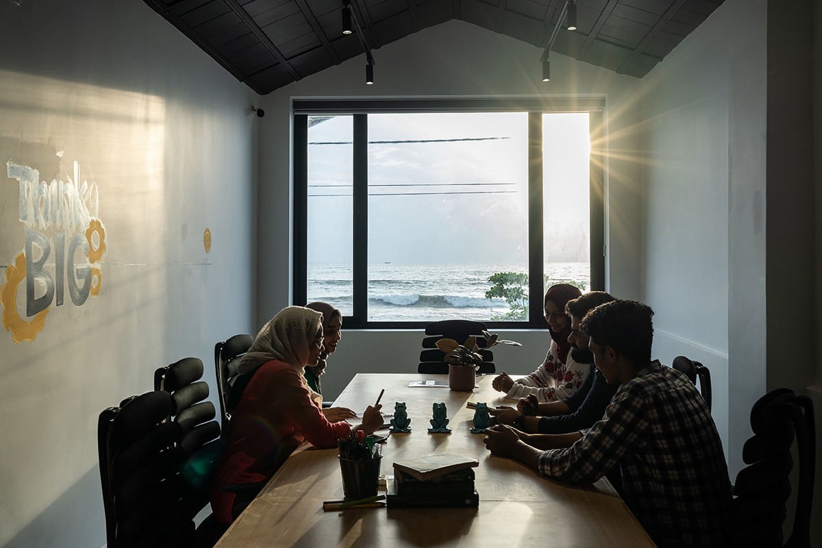The ground floor area will be a commercial space and the first floor is designed as the co-working space. As we enter the building there is an interesting stair room laid with pattern tiles which retained the existing colonial style handrail. The stairs bring you to an elegant reception in the upper level. Here, we find the main conference room to the right and the working space to the left. The major working space was arranged in an open layout providing a flexible space which can be put to multi-purpose functions. The double height roof structure brought in a greater volume to emphasize the openness and to bring a spacious working atmosphere. An informal working setting was created rather than a conventional composed office space. Adding to this, the colours and tones used present a cheerful and warm environment for the users. To create an open relaxing area, an additional balcony design was cantilevered without disturbing the exterior old structure. This will be a place to sit back and unwind between the busy working hours. The narrow corridor on the west is facing the beach and is used as a conference room with a greater view to the beautiful beach.