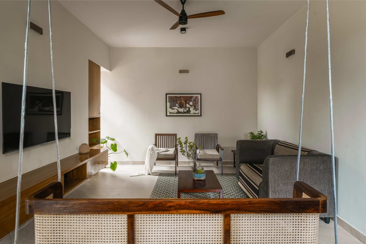 “Thirai” is a home crafted in response to a west-facing site bordered on three sides. The primary challenge was achieving diffused light and ventilation while protecting the interiors from severe western heat. The solution emerged through calibrated openings and shading strategies that admit breeze and soft light, yet keep the harsh sun out. Inside, the spaces flow freely into one another, with interconnected balconies that keep the family visually and spatially connected throughout the home.
