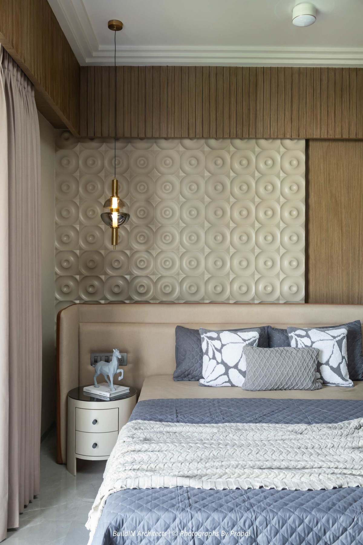A disciplined neutral palette defines this modern bedroom's elegance. The focal point is the headboard, a masterful blend of warm, linear-grained wood and a sophisticated 3D textured grey panel. Layers of soft grey textiles on the bed add comfortable depth. Sleek, floating nightstands maintain the minimalist aesthetic. A brass-accented pendant light provides a touch of polish. The design succeeds by layering contrasting textures within a serene, monochromatic scheme, creating a luxurious and tranquil retreat.