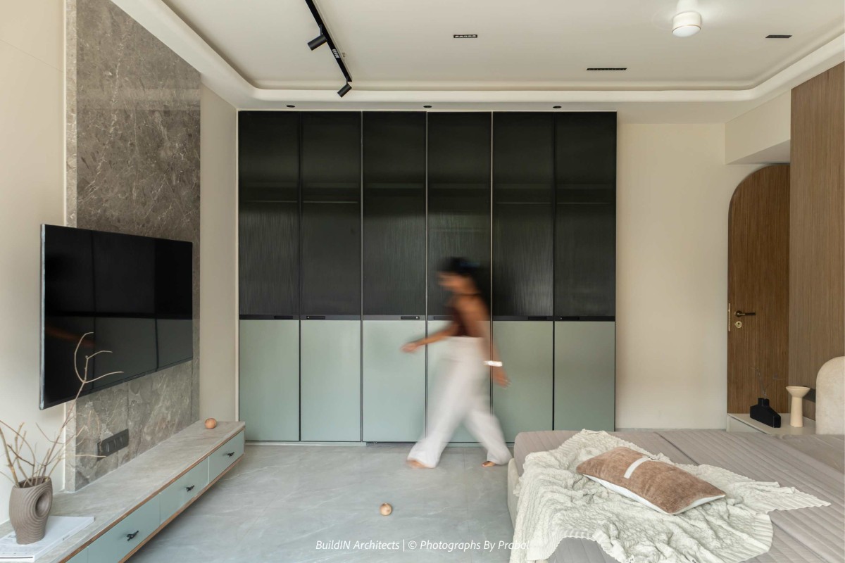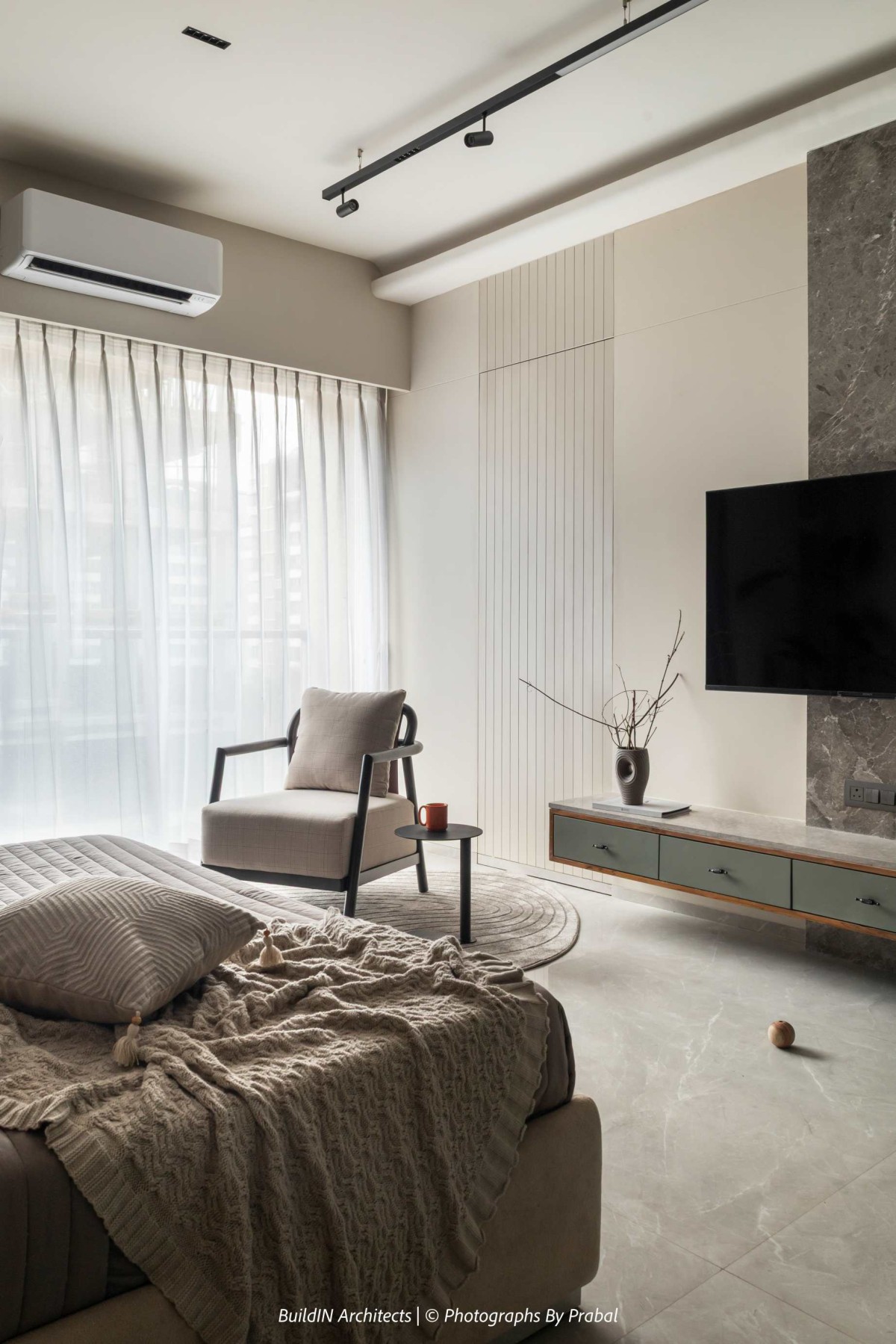 This bedroom embodies understated luxury through a seamless interplay of texture, tone, and form. A striking marble accent wall anchors the design, while warm wooden paneling adds depth and intimacy. The neutral palette—layered with taupe, beige, and muted greys—cultivates a soothing, cocoon-like ambiance. Soft furnishings and tactile textiles enhance comfort, as minimal furniture maintains visual lightness. Fluted details, a graceful archway, and a floating TV console lend architectural elegance, blending modern functionality with tranquil refinement. Natural light softly filters through sheer drapery, accentuating the material warmth and the room’s effortless sophistication.