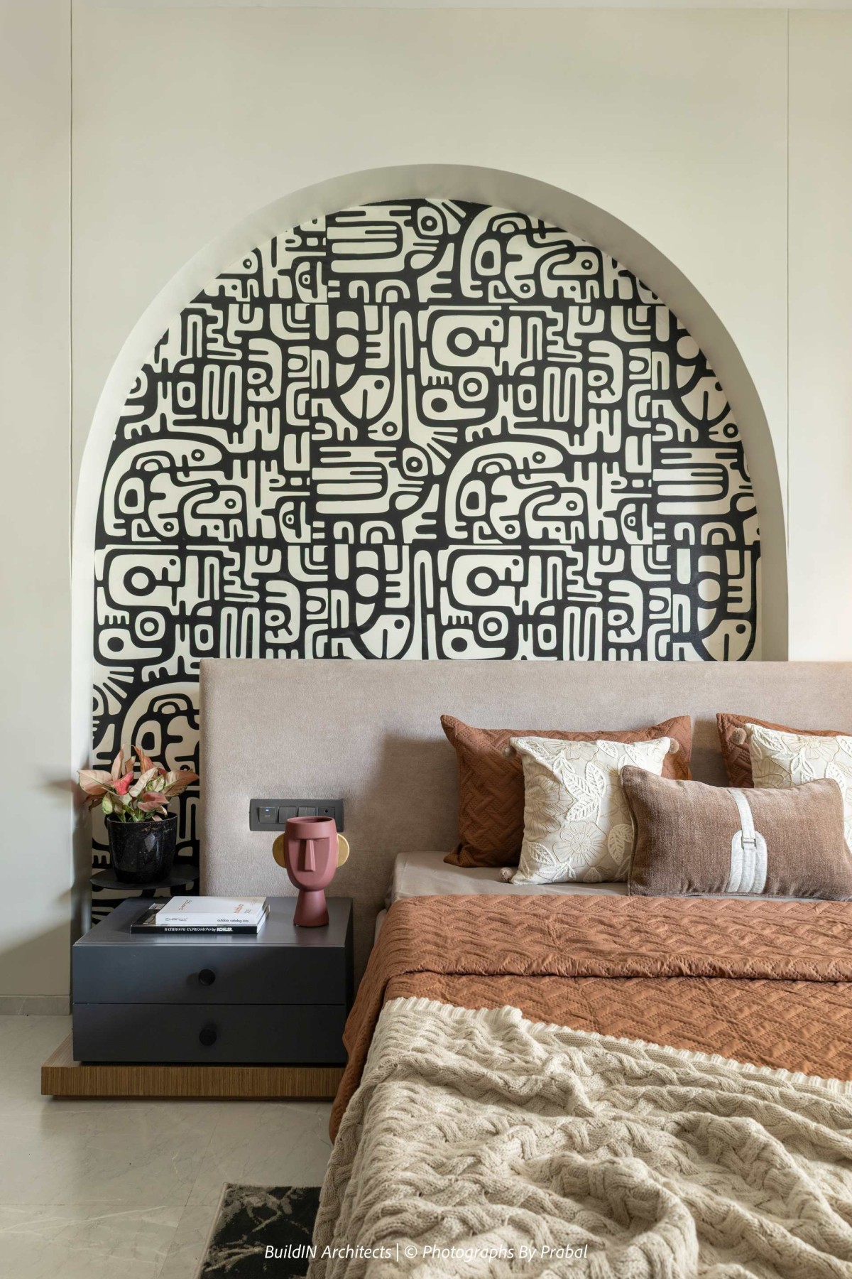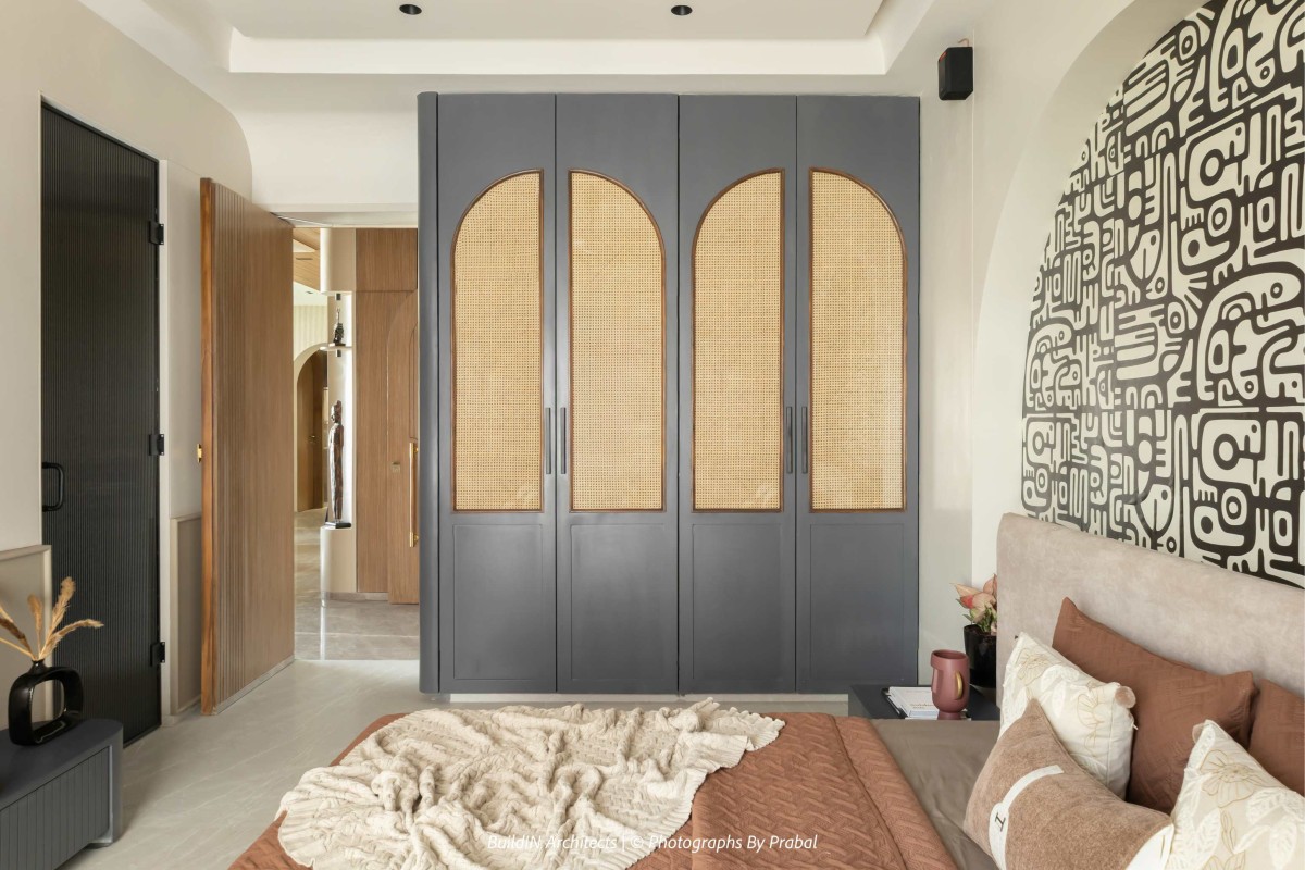 This bedroom celebrates Global Contemporary style, pairing bold graphics with tactile, organic materials. A grand recessed arch frames a striking black-and-cream abstract mural, anchoring the room in artistic energy. The taupe upholstered bed, layered with terracotta, burnt orange, and chocolate-toned bedding, offers plush comfort, complemented by a rattan pendant that adds handcrafted warmth. Opposite, matte charcoal cabinetry with inset cane panels transforms storage into sculptural artistry. Even functional corners, like the floating desk with curved detailing and turned spindles, embody design intent. The result is a lively, sophisticated sanctuary where global influence and modern form coexist beautifully.