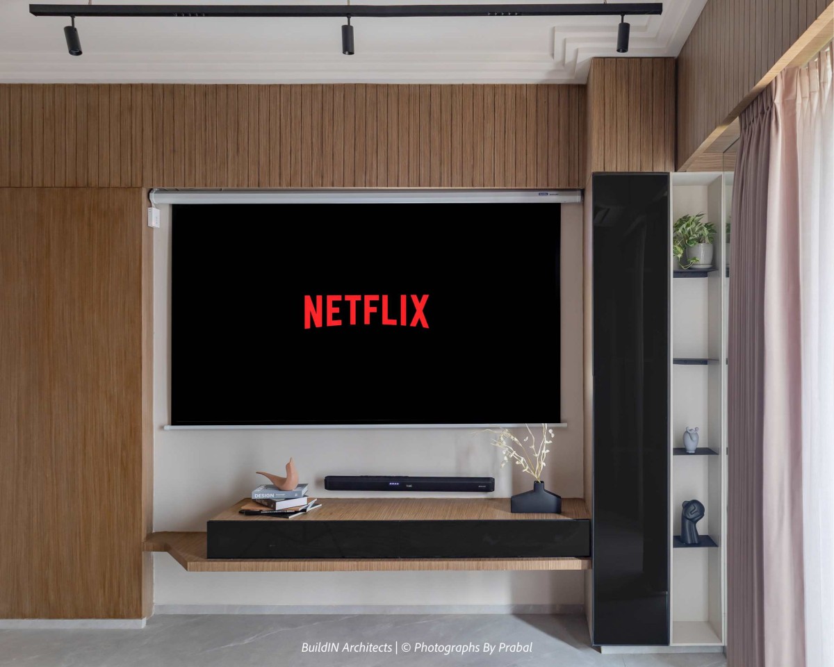 Floating shelves and minimal decor introduce balance and lightness, ensuring the design remains uncluttered and sophisticated. More than just a media zone, this composition becomes an interior feature—a statement of modern luxury and refined material harmony that anchors the living space with quiet confidence.