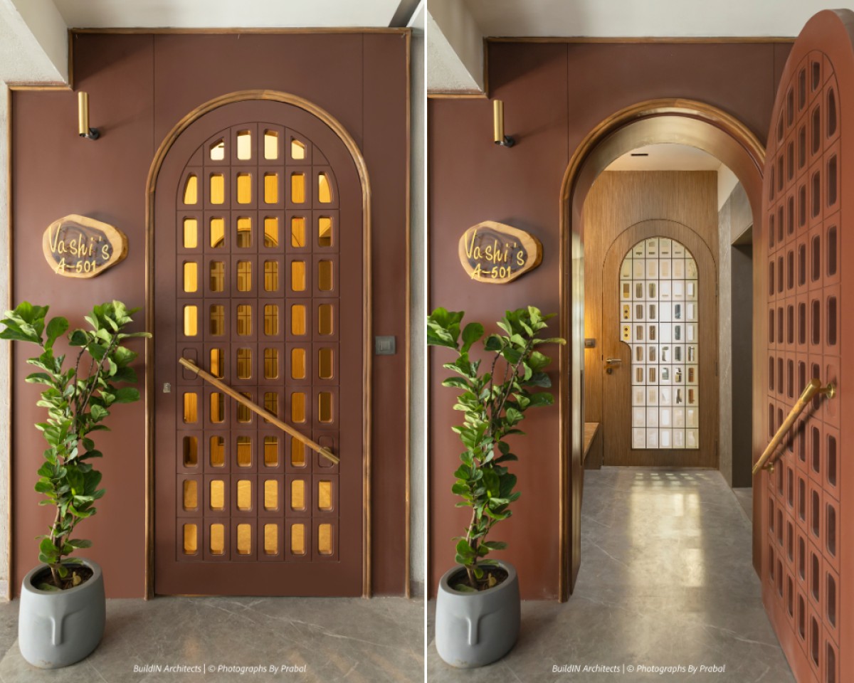 Finished in a matte wine tone with brass accents, the door exudes refined Indian luxury—where richness meets restraint. A wooden nameplate and lush planter soften the composition, grounding it in tropical minimalism. The result is a transitional statement that bridges heritage and modernity, setting the tone for the serene interiors beyond.