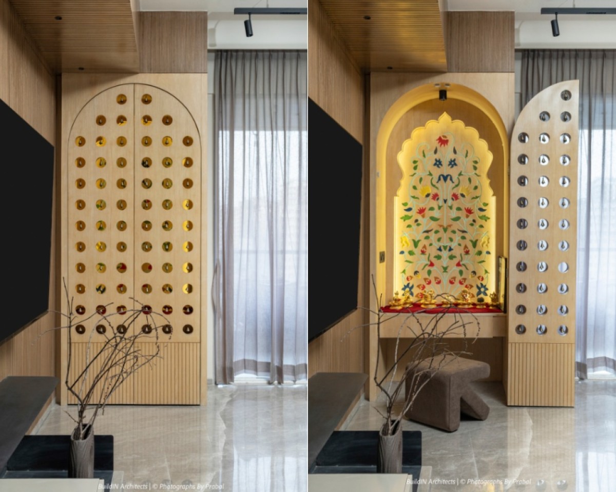 Crafted in light natural wood, the unit seamlessly blends into its contemporary surroundings. When opened, it reveals a hand-painted floral backdrop inspired by Indian traditional artistry, softly illuminated with warm backlighting that enhances its divine presence.