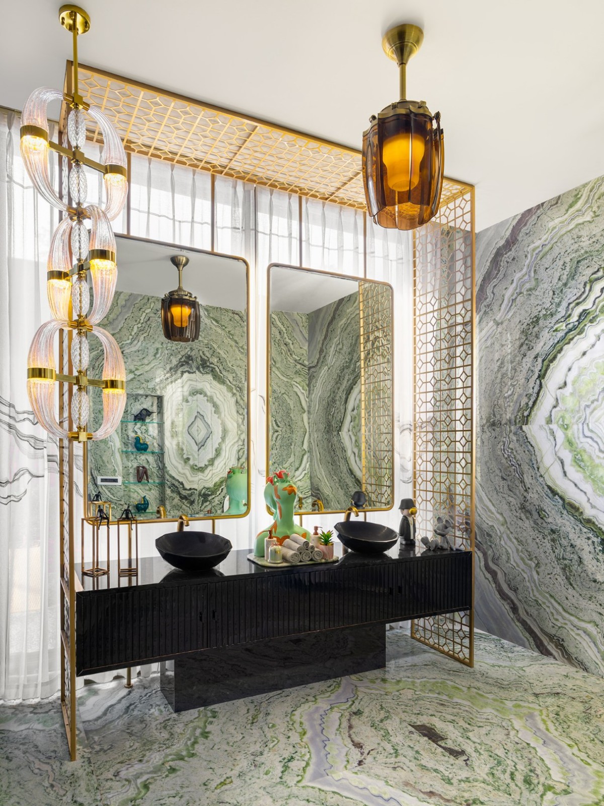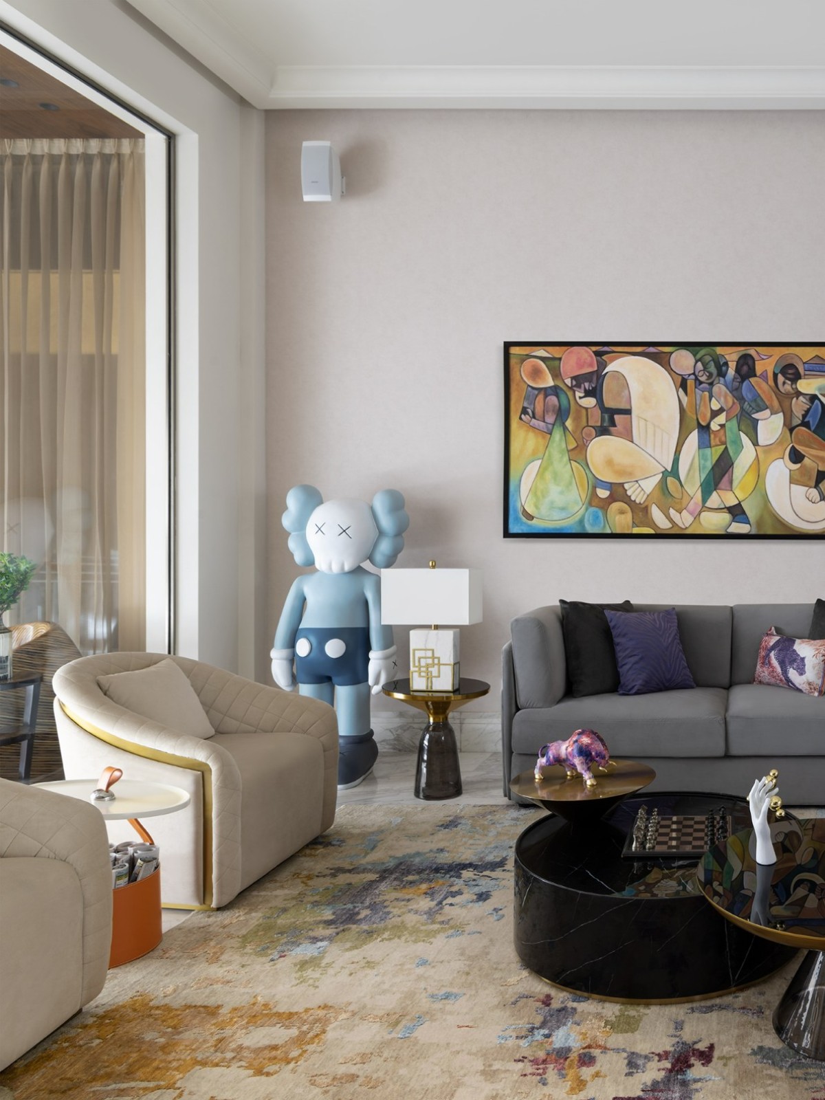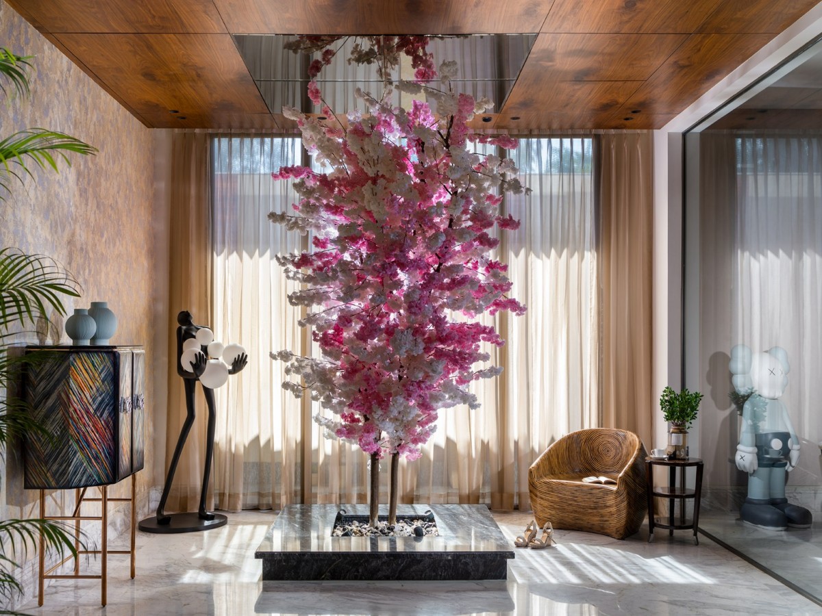 A preserved cherry blossom tree from the original farmhouse anchors the home with memory and meaning. Neutral tones are elevated with gold accents, plush furniture, and bespoke pieces—a Hermes artwork here, a veined marble dining table there.