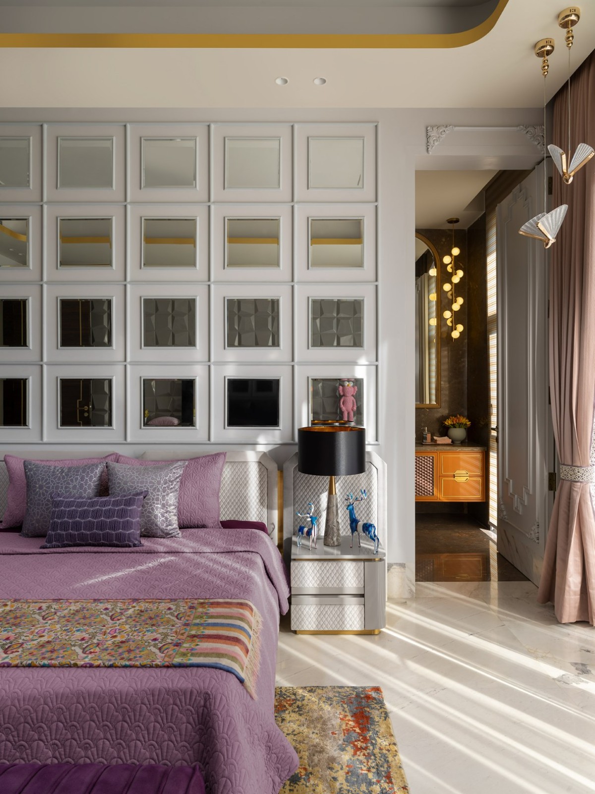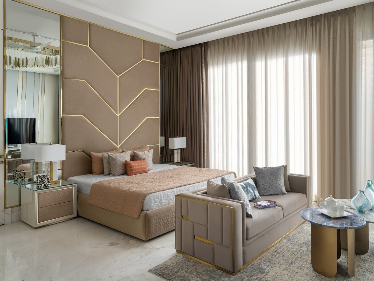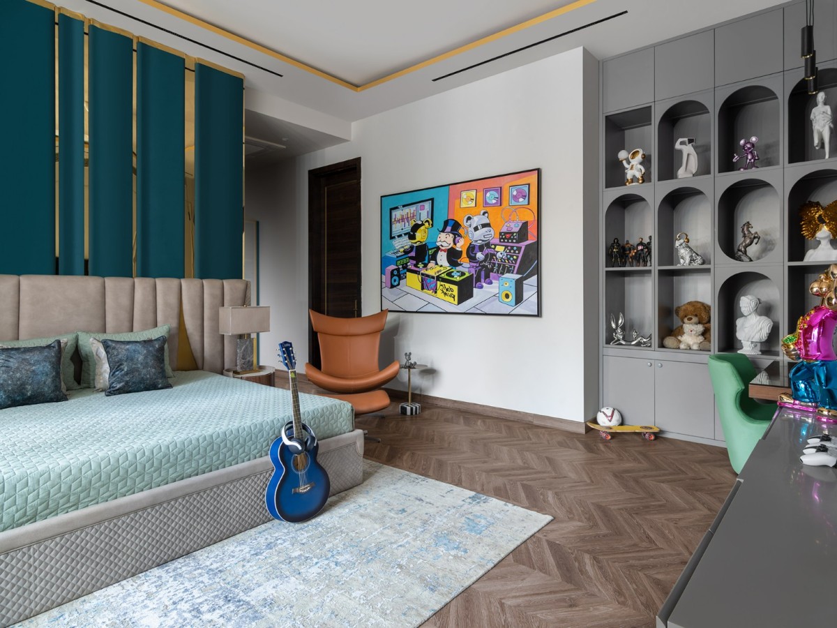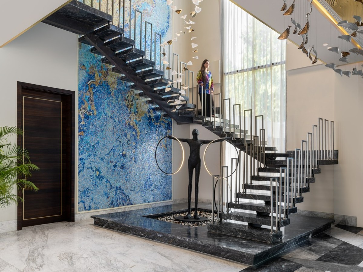 The staircase, flanked by a mosaic wall, leads to serene upper rooms. The master suite, in beige and powder blue, glows with natural light and includes a bath and dressing area where suspended mirrors and brushed gold finishes blur the line between design and dream. Every detail in Tranquil Verde is intentional—an effortless blend of light, landscape, and legacy. True to Attico Homes’ philosophy, this is not just a residence, but a sanctuary crafted with heart and individuality.