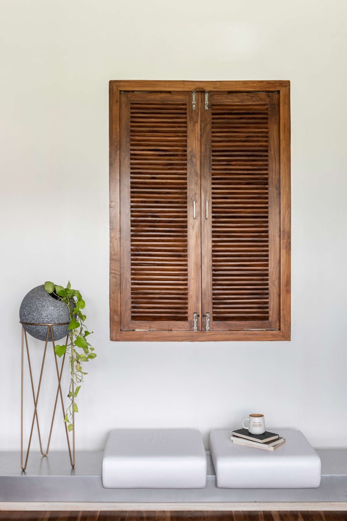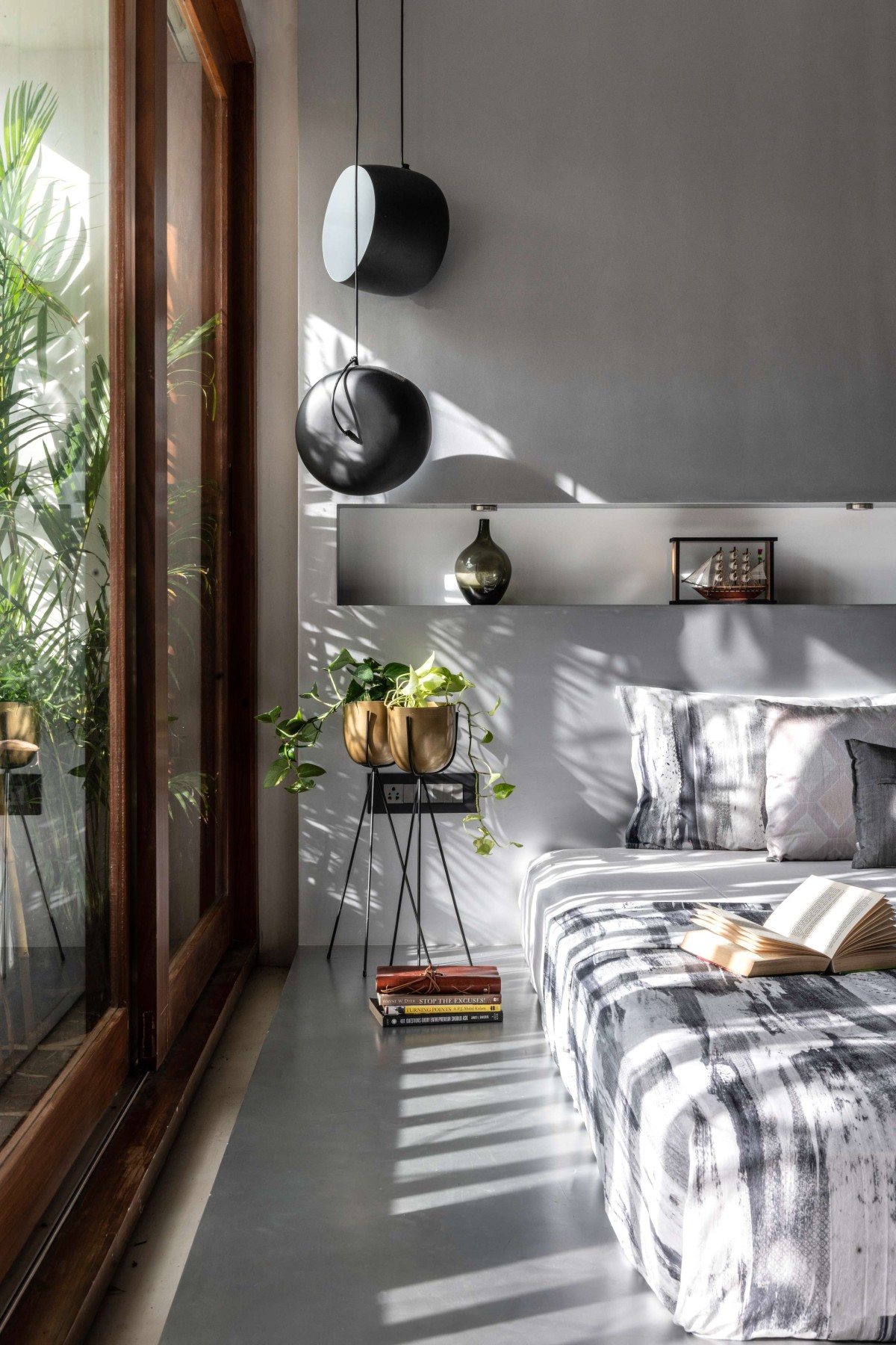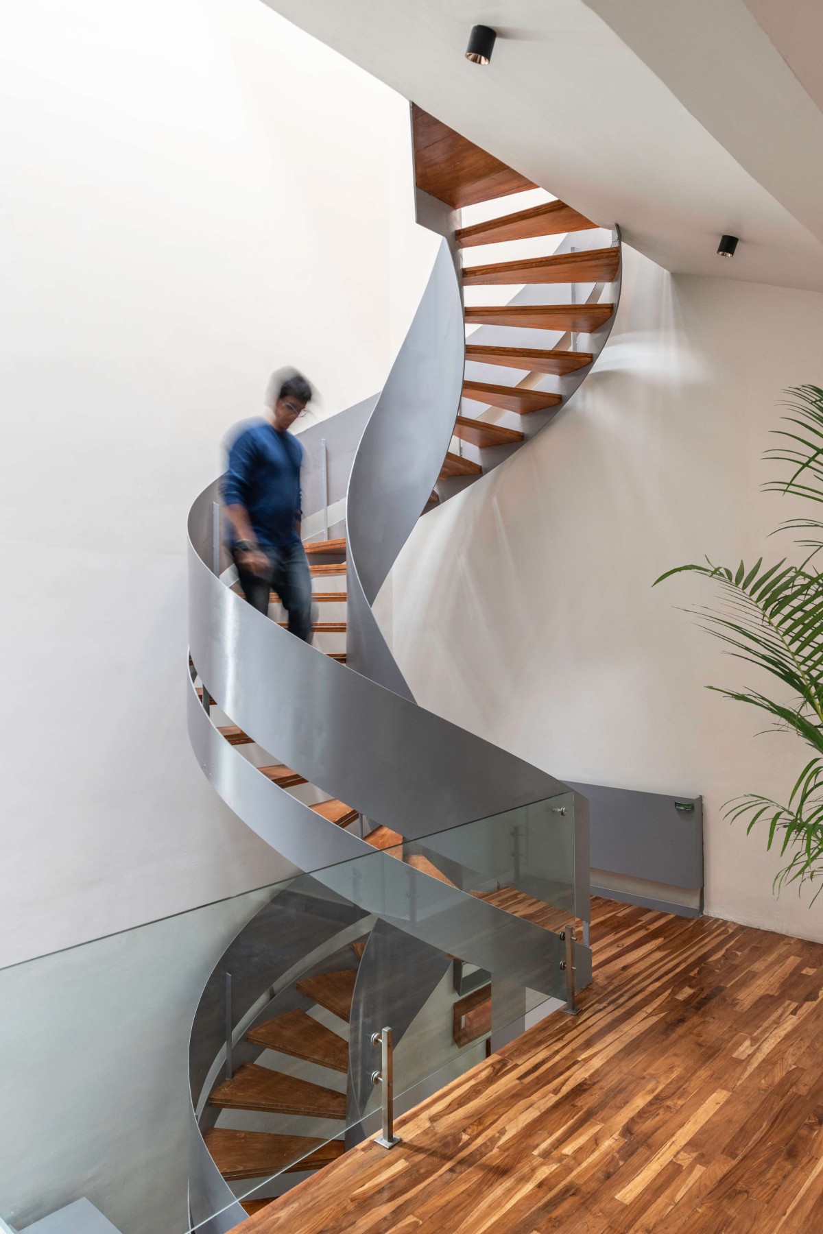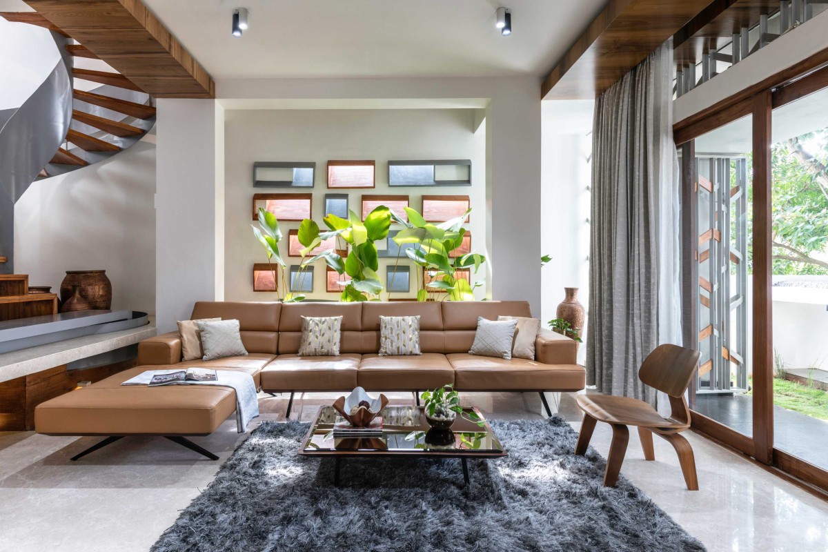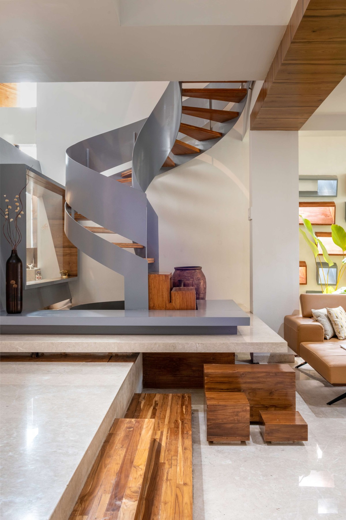 In harmony with the lines and patterns of the puja room, the stairs spiral upwards into the ethereal aesthetic of the skylight. The staircase sits on a marble platform with an M.S ring. The void from which it emerges is filled with pebbles to add a complementary texture to the space and to create a sense of continuity amongst the other pockets created in the house. Bent M.S. sheet profiles circumscribing the staircase act as supports. Each step is an M.S sheet wrapped with timber on both sides. The melamine polished timber and the M.S sheets with a duco finish complement and balance each other's colours in resonance with the rest of the house. As the client was not too keen on having many or even a large skylight, the design thus includes lots of opening in the walls at various levels to create a stunning play of light while framing the views around the house.