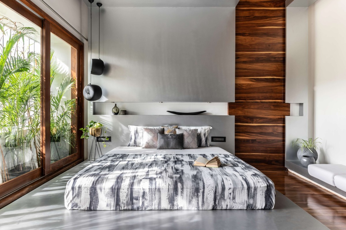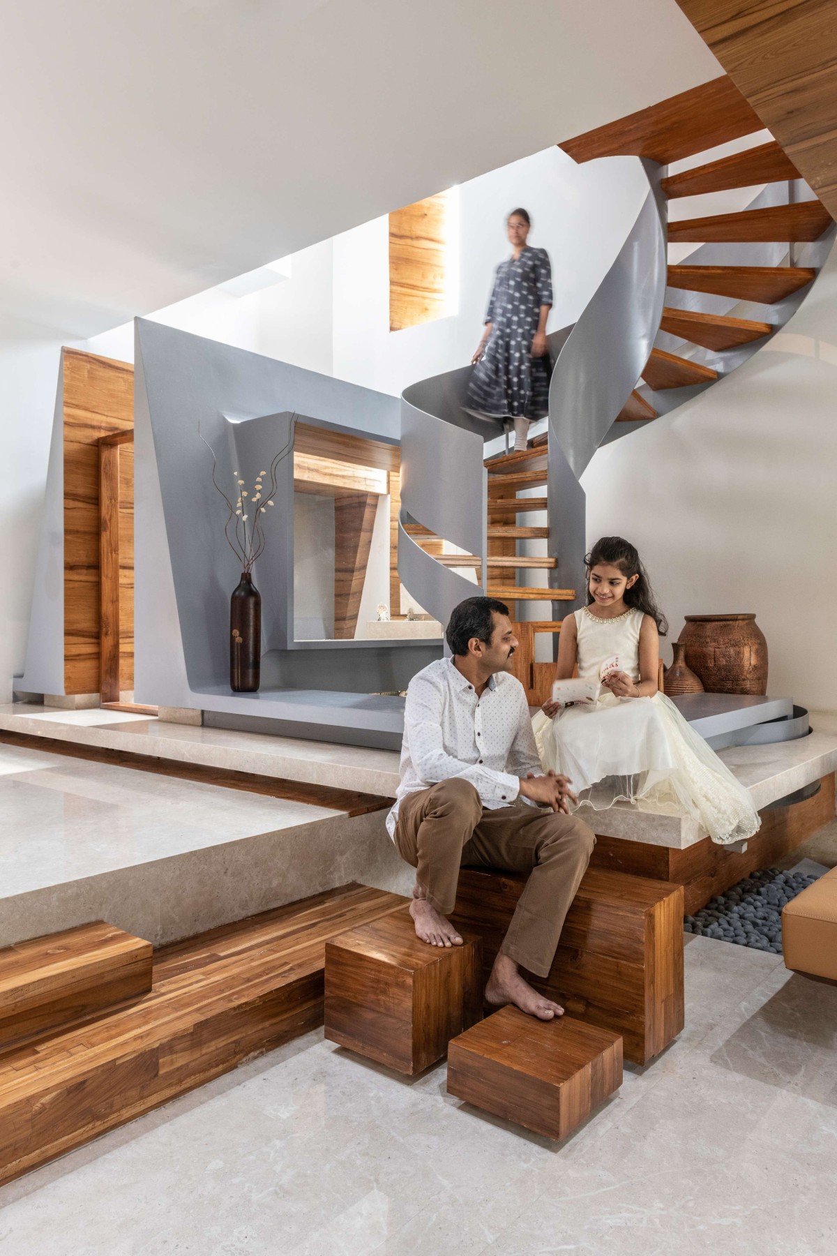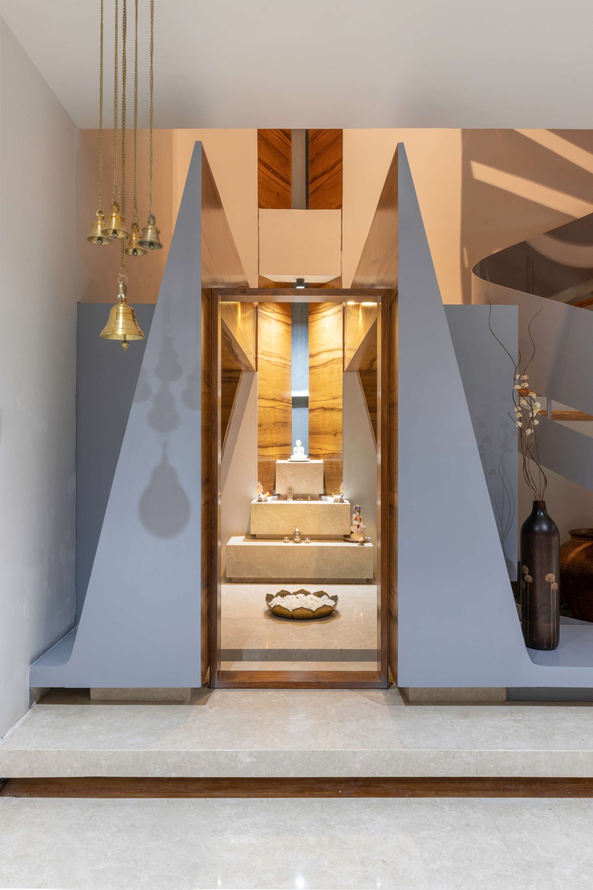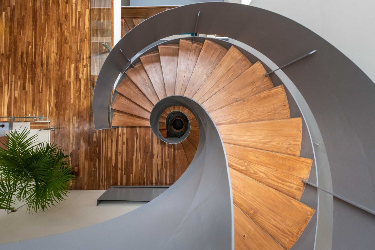The kitchen, though open in nature, remains highly efficient with a store room and utility tucked away behind. The puja room is accentuated with minimal wooden accents and bold angular elements that add a strong character while retaining the calmness and serenity of the space. The form adapted is inspired by the folding hands of a devotee and a low entrance is designed to ensure that one bends as they enter the puja room. This design principle is seen in ancient temples where the door frame is lowered to ensure that the devotees bend and enter, in a respectable fashion. The highlight of the entire space is winding spiral staircase which is sure to catch the attention of anyone who walks into the home. The staircase is placed in a “staircourt”- a niche curved out in the middle of the house to place this highlight element that not only connects the home functionally but aesthetically as well. The court adjacent to the puja room embraces and augments the base of the stairs.