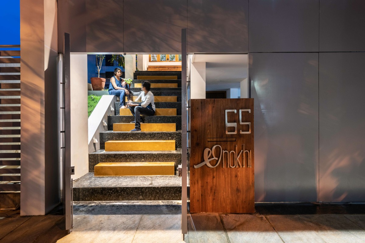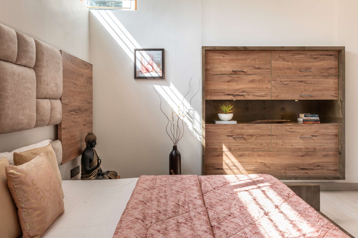 The parking and a 2BHK rental unit is placed on the ground floor. The duplex is spread over two floors where the lower floor accommodates the more social spaces like the dining, living etc, the upper floor is completely private in nature. The stairs that take one to the entrance of the house are wide and vibrant which act as informal seating to enjoy quiet moments under the lush trees. The lotus bond with a bright yellow planter and a tranquil Buddha statue act as a buffer and create a welcoming ambiance. The large, open living space is inviting and luxurious and gives one a glimpse of the beautiful landscape that is carefully integrated into the living spaces.