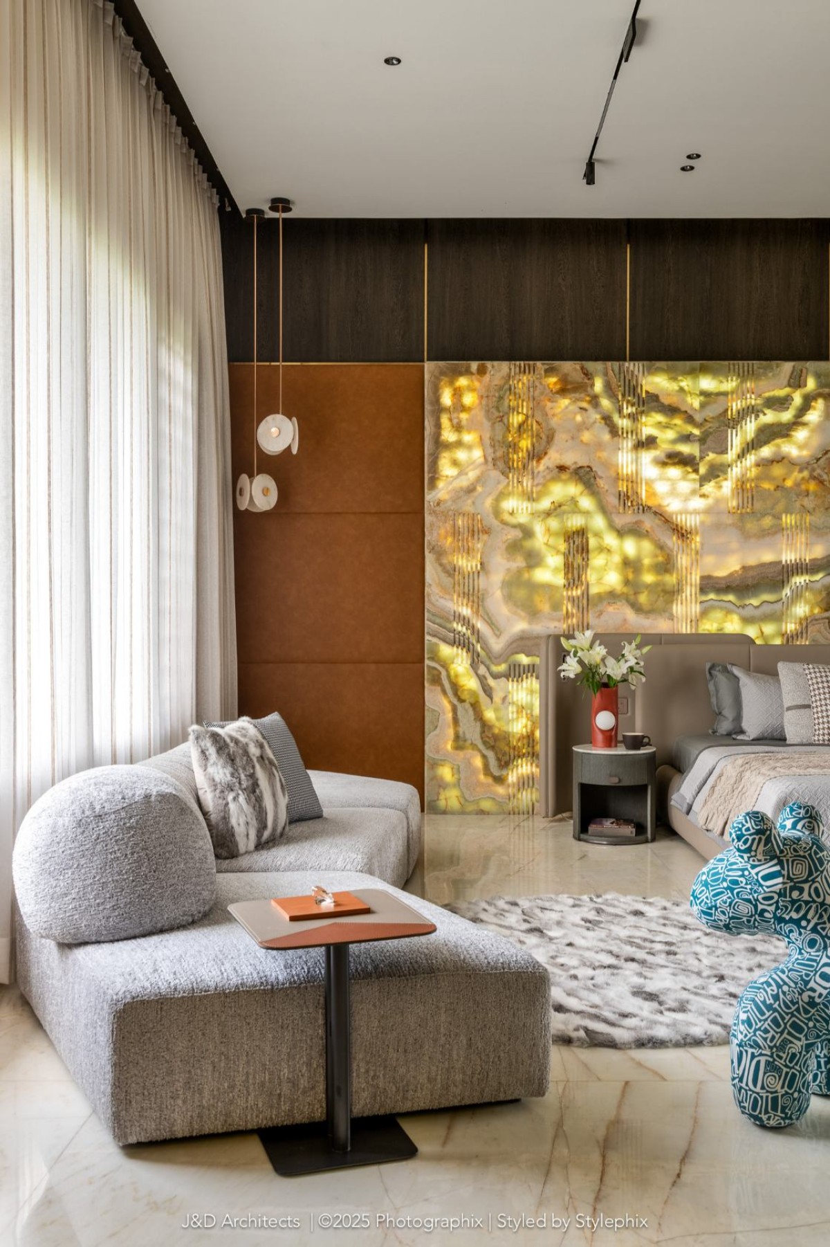 The journey into this luxurious masterpiece begins through the parking with a gentle transition leading towards to the verandah, where a sense of serenity unfolds. A magnificent stone wall etched with Radha Krishna sets a sacred tone, while opposite, a soaring double-height RCC pardi bears a delicate tree engraving—celebrating nature and divinity, grounding the space in spiritual and architectural grace.
